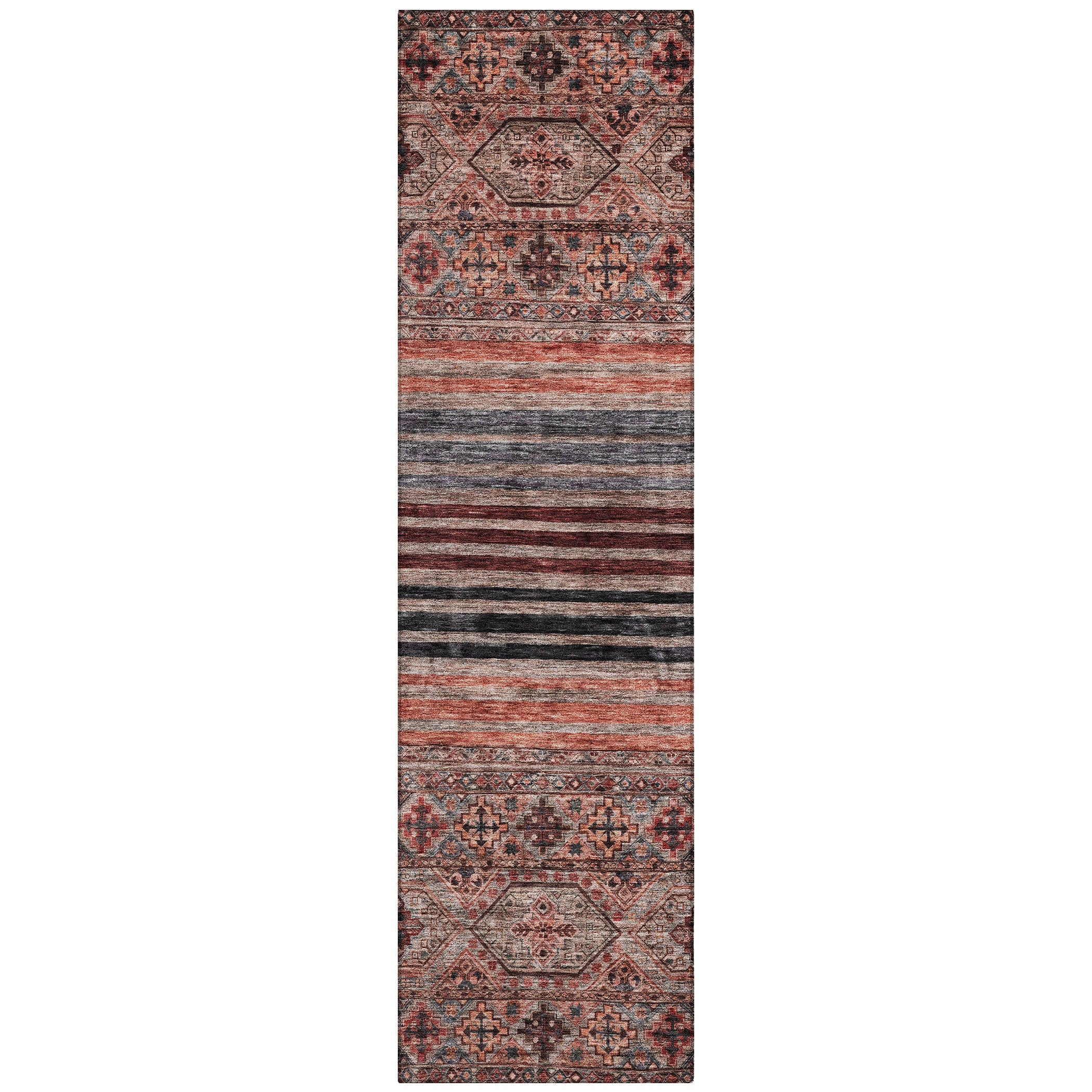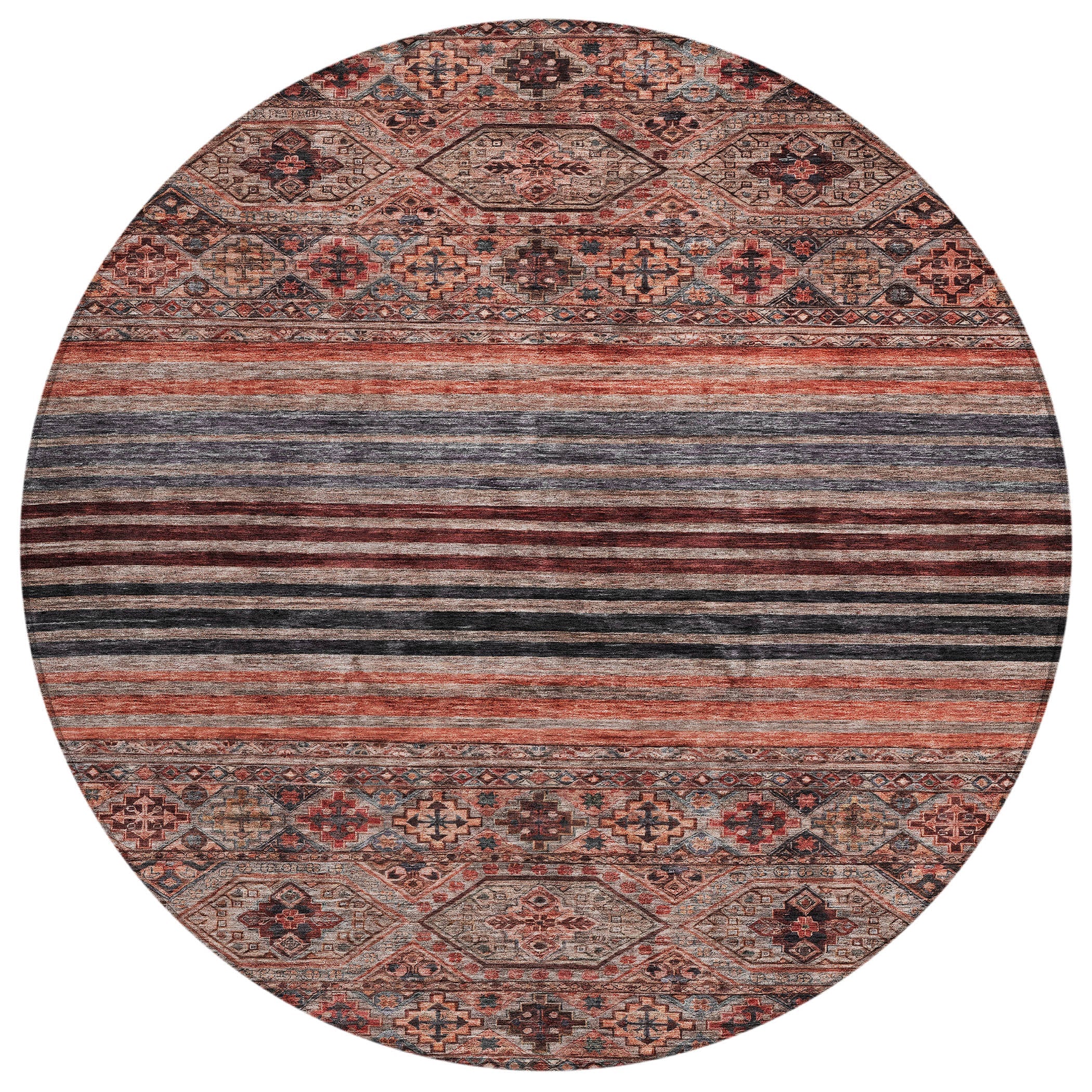 Featuring center stripes and a classical diamond pattern, this transitional rug offers a sophisticated and versatile design for any room. The blend of stripes and diamonds adds a touch of elegance and refinement that complements a variety of decor styles. UV stabilized for durability, this rug is suitable for both indoor and outdoor environments, preserving its chic look over time. The ultra-thin profile allows for smooth placement under furniture, and it’s machine-washable for convenient upkeep. Family and pet-friendly, this rug combines traditional charm with practical benefits.