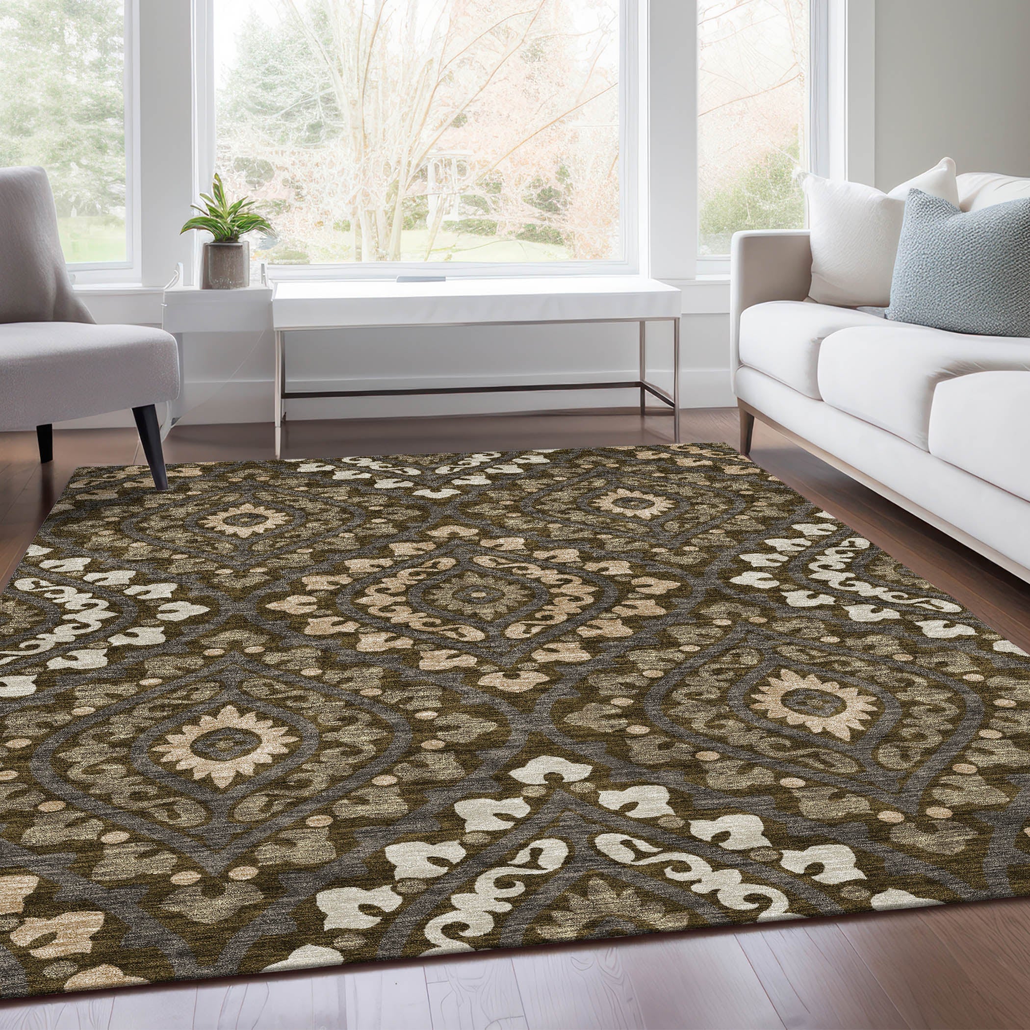 Chantille ACN761 Fudge, a transitional rug that effortlessly combines contemporary elegance with classic charm. Featuring modern diamond medallions with intricate detailing, this rug offers a sophisticated touch to any space. The diamond pattern adds a modern twist, making it a versatile addition to your decor.