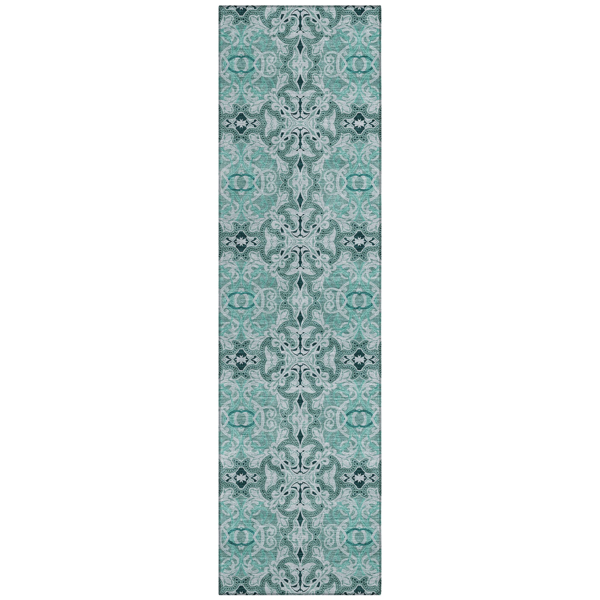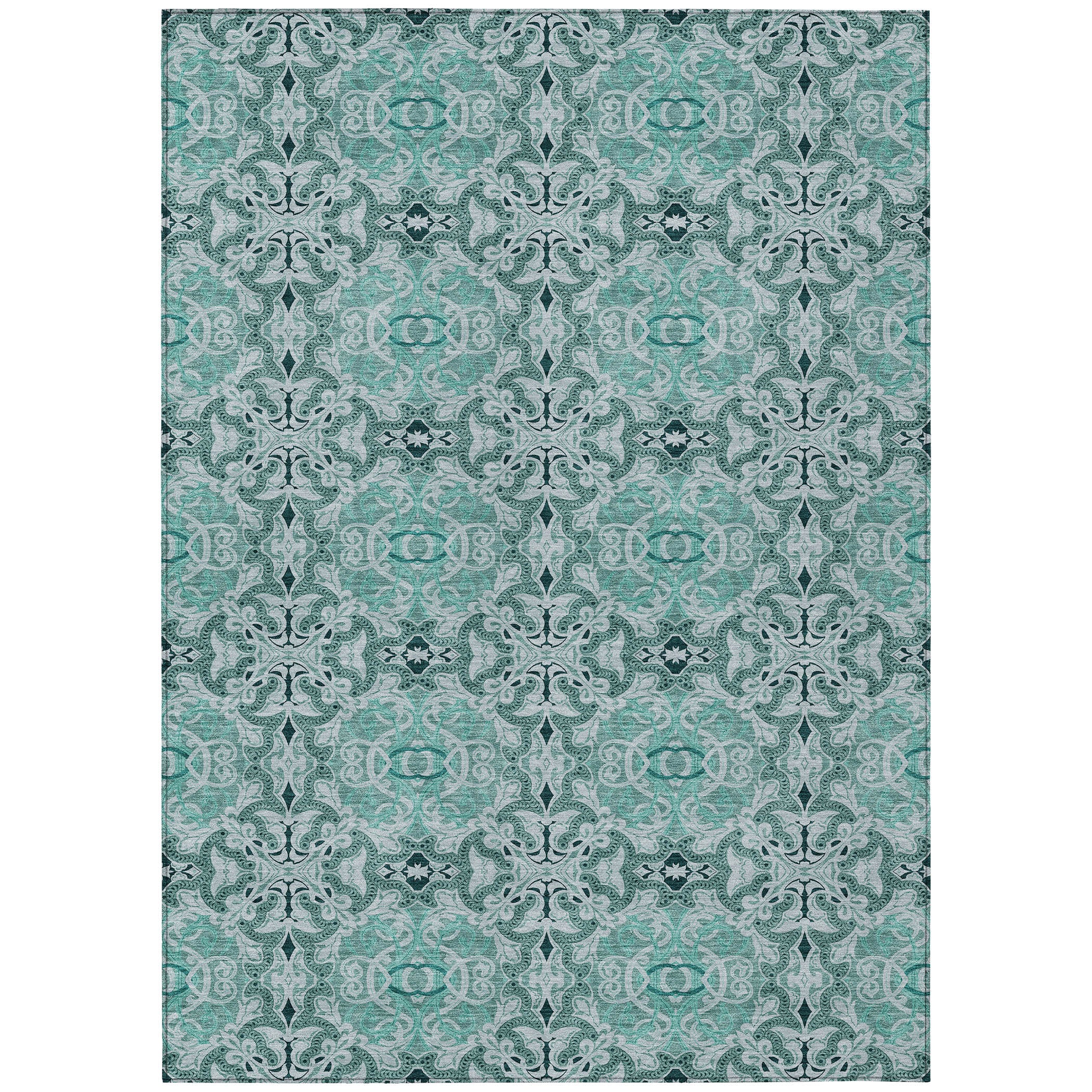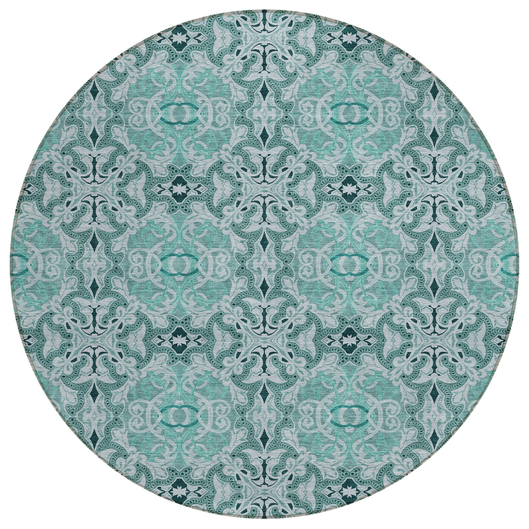 Chantille ACN783 Teal rug, a stunning addition to any home decor. Its unique design showcases an array of medallions meticulously arranged to form a harmonious pattern, perfect for both modern and traditional interiors. This versatile piece is UV stabilized, making it suitable for indoor and outdoor use. The ultra-thin construction allows for easy integration into any space, while its machine-washable feature ensures effortless maintenance.
