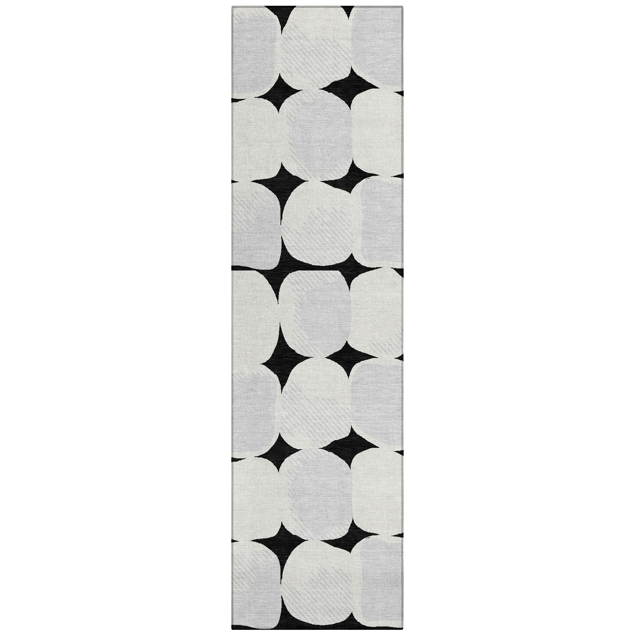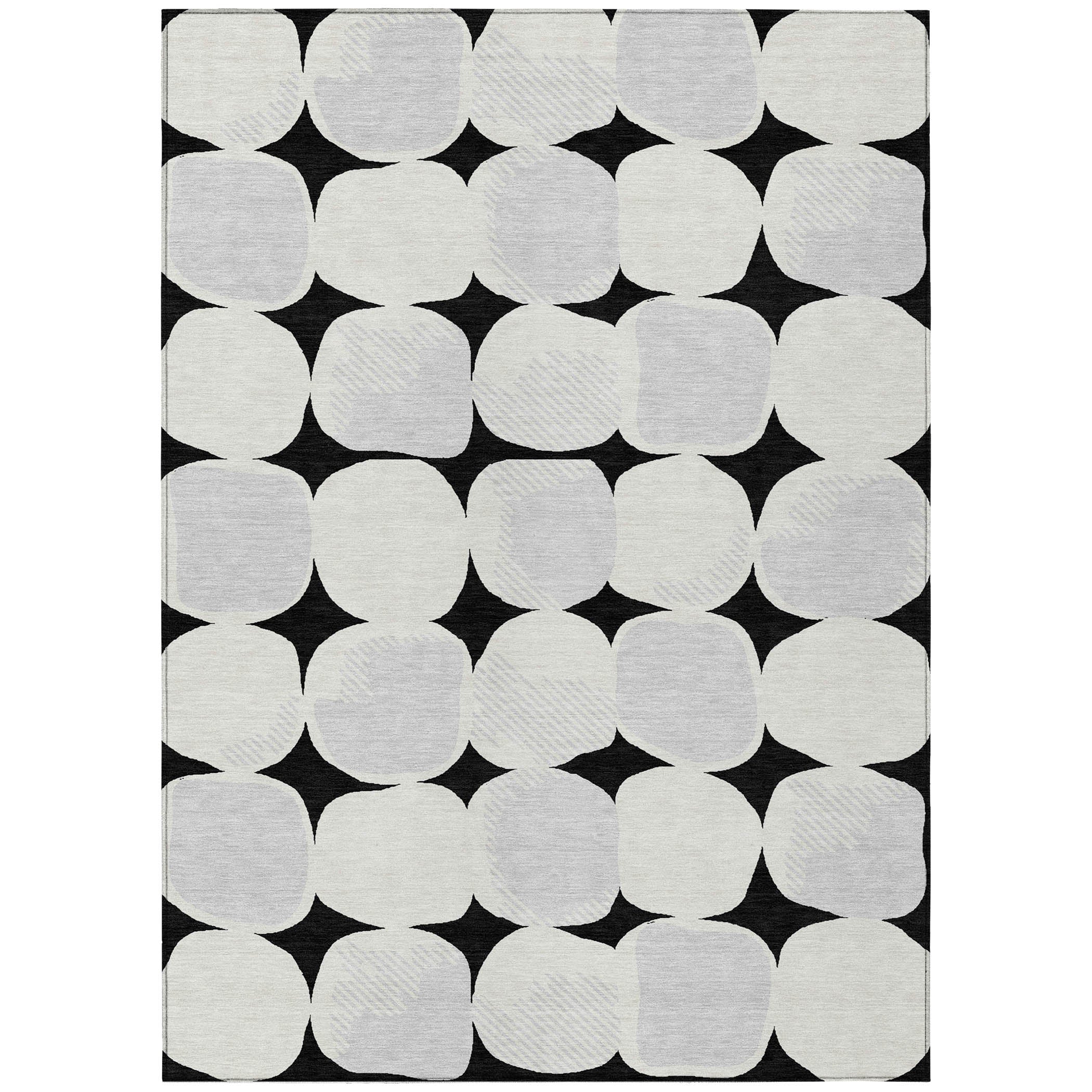 Elevate your home ambiance with the Chantille ACN870 Black area rug. Its striking design showcases large stone-shaped circles in a seamless pattern, ideal for imparting a transitional and cohesive feel to any room. The circular motif brings a sense of serene sophistication to your interior decor, making it a standout piece.