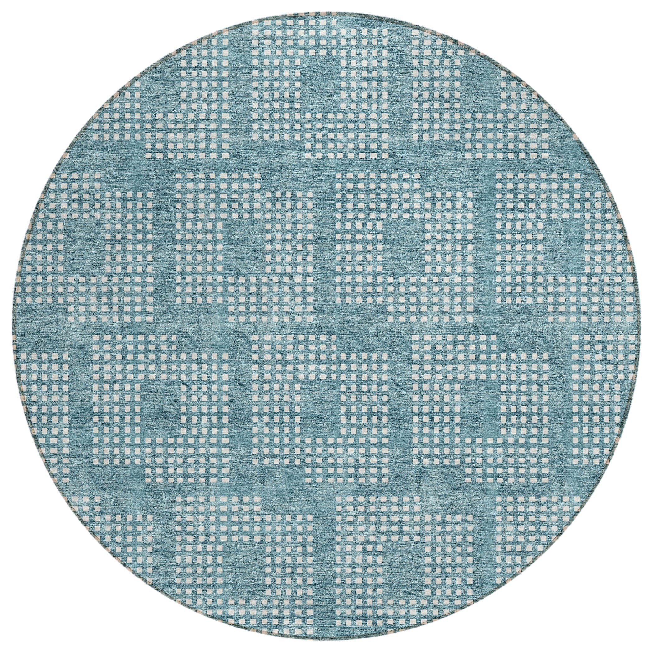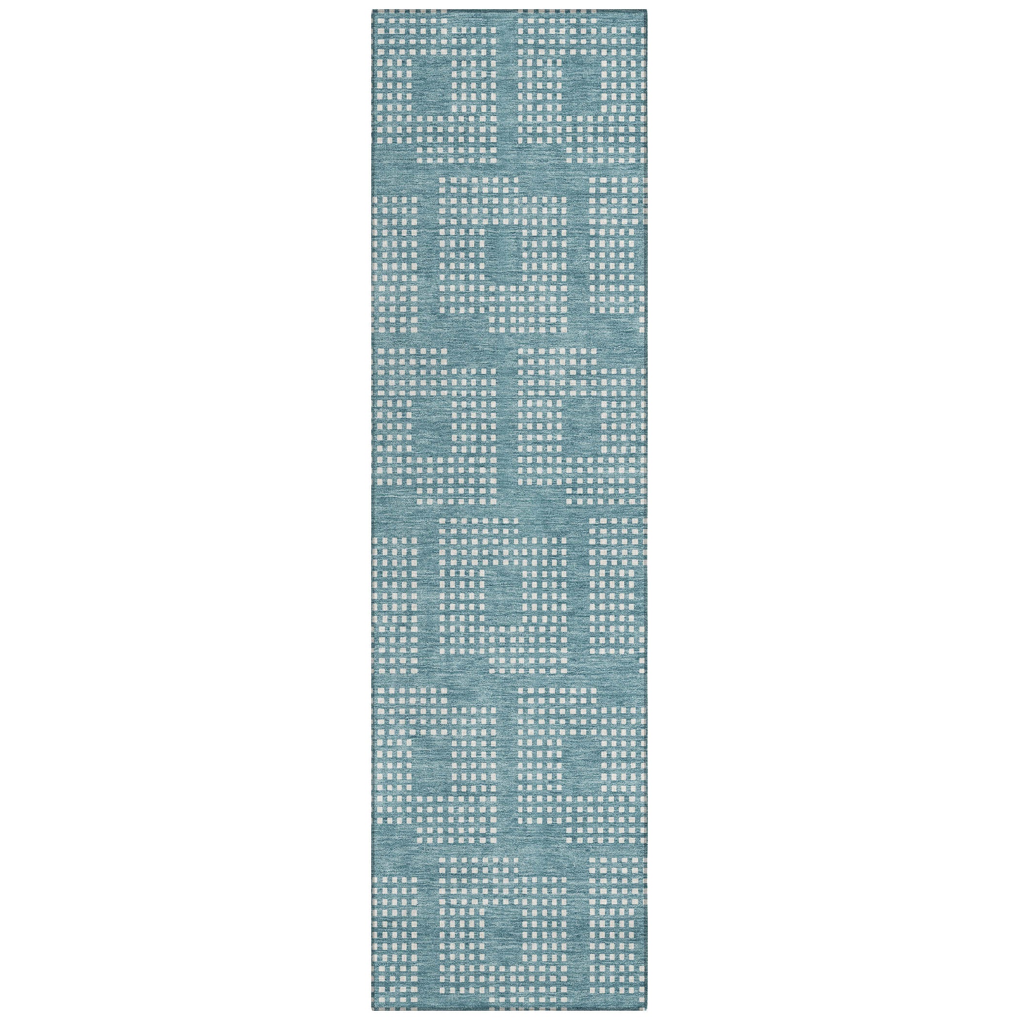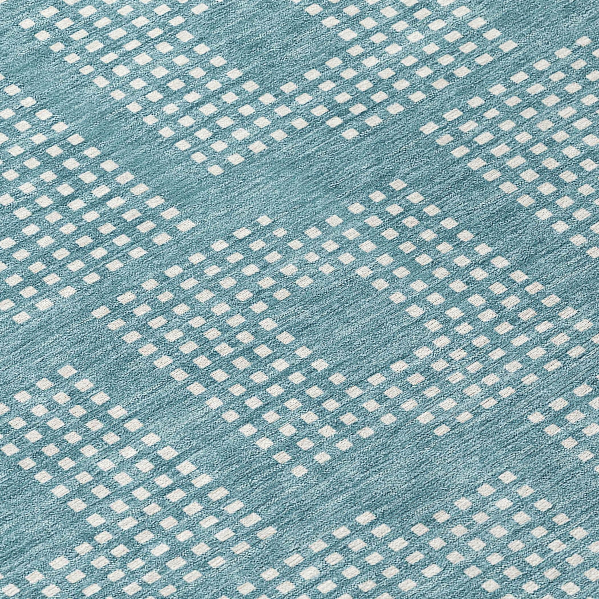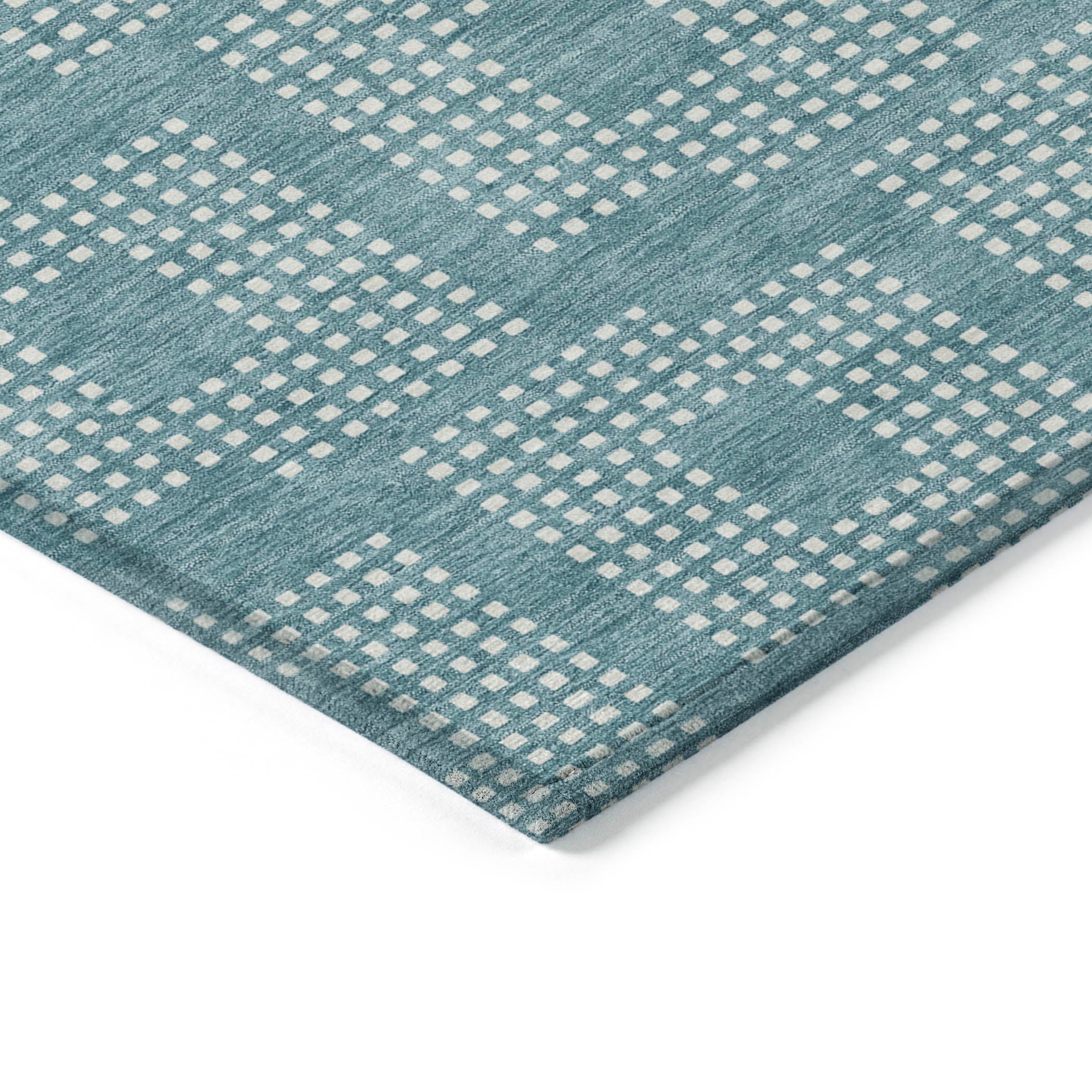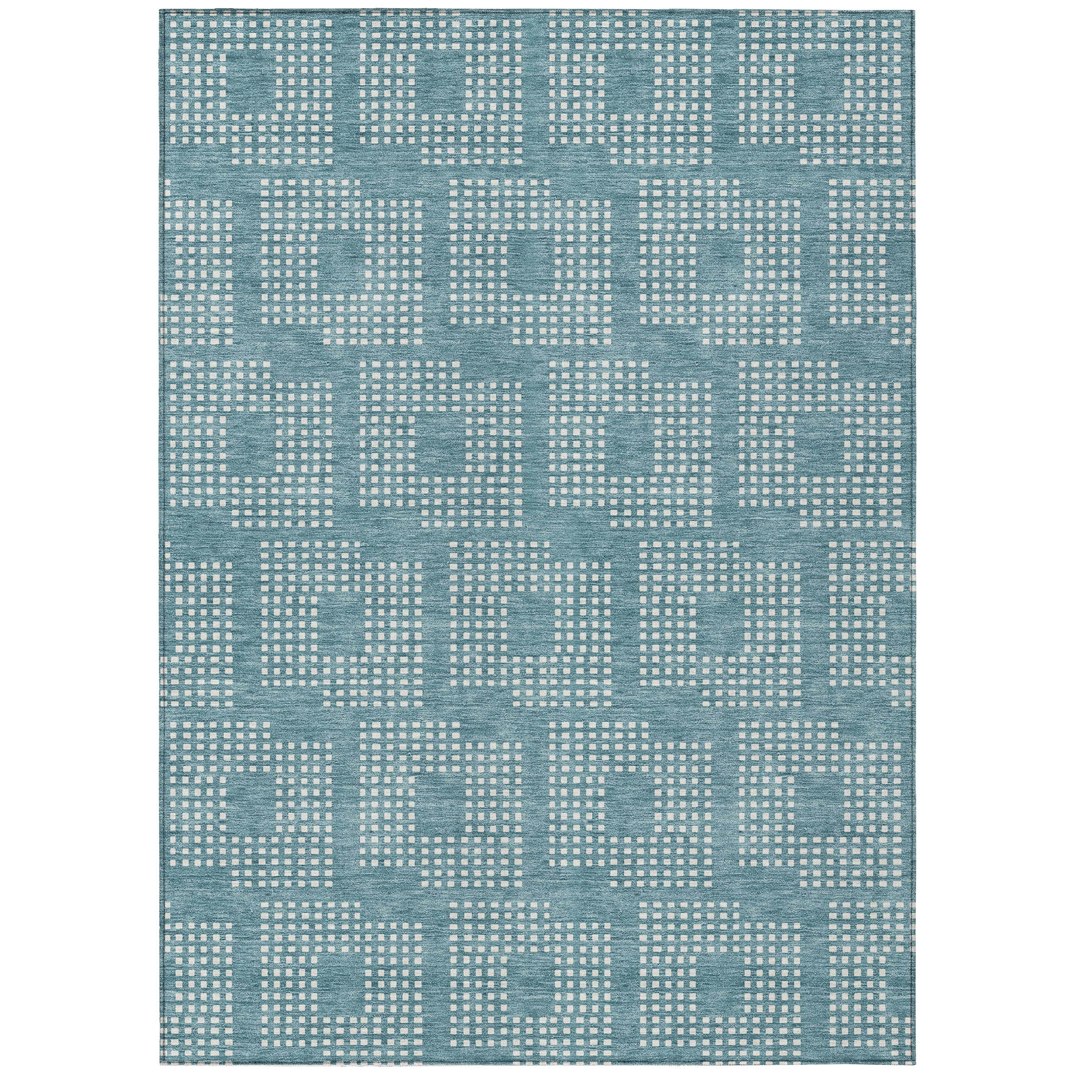 Chantille ACN890 Teal area rug, a perfect blend of geometric elegance and practicality. The intricate design features tiny squares meticulously arranged to form a larger square, creating a stunning pattern that seamlessly fits into any style of decor. The repetitive square motif brings a sense of symmetry and harmony to your space, enhancing the overall aesthetic.