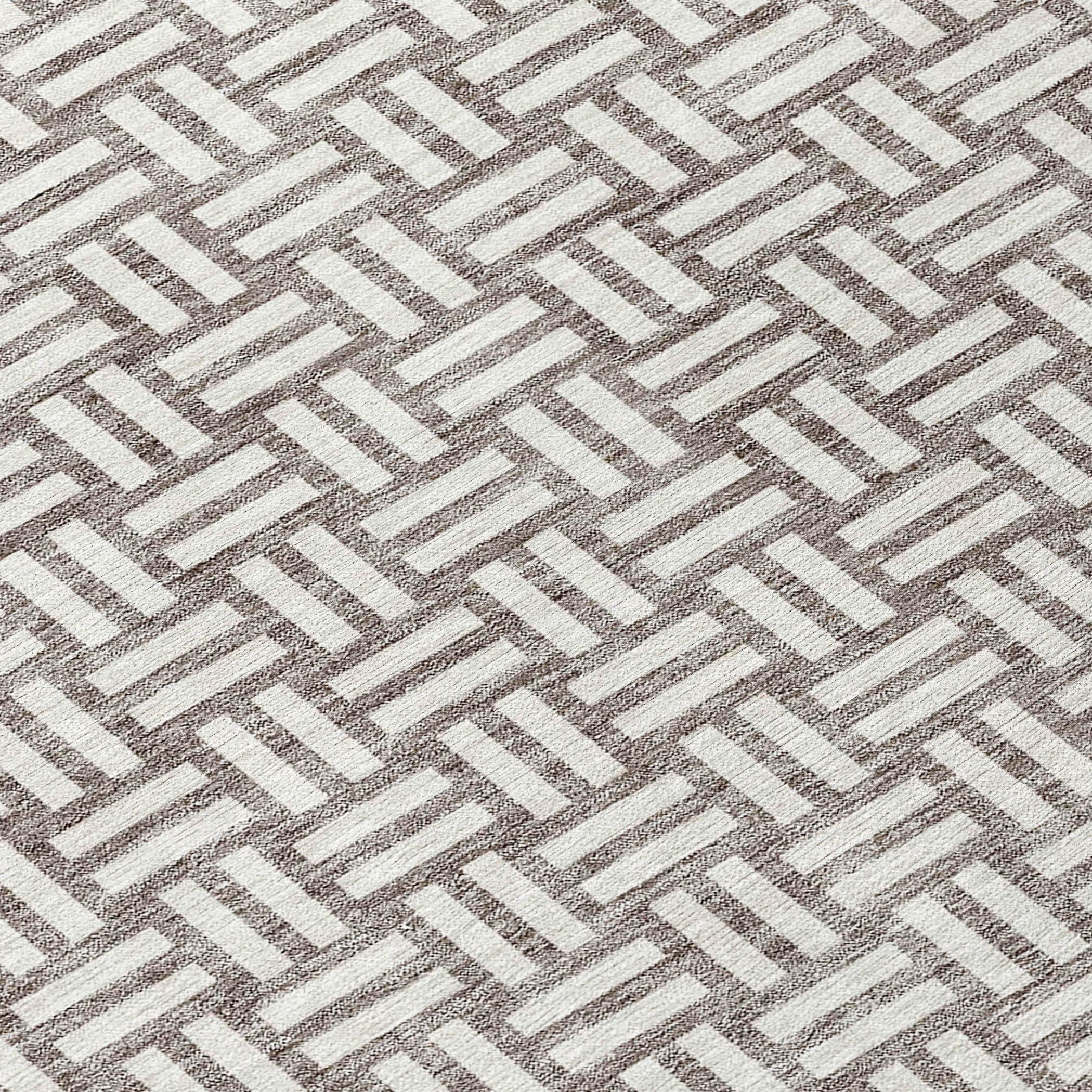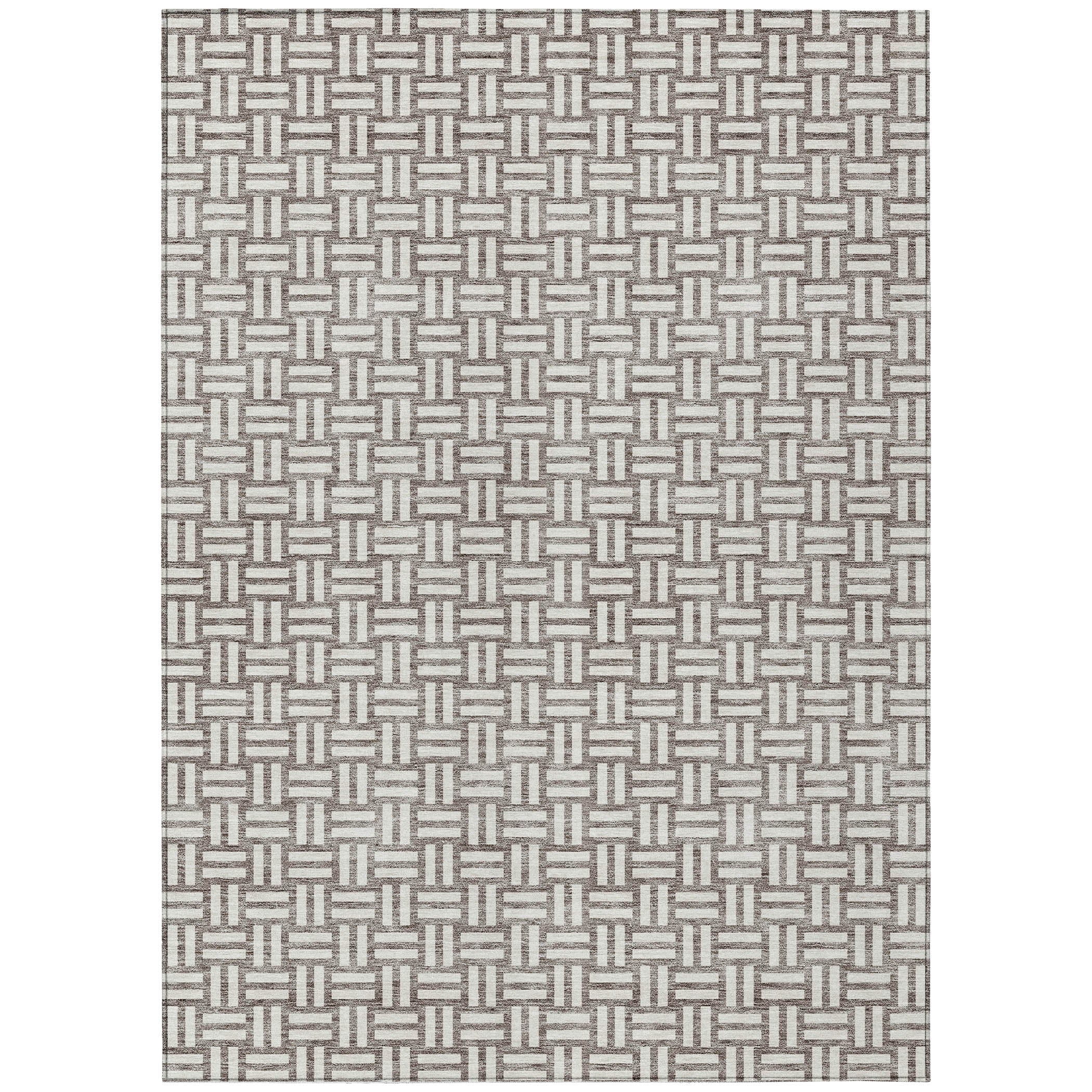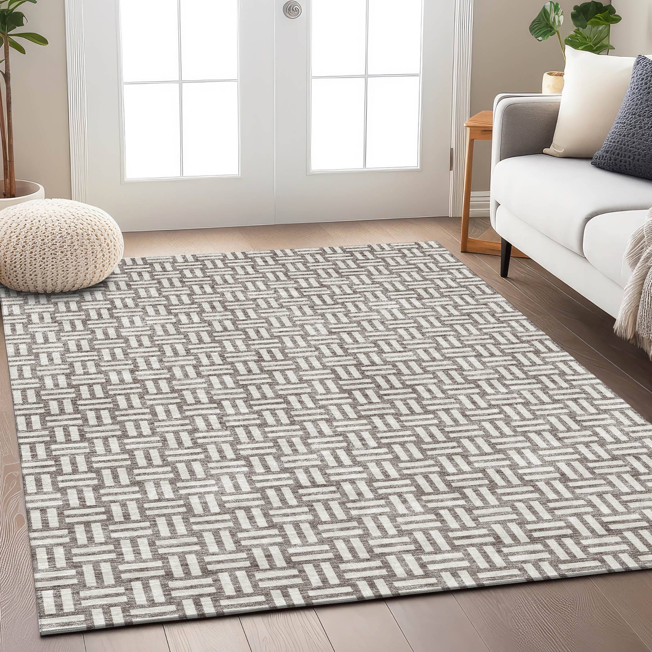 Chantille ACN925 Taupe area rug, a sophisticated addition to your home decor. This elegant rug features a unique weave-like pattern created by small rectangular boxes, seamlessly blending transitional style with modern square designs. Crafted for both durability and versatility, this rug is UV stabilized for use in any indoor or outdoor setting.