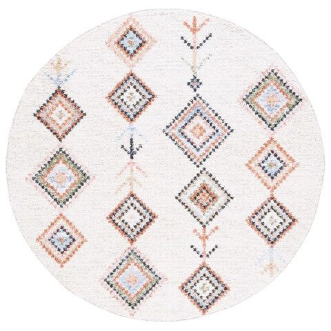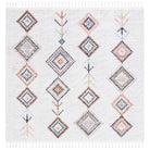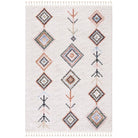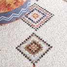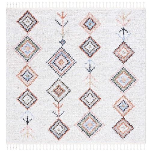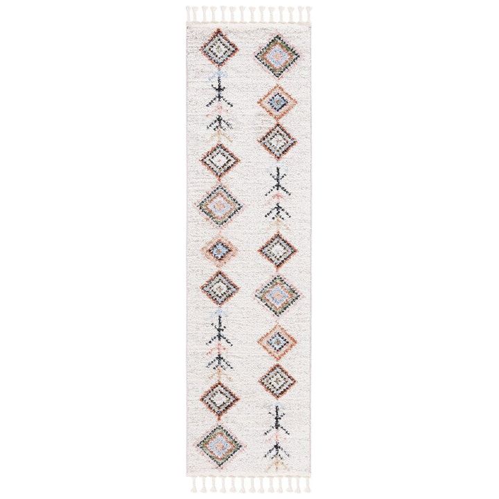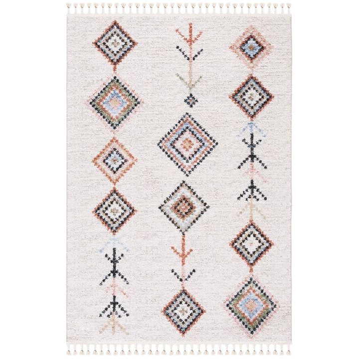 Introduce a touch of global bohemian style to your space with the Chapel CHP402A Ivory Black rug by SAFAVIEH. This exquisite piece from the Chapel Collection showcases captivating Moroccan diamond patterns in chic colors, instantly revitalizing any room it graces. Crafted with a luxuriously soft polyester pile, this area rug not only enhances the visual appeal of your decor but also provides a cozy underfoot experience. The addition of charming braided tassels infuses an artistic and relaxed vibe into your interior, creating a unique focal point that exudes warmth and character. Elevate your home with this stylish and inviting rug from SAFAVIEH's Chapel Collection today!