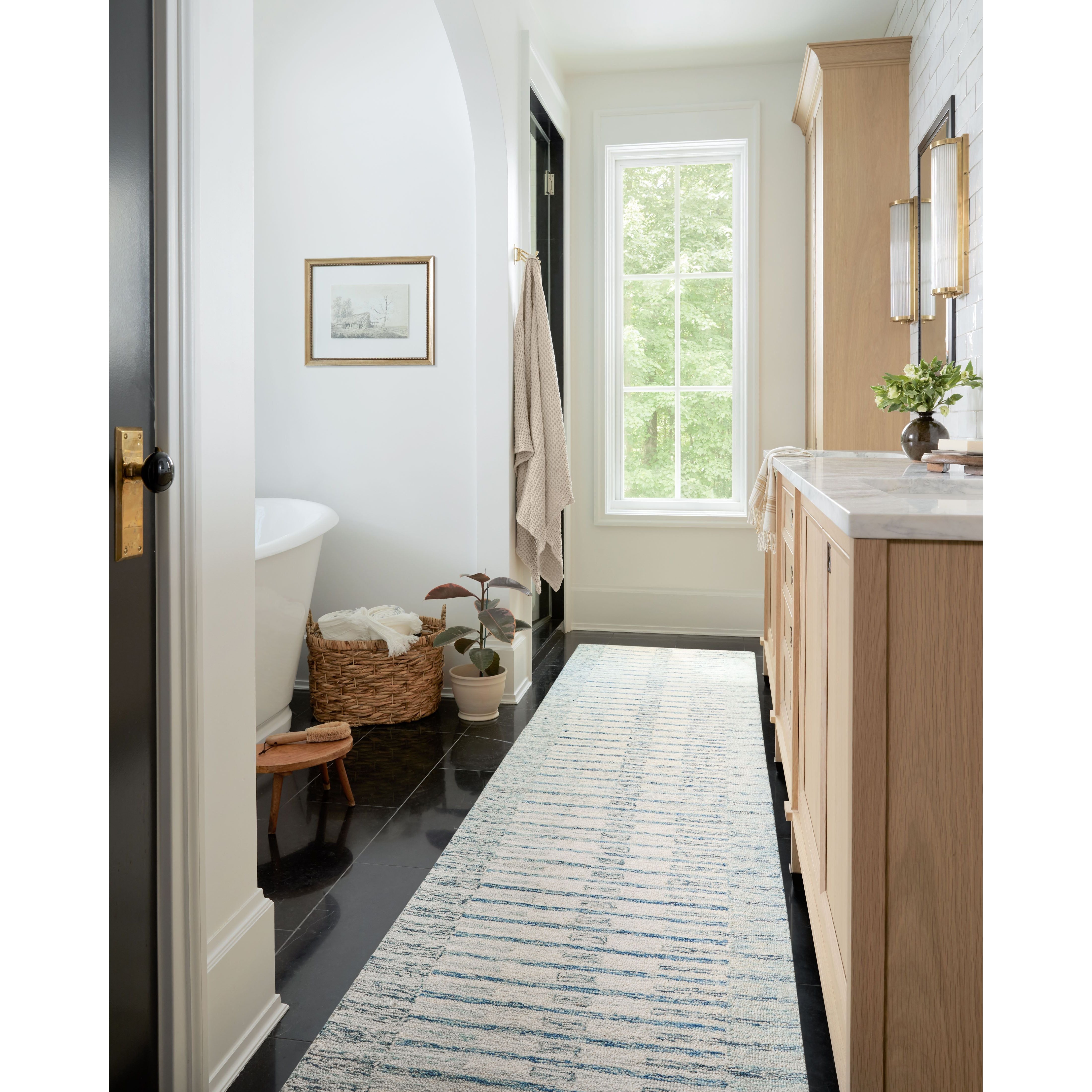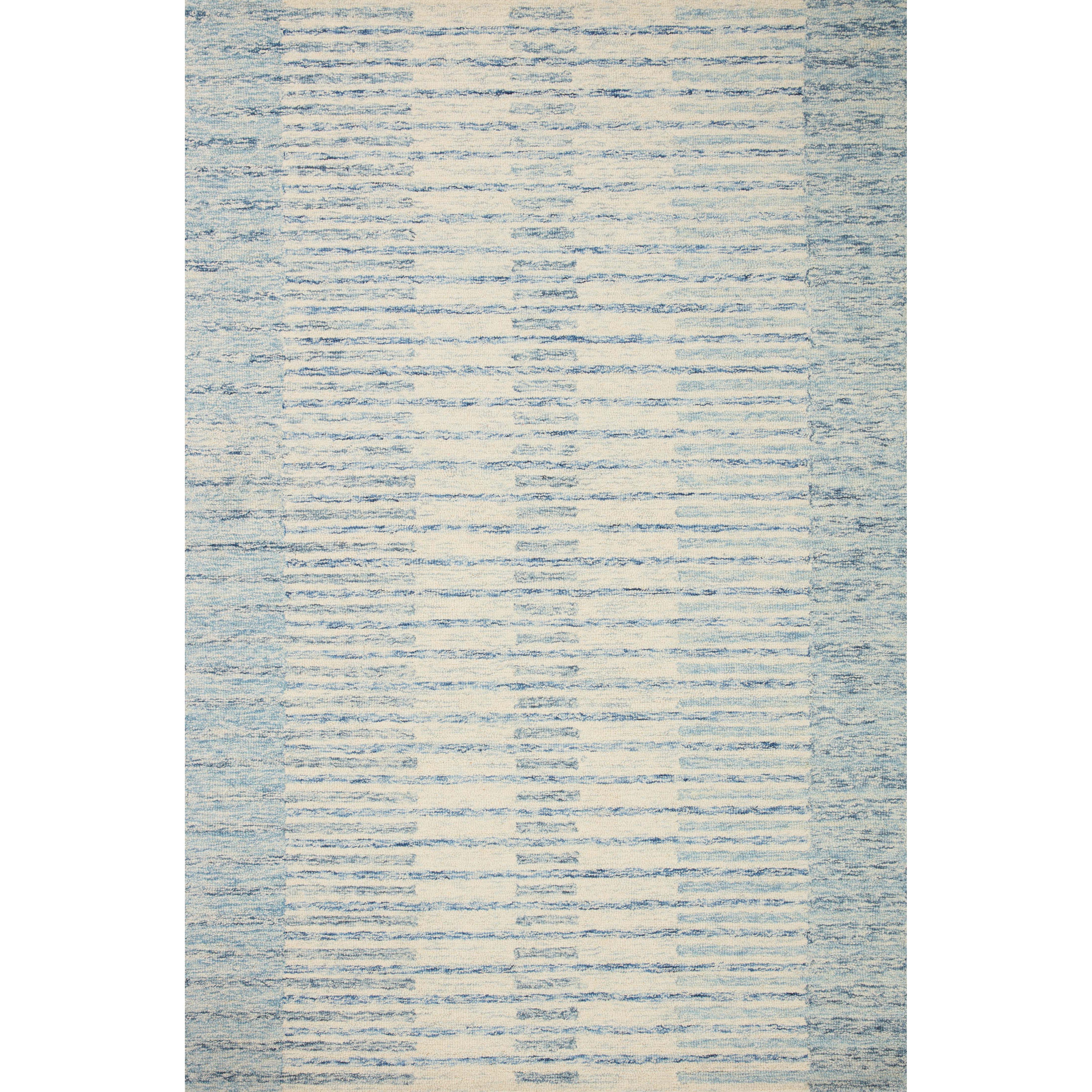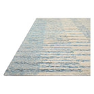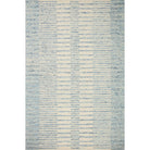 Chris Chr 01 Ivory Denim from the Chris Collection in collaboration with Chris Loves Julia x Loloi. This rug embodies the relaxed and cheerful vibe of its namesake, Chris. The design offers a modern twist on traditional stripe patterns with a soothing multi-tonal color scheme. Crafted by hand in India using 100% wool, each piece is GoodWeave certified to uphold ethical production practices and empower weavers' communities.