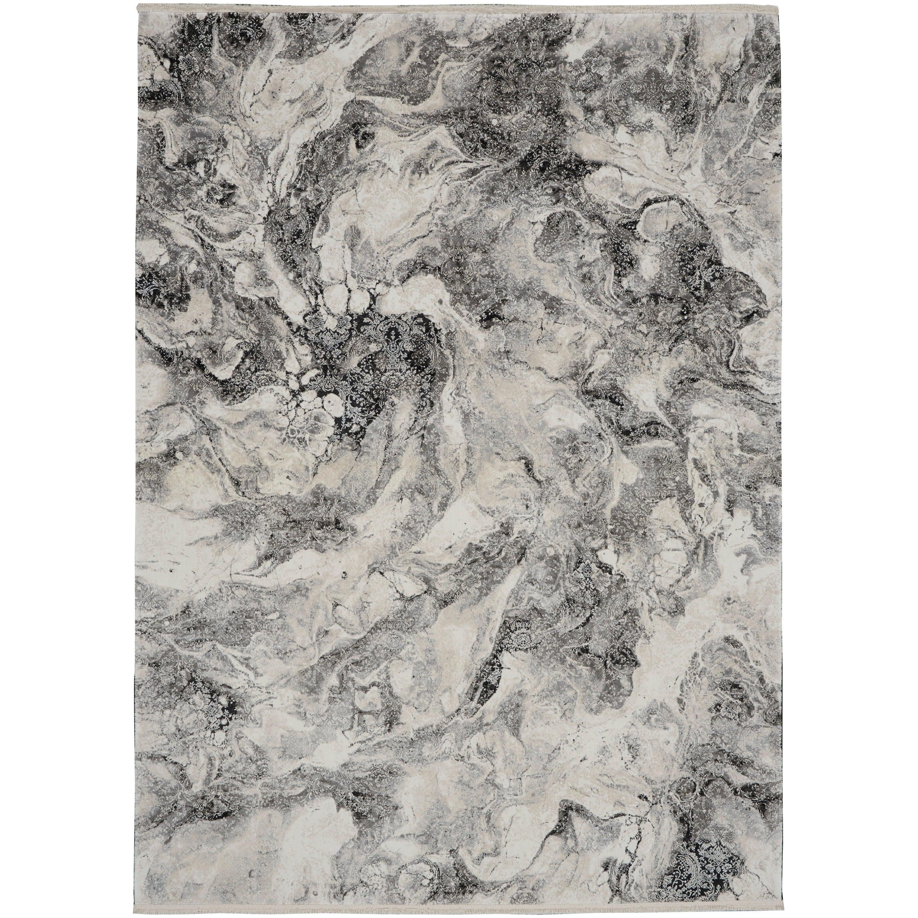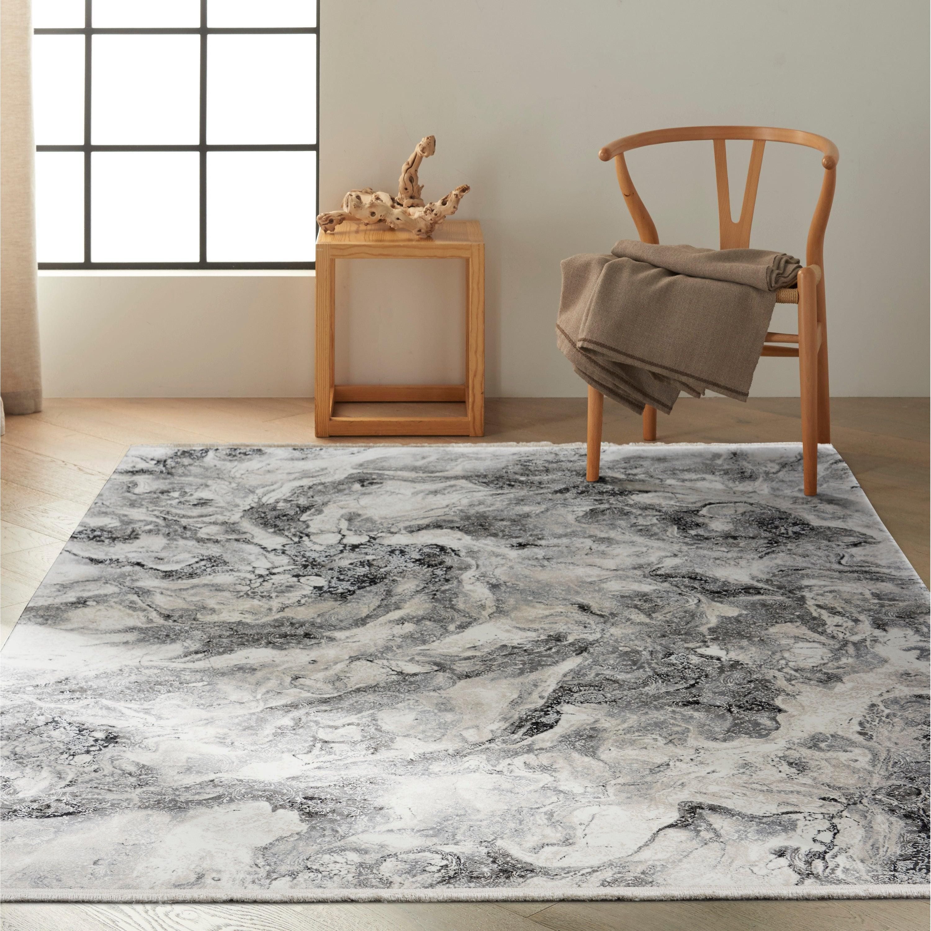 dynamic CK50 Balian CK56 Silver Black rug from the CALVIN KLEIN Balian Collection. Utilizing captivating trompe l’oeil designs, these rugs provide a sense of depth and dimension to your space. The subtle yet striking patterns add a touch of energy and personality to any room. Each rug is meticulously loom-woven with a low-pile construction, highlighting luxurious carved details and finely fringed edges for added elegance. The silk-like sheen enhances the overall aesthetic, making it a standout piece in contemporary home decor.