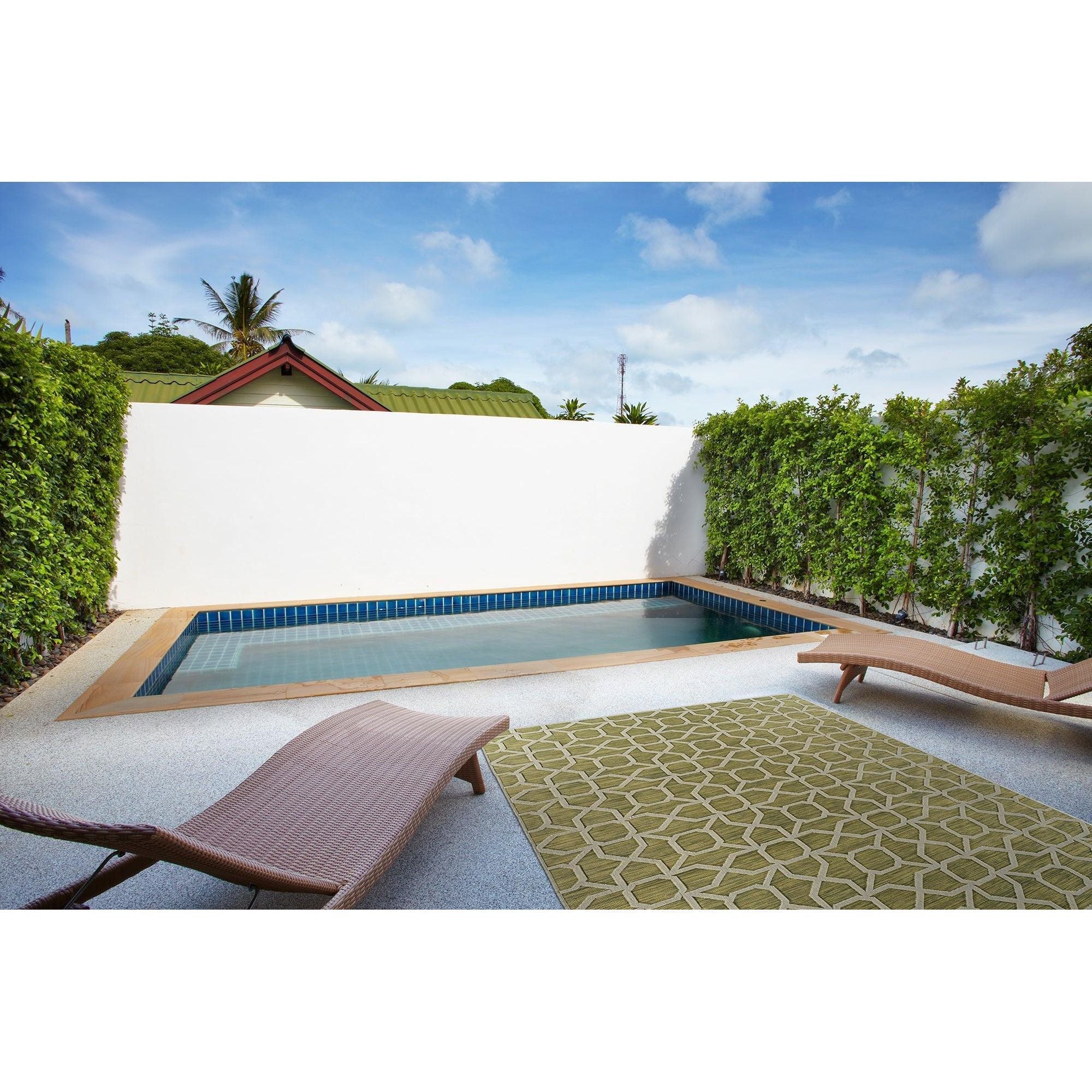 Cove COV01 96 Lime Green rug, inspired by the serene beauty of Tahiti's blue lagoons and colorful corals. This collection features simple and captivating geometric designs in a variety of vibrant, nature-inspired colors. Made in Turkey with 100% Polypropylene, the Cove rugs are the ideal addition to your outdoor space. The durable fibers ensure resistance to fading and heat, making them suitable for high-traffic areas in your home.