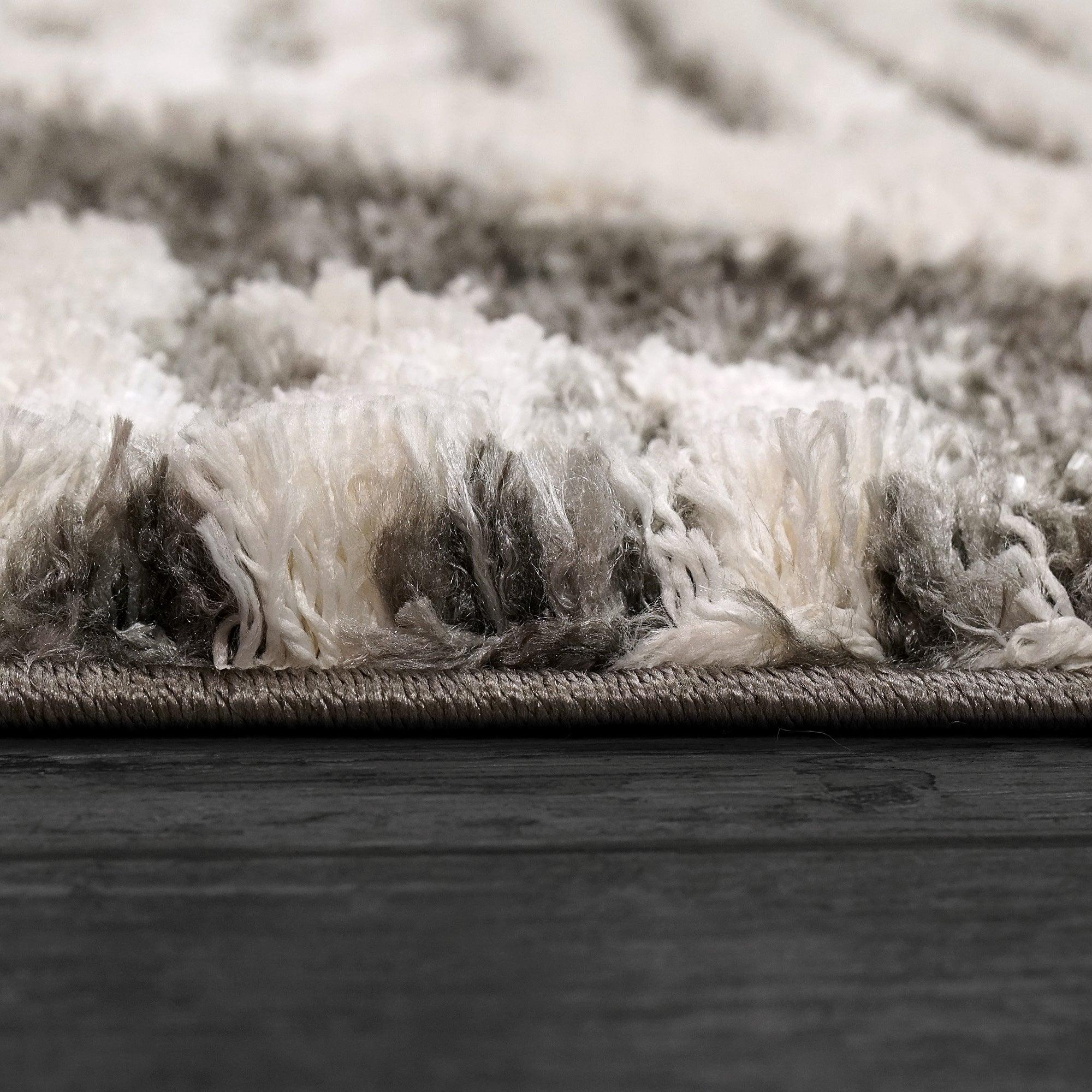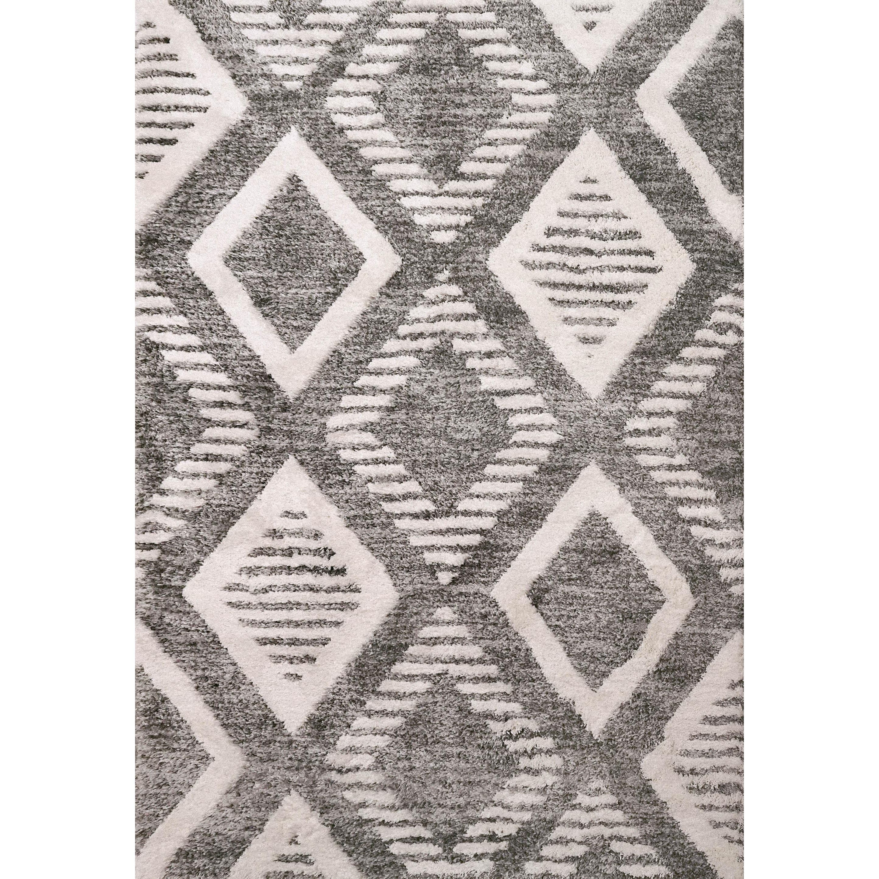 Cruz 7006 Grey Ivory rug, featuring visually stunning geometric patterns that add a modern touch to any space. The high-low texture of these rugs provides a unique feel underfoot, enhancing the overall aesthetic. Crafted with a blend of polyester and shrink polyester, the Cruz rugs offer a luxuriously soft touch that is sure to elevate your comfort experience.