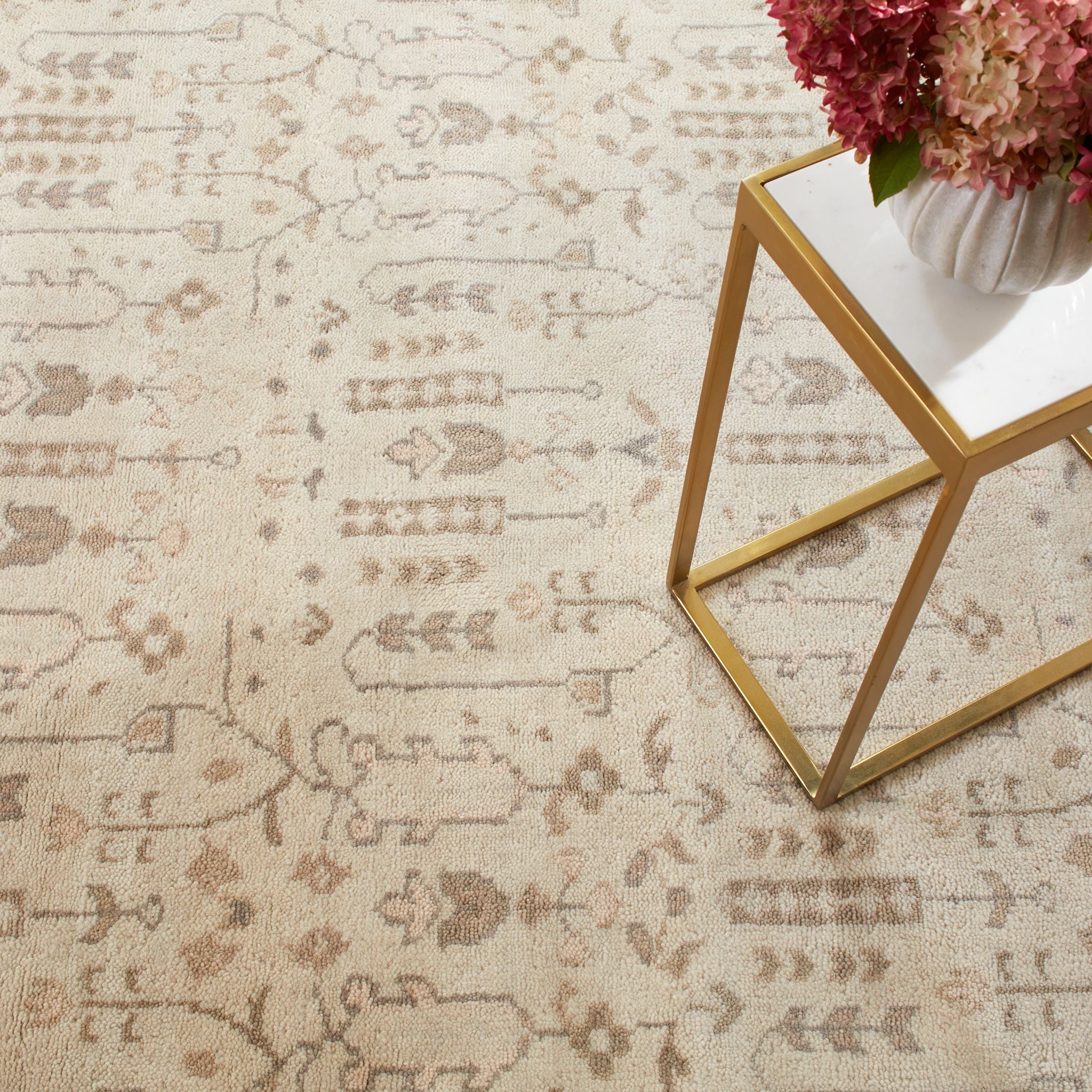 Part of our Masterpiece Collection that draws from the rich heritage of traditional, Turkish Oushak rugs. Woven and hand-knotted by master weavers in India, every detail – from the intricate motifs down to the finest yarn – speaks to the unparalleled quality and artisan craftsmanship of these vintage-inspired rugs.