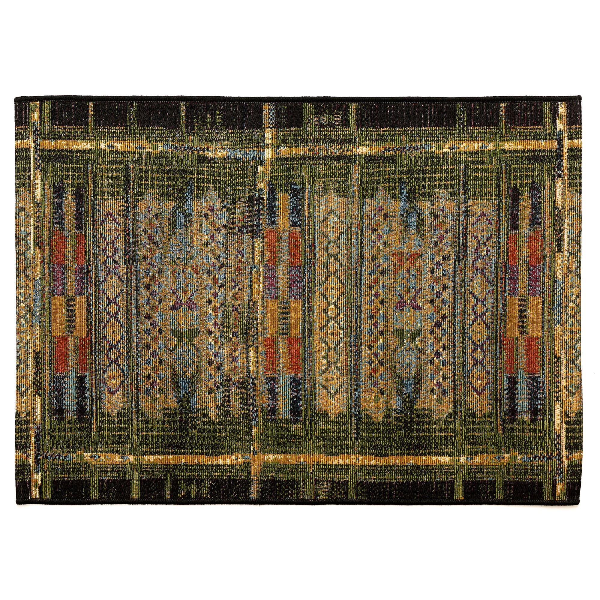 Esencia Tribal Stripe Green decorative mat, a stunning addition to your home inspired by traditional Southwestern designs. This global piece features stripe linear patterns in vibrant colors such as yellow, red, purple, and black, set against an earthy green background. The intricate shapes and multiple hues create a bold and unique design that will enhance any indoor or outdoor space.