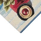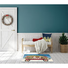 Esencia Wagon Wonderland Blue, a charming addition to your holiday decor. This novelty mat showcases a delightful scene of a red wagon overflowing with cute brown and white puppy dogs, surrounded by lush holiday greens. Perfect for adding a touch of whimsy and festive spirit to your home this season.