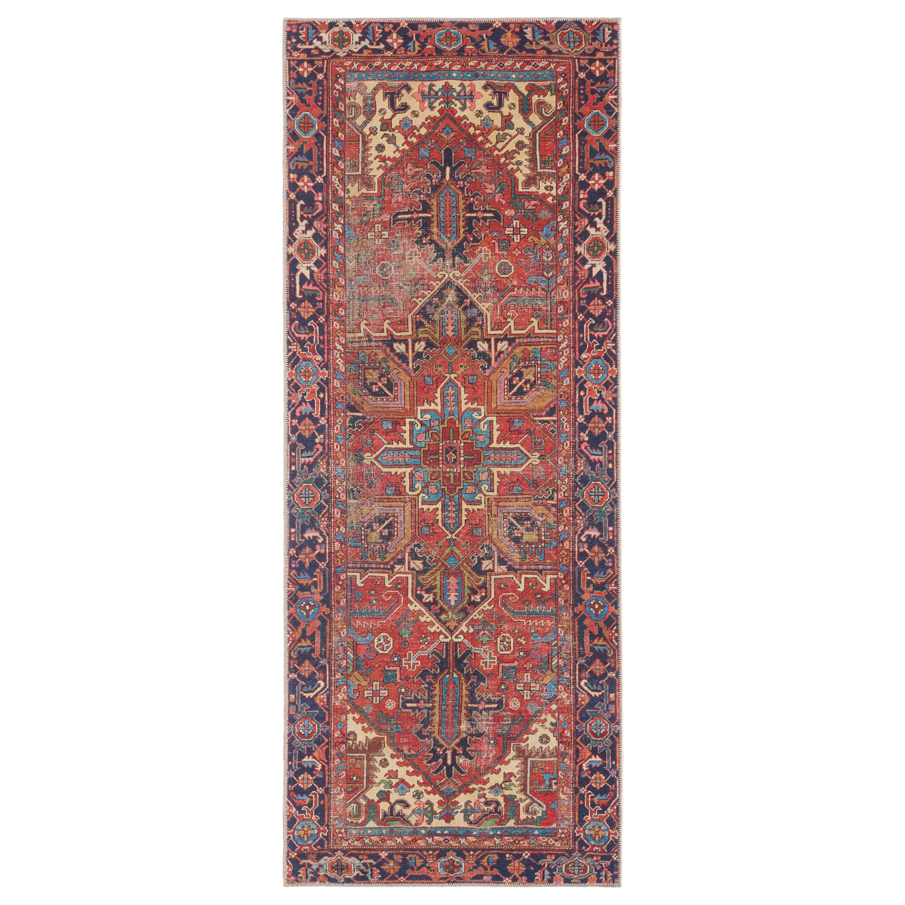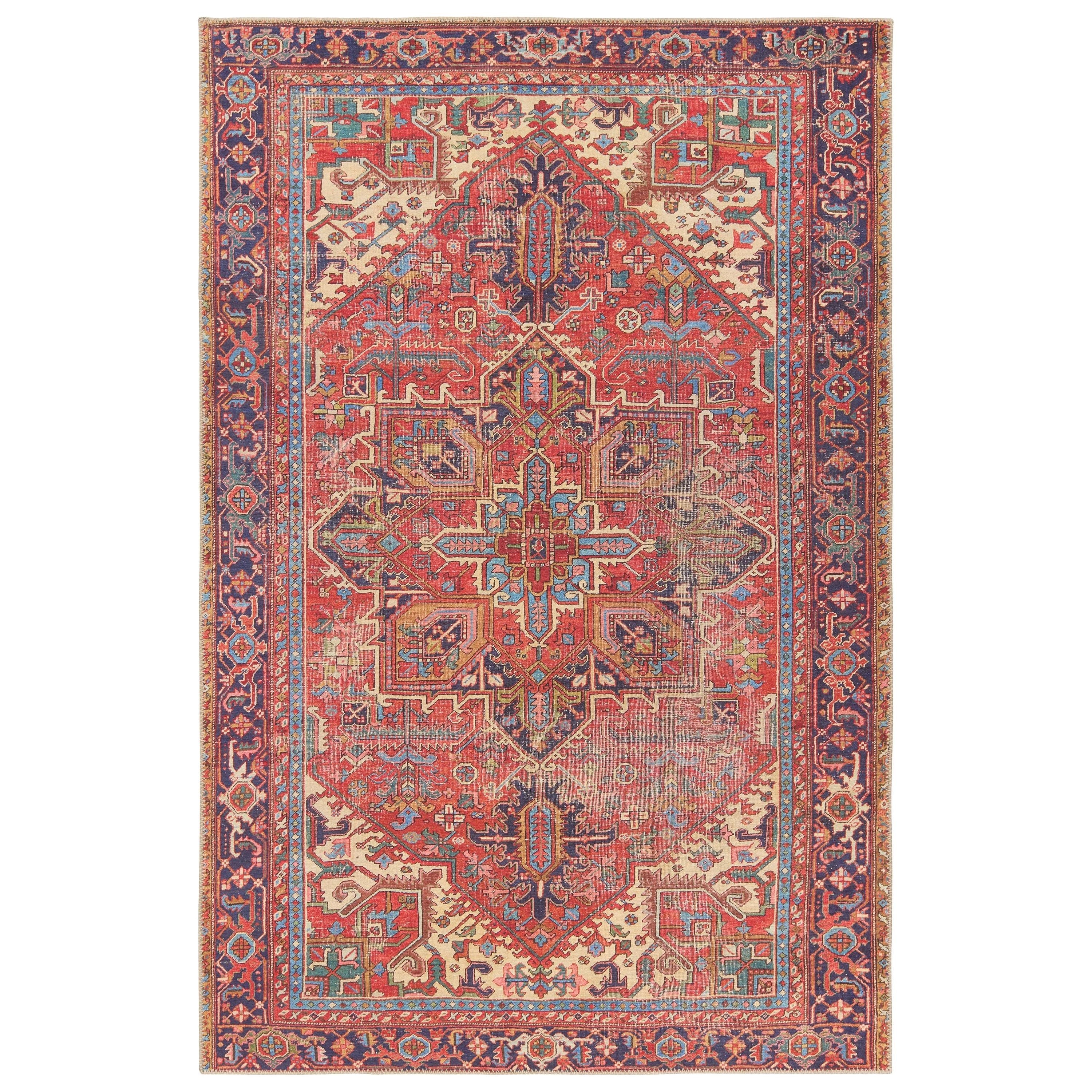 Inspired by coveted vintage finds, the Garcia collection emulates the well-worn details and the beautiful abrash nature of antique textiles. The Lucinda design showcases a beautiful center medallion and intricate border with tribal and floral details throughout. A bold, red hue dominates this rug with blue, green, pink, cream, gold, navy, and teal accent colors that create an intriguing and vivid addition to any home. Subtle distressing adds dimension to the Turkish-inspired, traditional style. In Turkey, this digital design is printed onto the 1/5th inch thick, polyester base, cut, and embellished with edge stitching for a finished look. Up to four times machine washable, this printed accent piece provides a durable quality that cleans up effortlessly while withstanding heavy traffic, children, and pets.