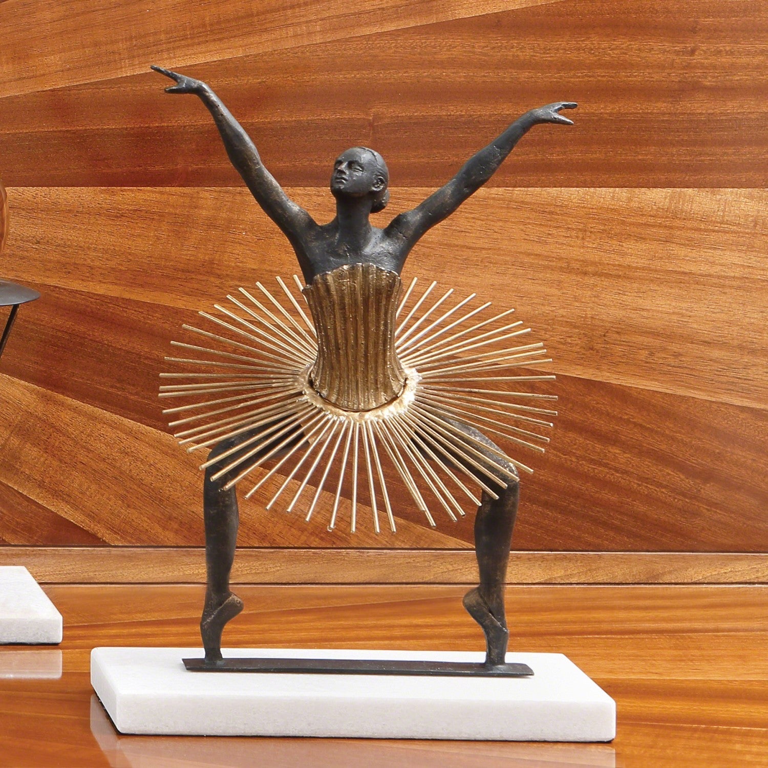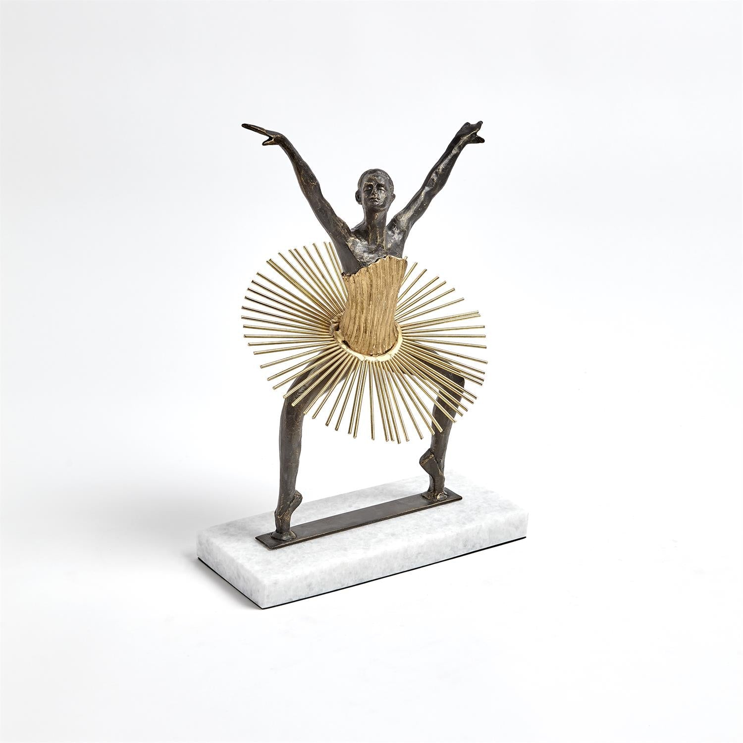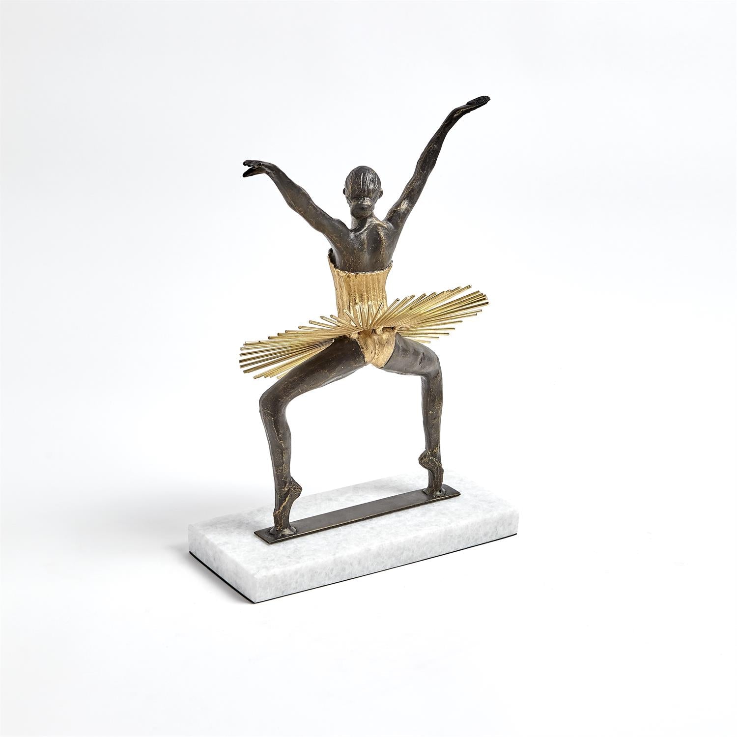Man becomes the machine in our Bauhaus figure collection. Inspired by Schlemmer's "Triadisches Ballett", our figurines take Schlemmer's avant-garde aesthetic and the idea of man as machine and shows the heart behind our human impulses. This highly stylized collection illustrates the Bauhaus ethos and displays the human body as abstract art. The play on Schlemmer's fantastic costuming is seen here in each piece. Available in five unique sculptures all constructed from a mix of cast iron, iron wire, and sheet brass, with painted gold details.