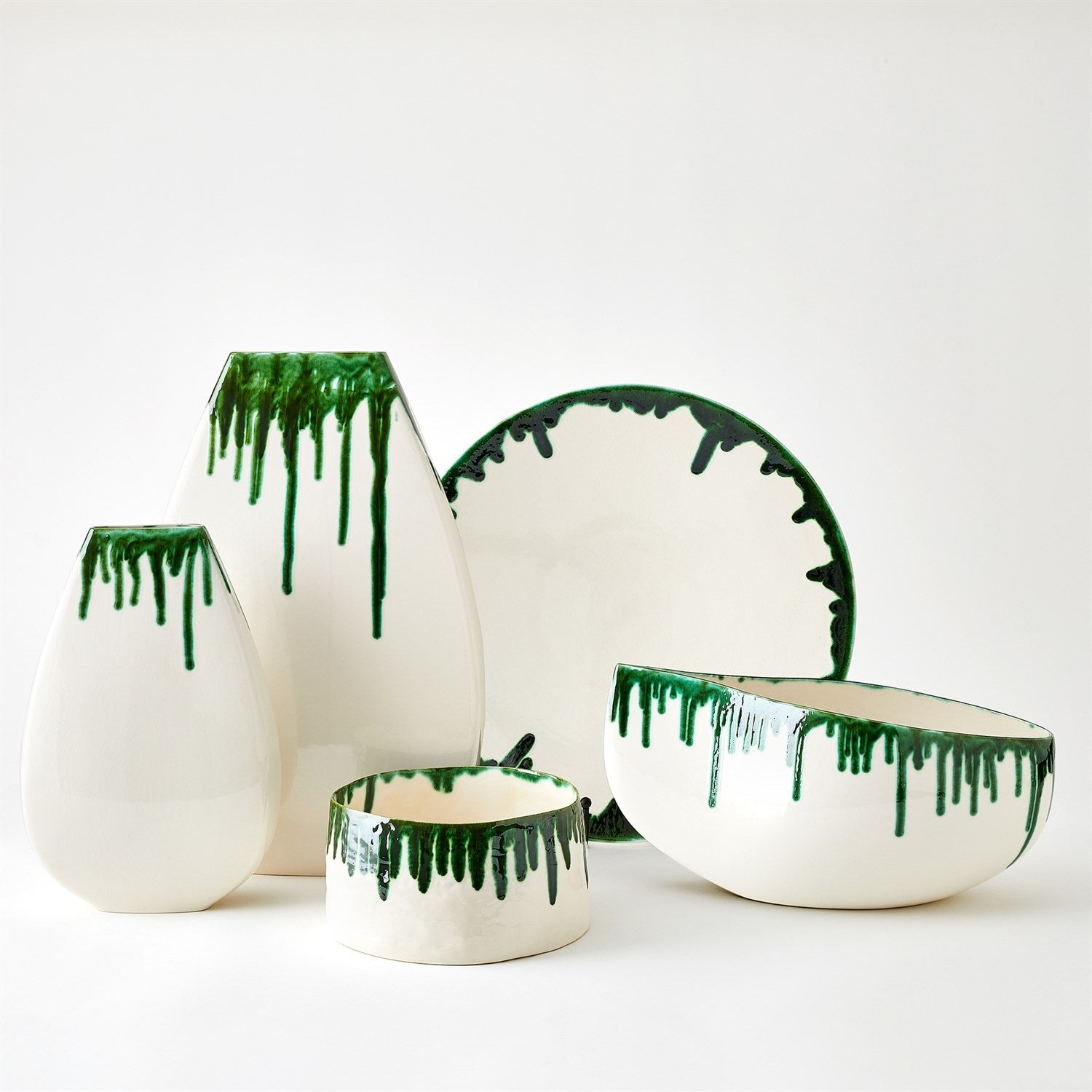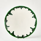 The Dripping Charger is meticulously handcrafted from Portuguese slip-molded ceramic, adorned with a hand-applied emerald green reactive glaze that creates a beautiful dripping effect.