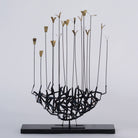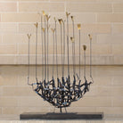 A perfect sculpture for tall, narrow spaces, Flock is individually hand-crafted of iron with brass "birds". It rests on a black granite base.