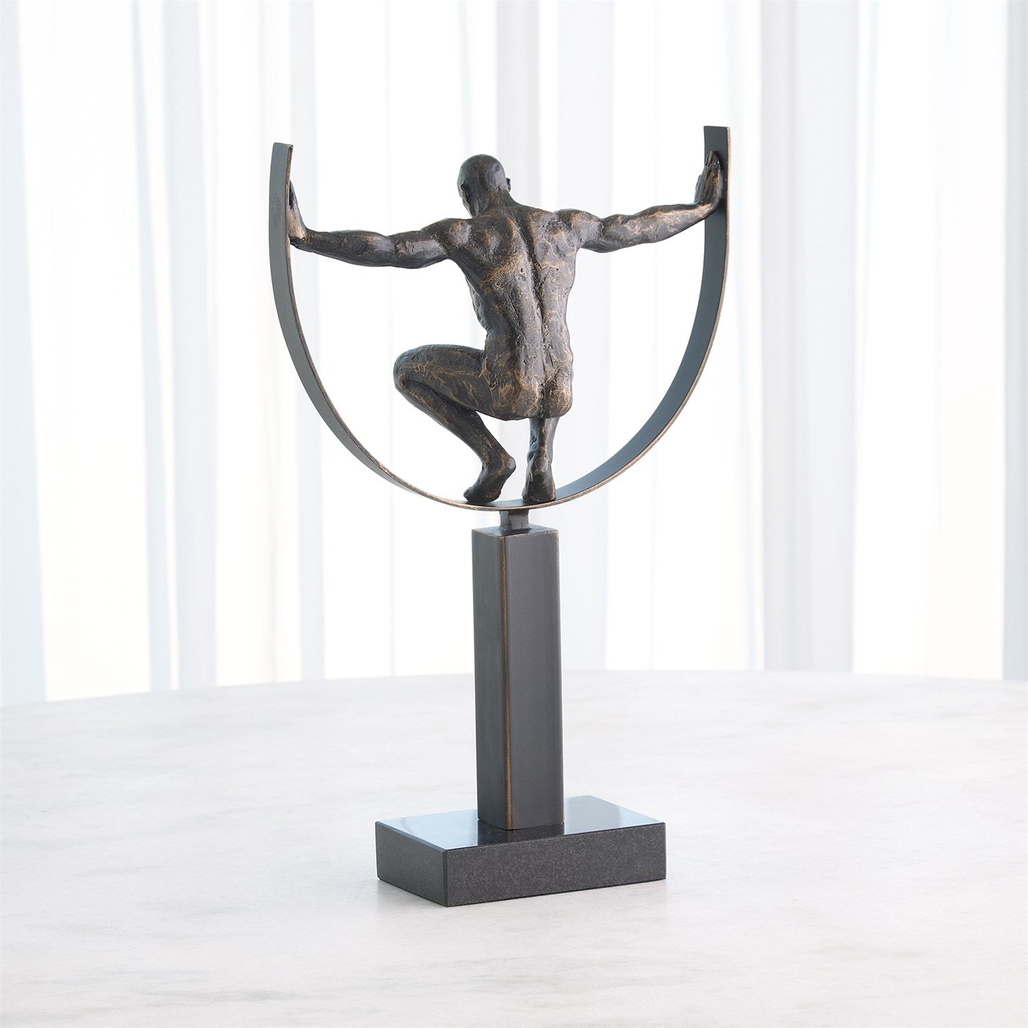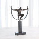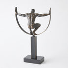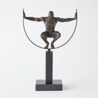 The Fortitude Sculpture features a striking figure crafted from cast iron with a bronze finish, elegantly positioned on a black marble base. This piece symbolizes strength and resilience, making it a powerful addition to any space.