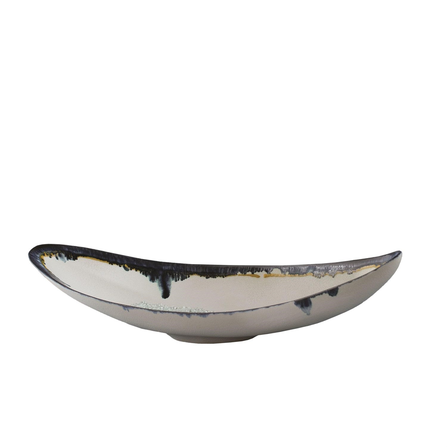 Glass Drip Canoe bowl is made of porcelain with molten glass fragments fired into the cream hued reactive glazed. Hand applied accents of deep blue and solar yellow.