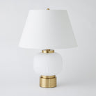 The Global Table Lamp showcases bold brass detailing juxtaposed with softly fluted, white-frosted glass, resulting in a striking interplay of texture and contrast. A white linen hardback shade finishes the design with a crisp, tailored touch.