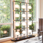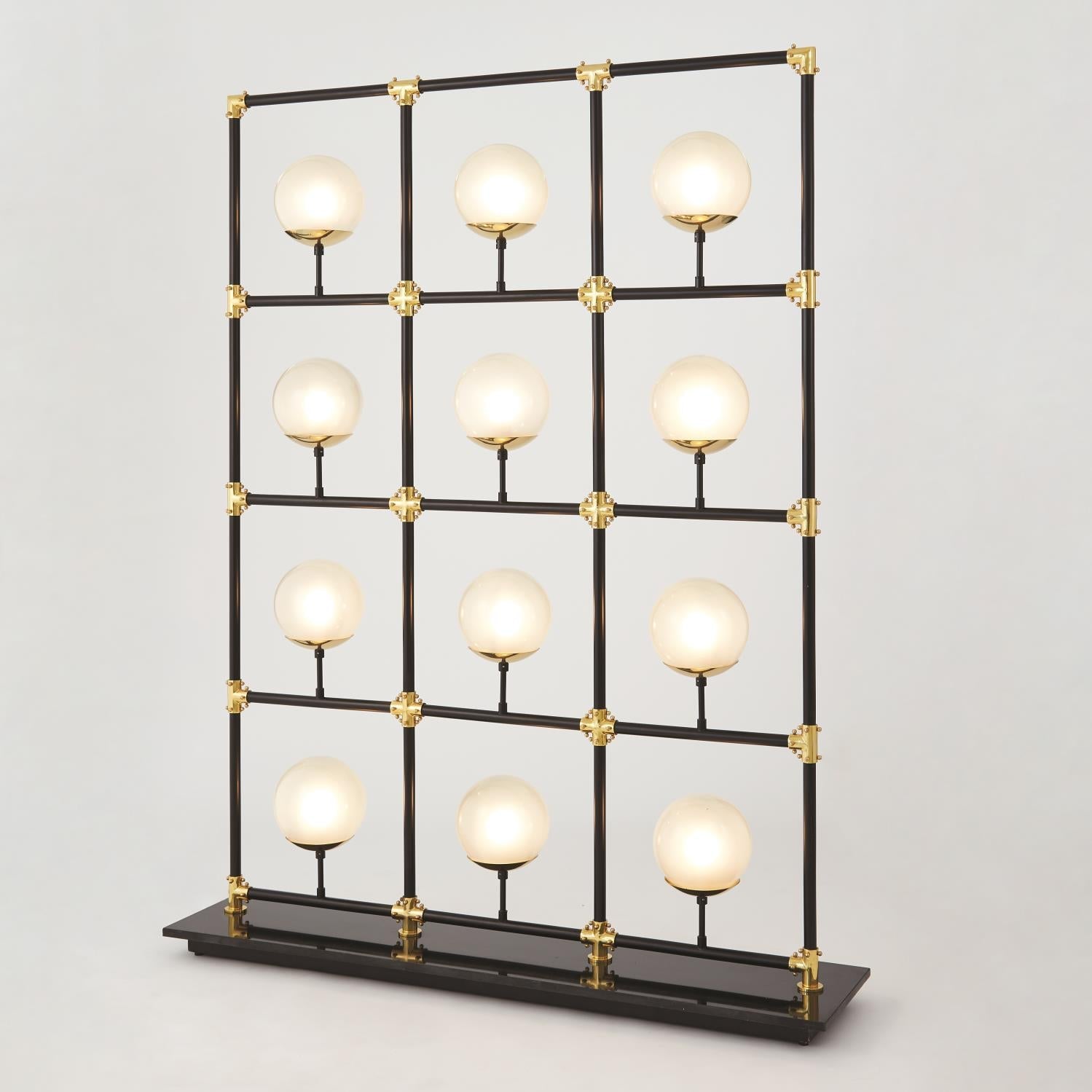 60s chic comes alive in our Globe in Square Floor Screen. This lighted display features a black iron frame that holds twelve large frosted illuminated globes. The structure is detailed with polished brass cups that hold each globe and connectors that support each quadrant. A polished black granite base and in-line floor switch finishes off this mod masterpiece.