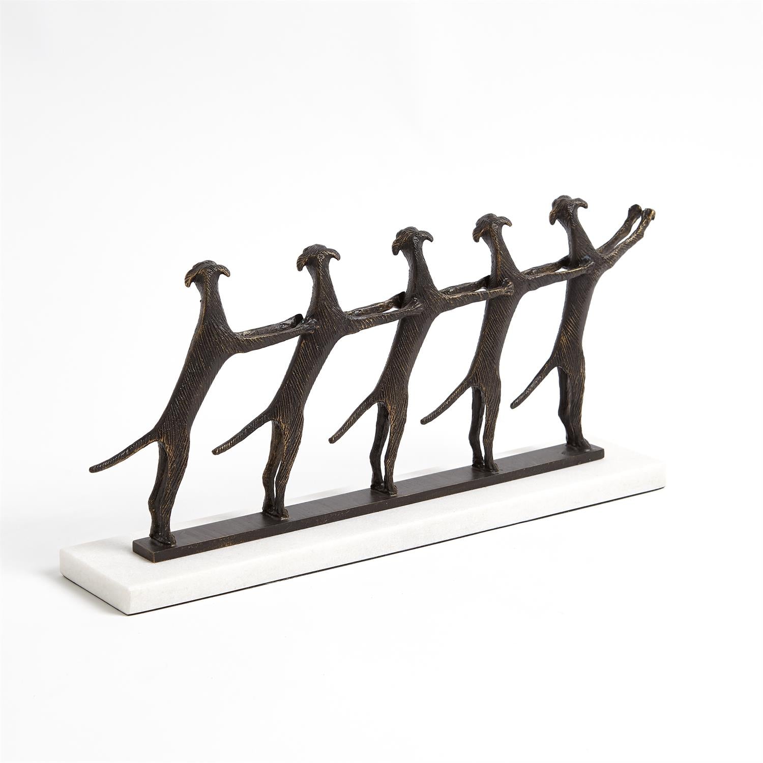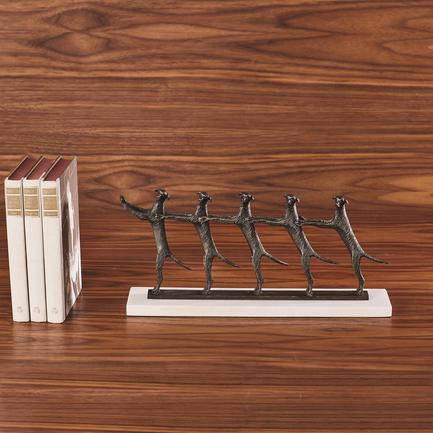 Need a some canine companionship without an actual canine? Let our Golden Conga Line dance its way into your home and heart. The brass pups dance in a row and sit on a white marble base.