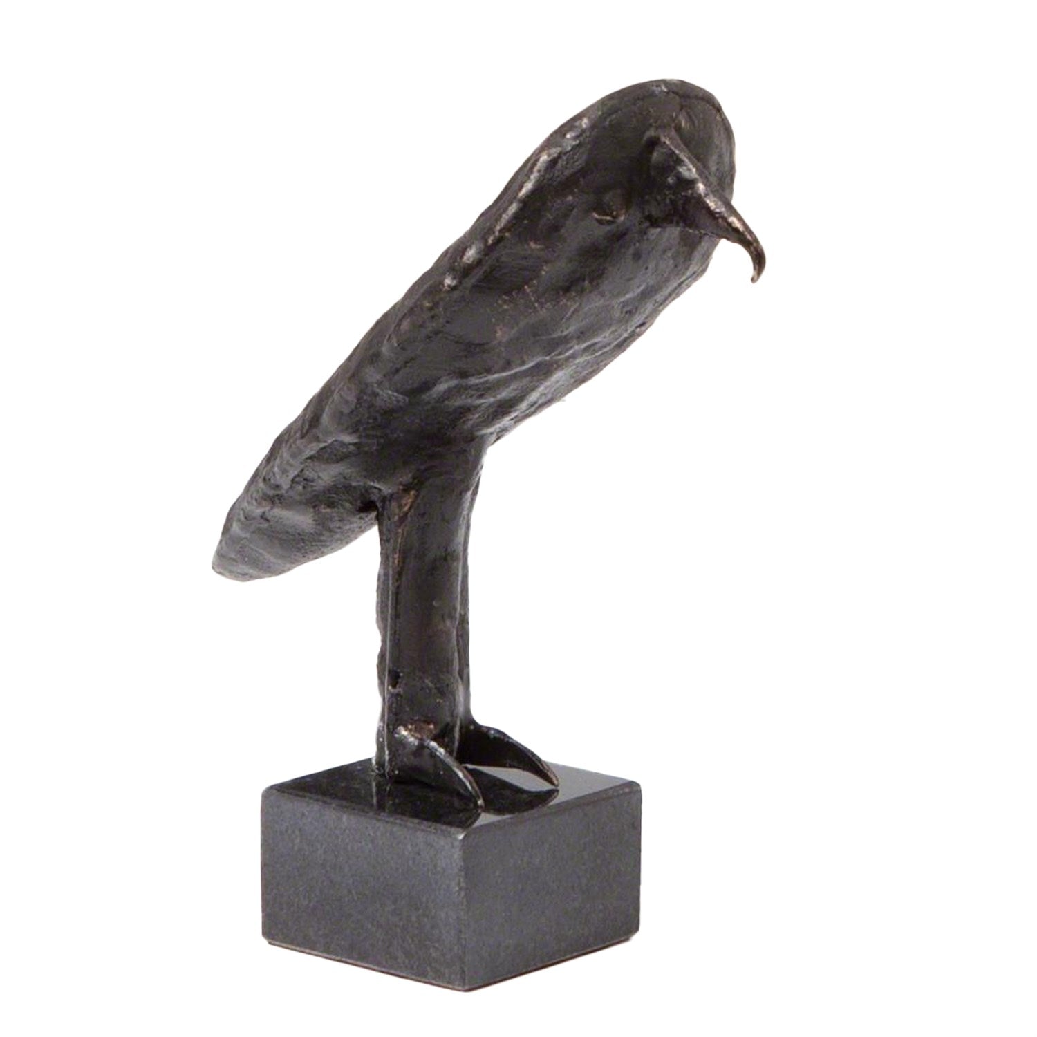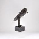 This miniature owl sculpture, sand cast from a vintage original, sits gracefully on a black granite pedestal with an antique bronze finish. Please note that due to its handcrafted nature, slight variations in size may occur.