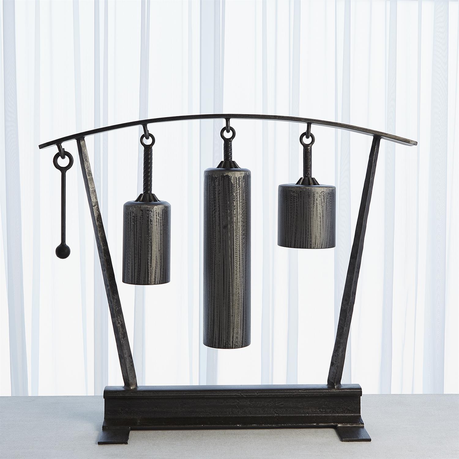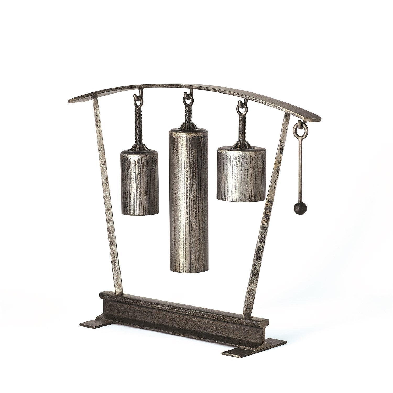 Ernst Gruler's original Sound Sculptures were made from repurposed scrap steel and pressure canisters, with a liberal sprinkling of industrial chic, and the technical and aesthetic attention to detail that informs all of Ernst's work. The bells are meant to be rung, and in many cases other parts of the sculptures also resonate when struck. This is why he calls them Sound Sculptures: they invite exploration and interaction, along with the contemplation of the origin and previous functions of the various scrap components of the sculptures. Studio A Home has reproduced Ernst's original Sound Sculptures from iron. They exactly reflect the component parts of his originals. Available in three styles.