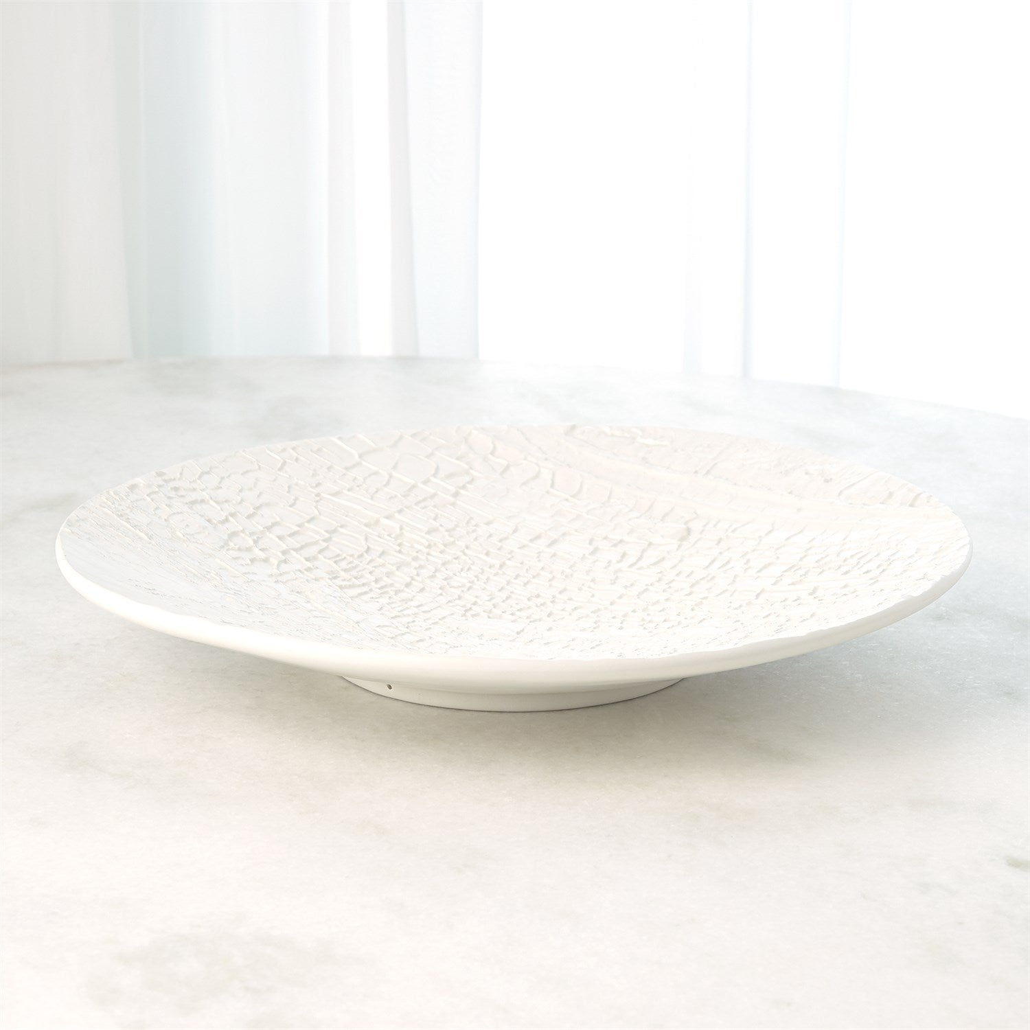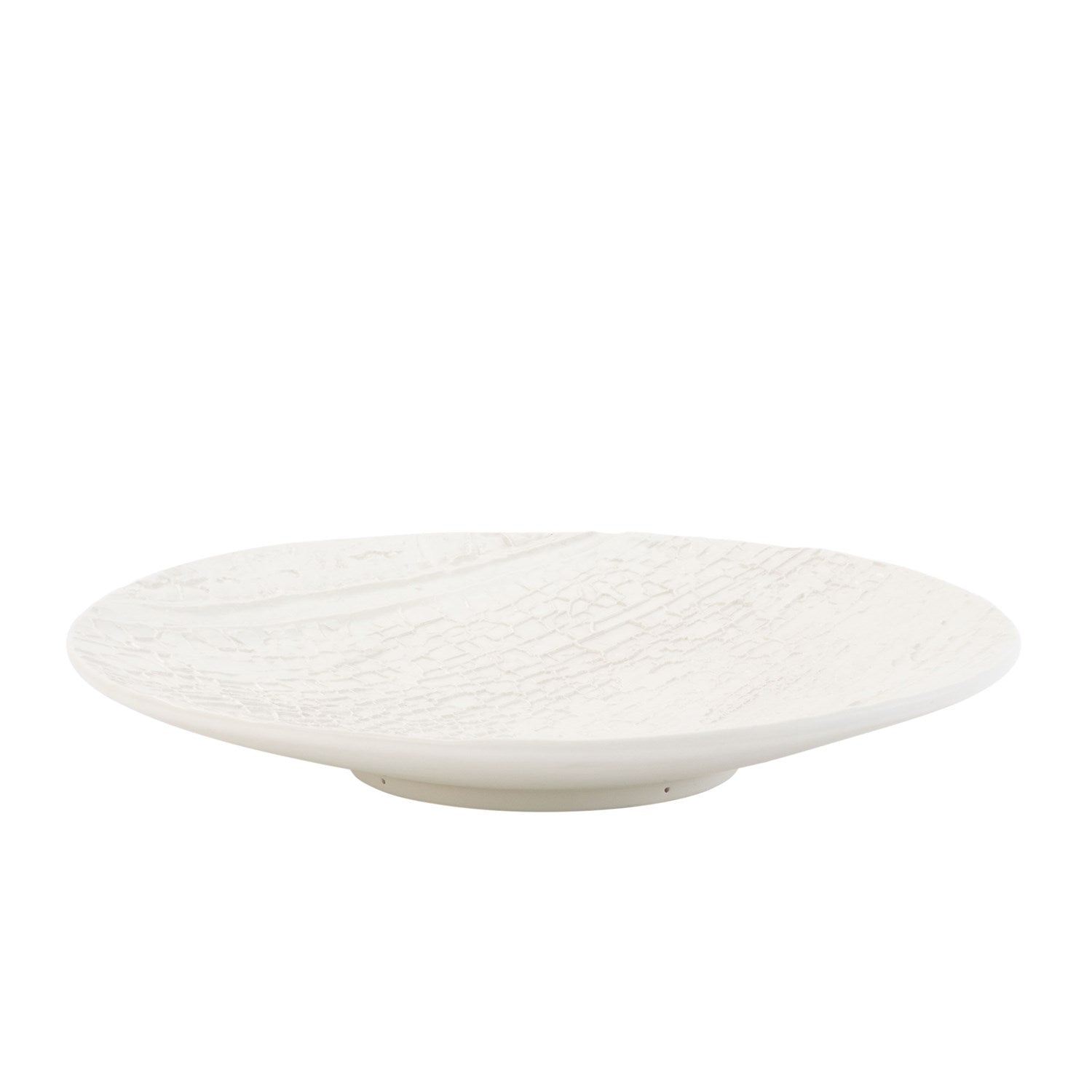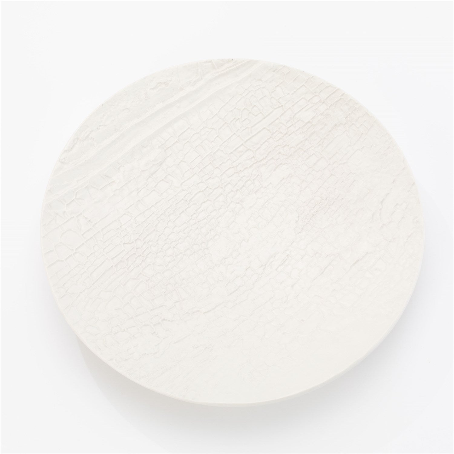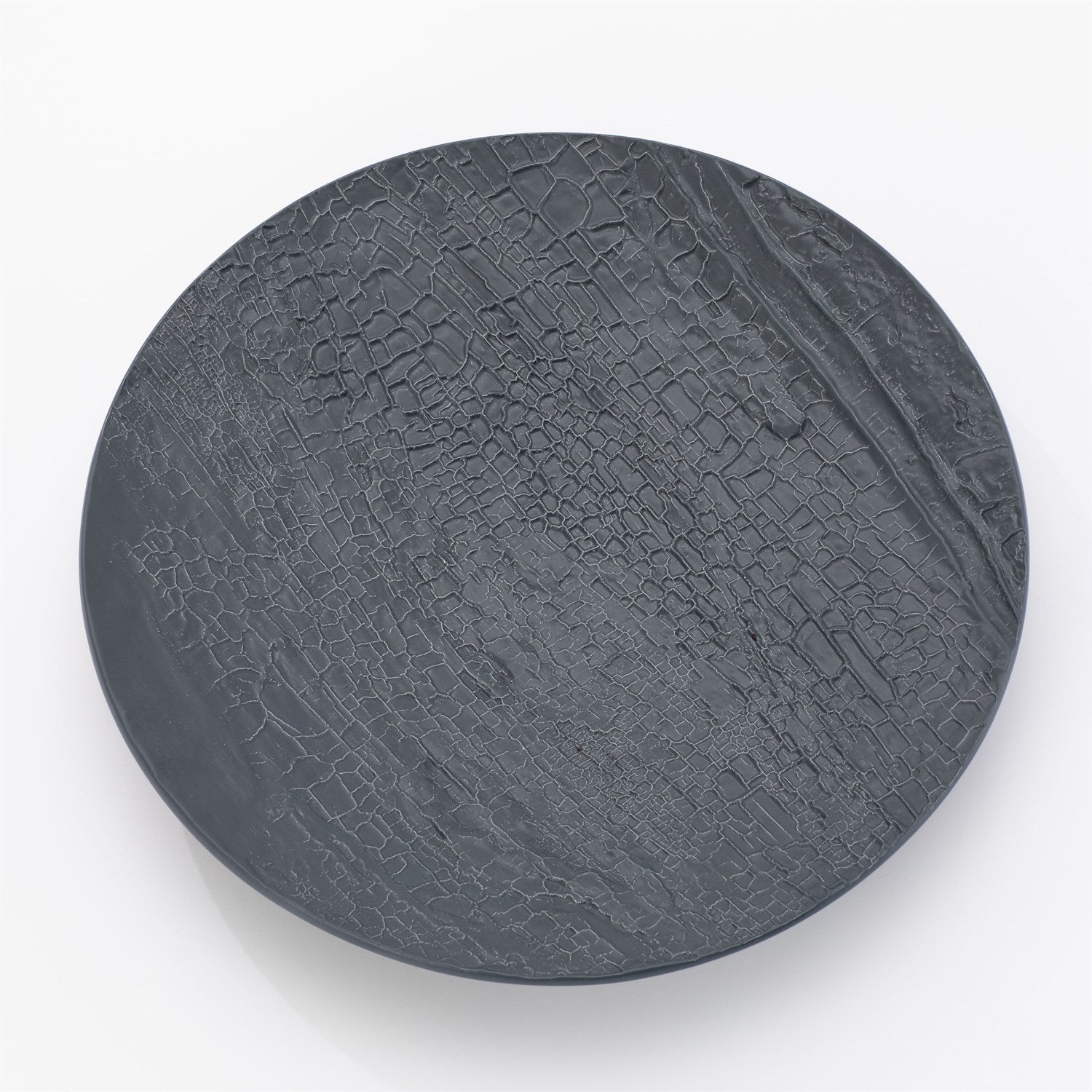Nature is recreated in this extraordinary Tree Texture Collection. This plate is made with the relief of a burned Poplar tree. Part of the tree that died but, the remainder of the tree is still alive.Truly taken directly from tree bark, molds are cast to then reinterpret into vessels and decorative accessories. This charger is glazed in matte black and can be displayed on a charger stand.