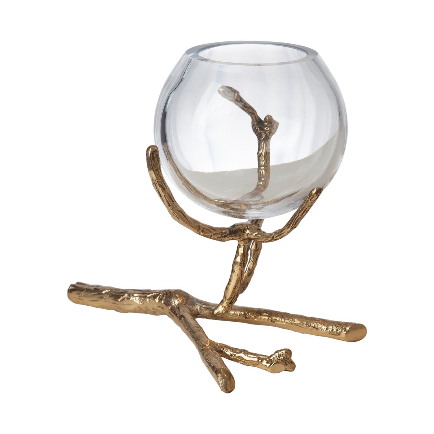 Stems of solid sand-cast brass twist and turn creating our Twig Vase Holders. These delicate vase holders have taken natural elements and turned them into glowing artful accessories. The glass bulb-shaped vases display small buds beautifully. Display one piece for a simple look or show all three sizes together for a dramatic tablescape. Available in three sizes: Large 3-vase holder, Medium 2-vase holder, and Small 1-vase holder. Also available in Nickel.