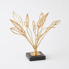 The Windswept Sculpture features a striking cast iron design with hand-applied gold leaf detailing, beautifully complemented by a black marble base. This elegant piece adds a touch of sophistication to any setting.