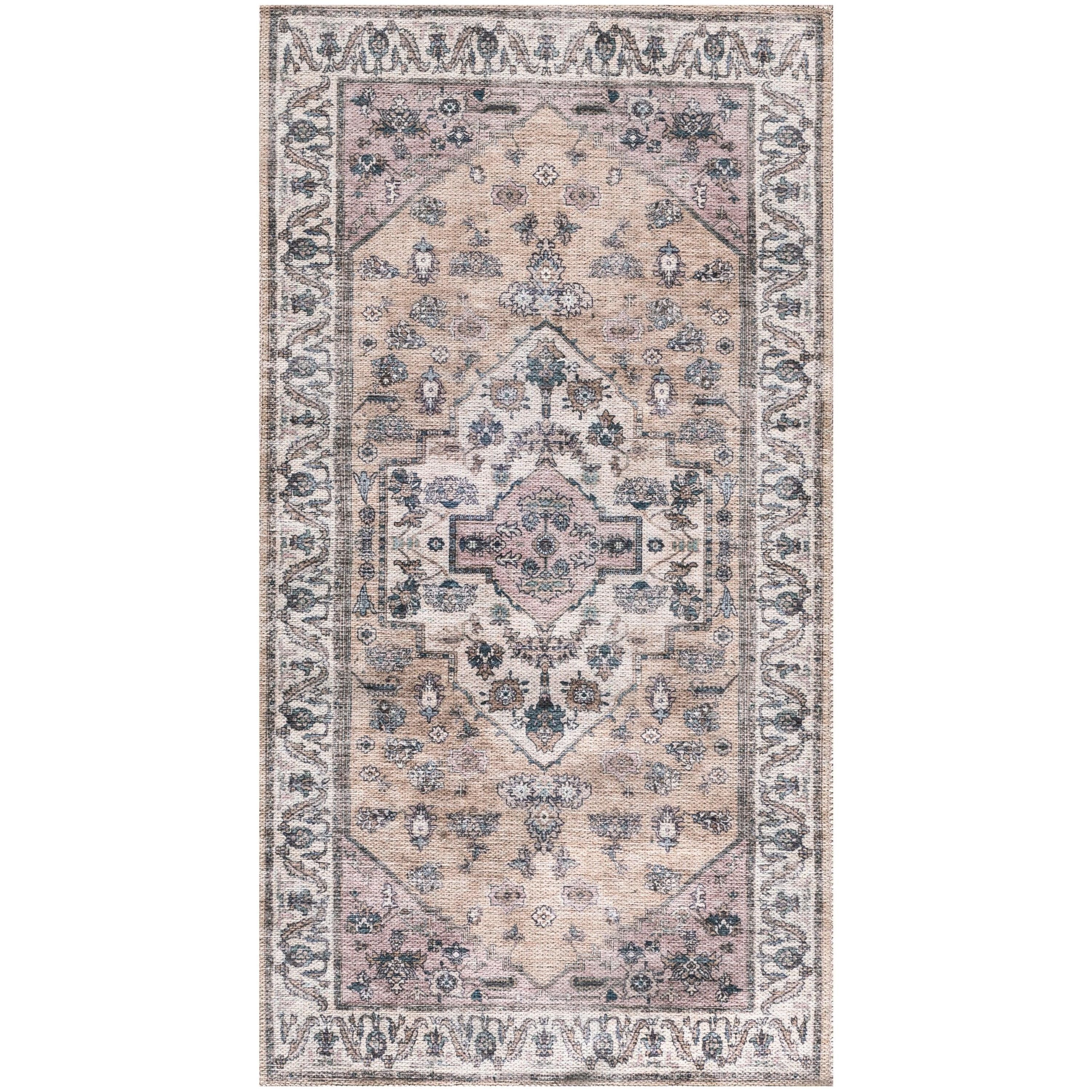 Grand Washables GRW03 Beige Multicolor Rug, a delightful addition to your home decor. This collection embodies the charm of a cherished heirloom rug, minus the extensive maintenance. Featuring intricately printed Persian designs with tastefully distressed color palettes, these rugs exude a timeless aesthetic that effortlessly complements any space.