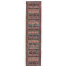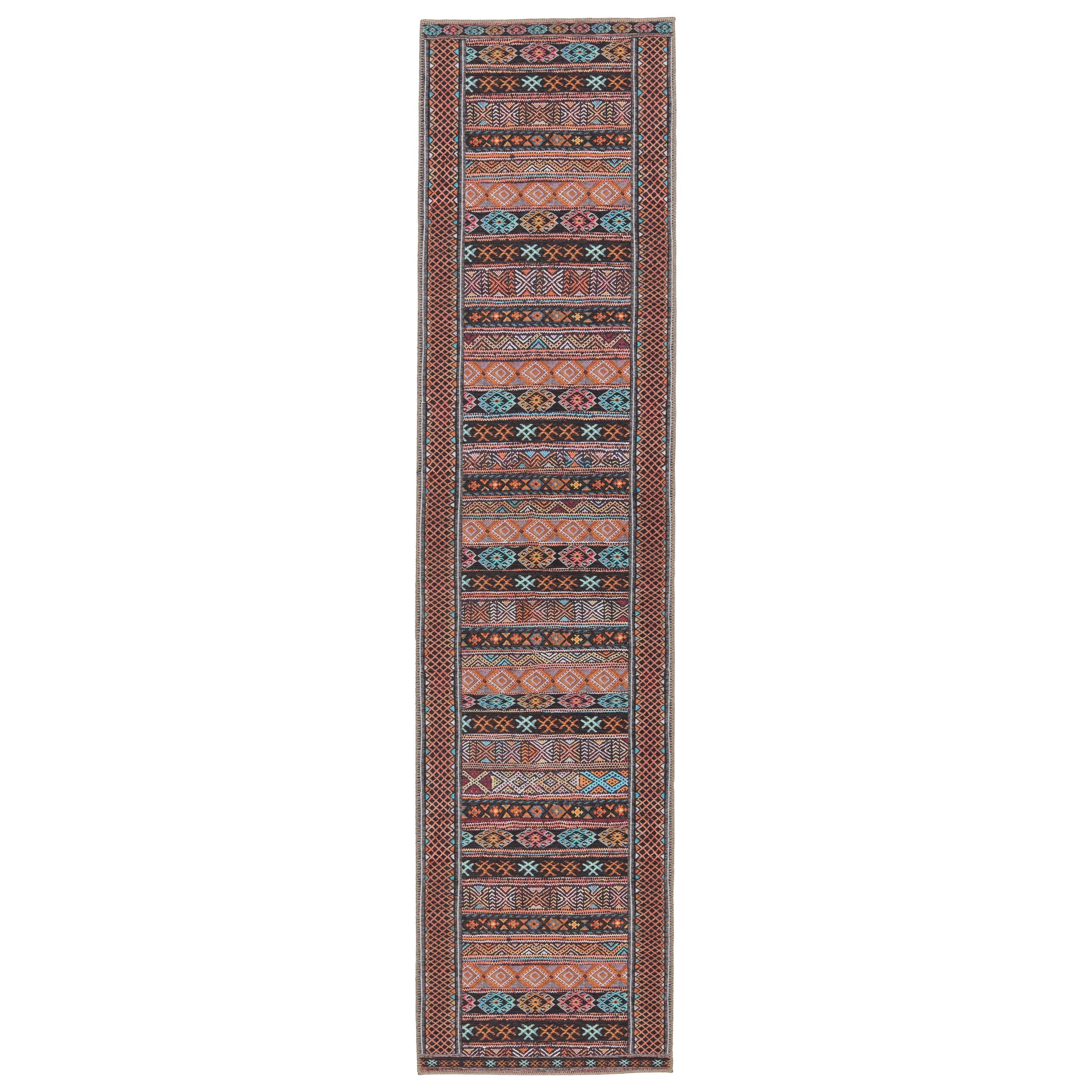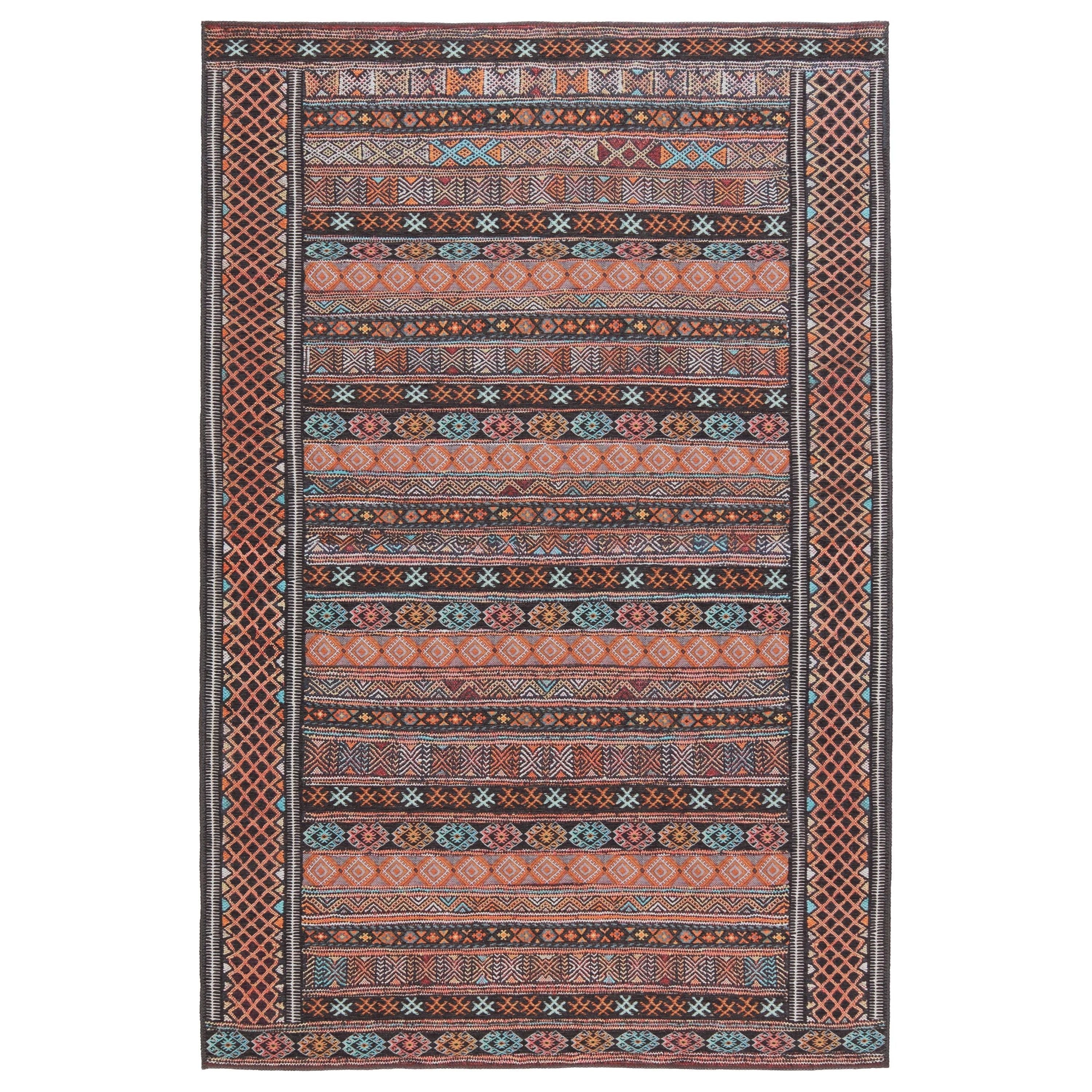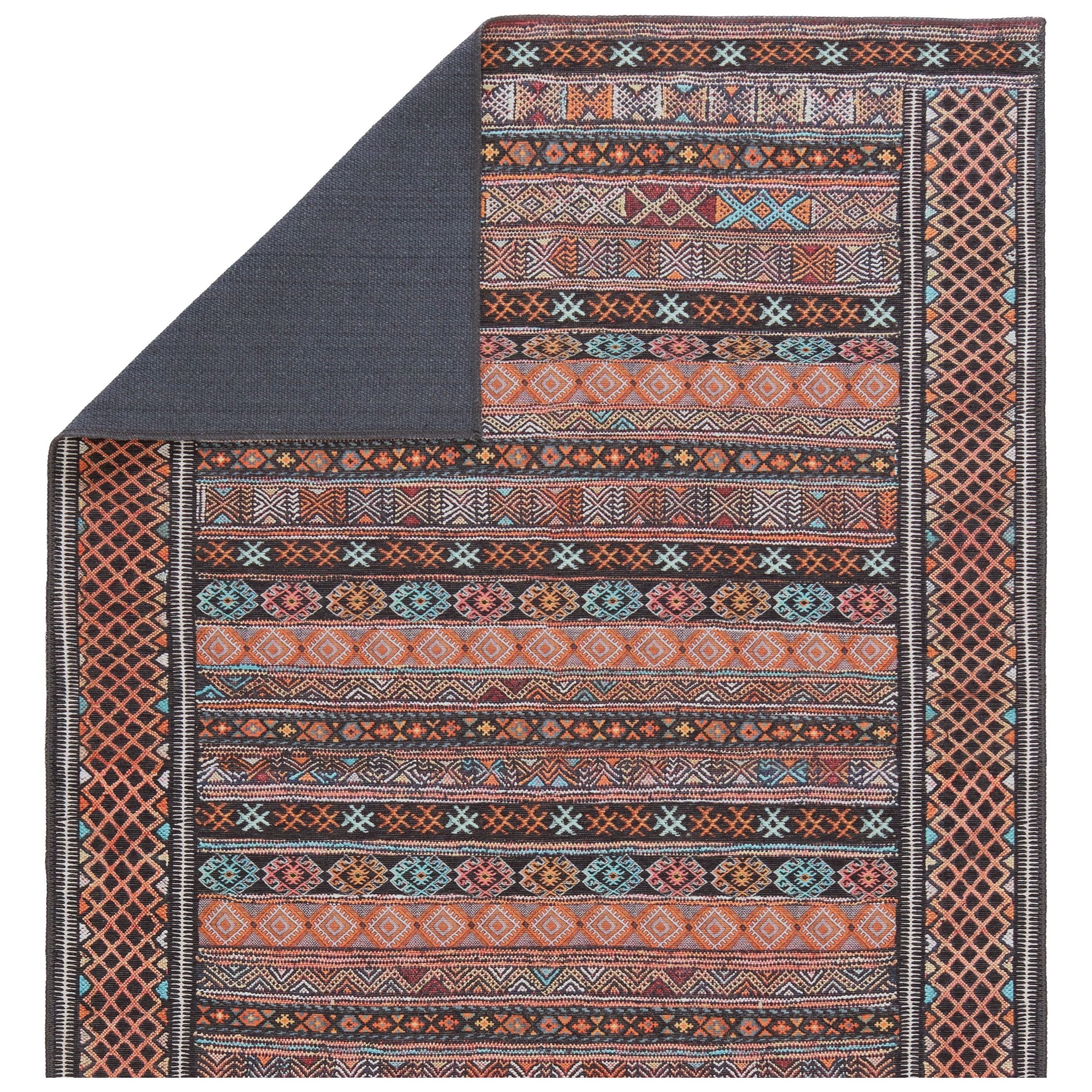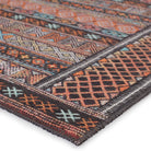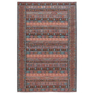 Harman HBL01 Auril area rug from the collaboration between Kate Lester and Jaipur Living. This collection draws inspiration from vintage designs, offering a blend of timeless elegance and modern style for your home decor. The Auril rug features a captivating tribal stripe motif in striking shades of terracotta, blue, pink, orange, and charcoal.