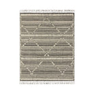 Iman Ima 01 Ivory Charcoal rug, a modern interpretation of traditional Moroccan design. Hand-knotted in India by skilled artisans using 100% wool pile, each rug in the Iman Collection showcases intricate linear and braided patterns for a unique textured look. The tonal variations add depth and character to every piece, making it a one-of-a-kind addition to your space. To top it off, each design is adorned with playful fringe for an extra touch of charm.