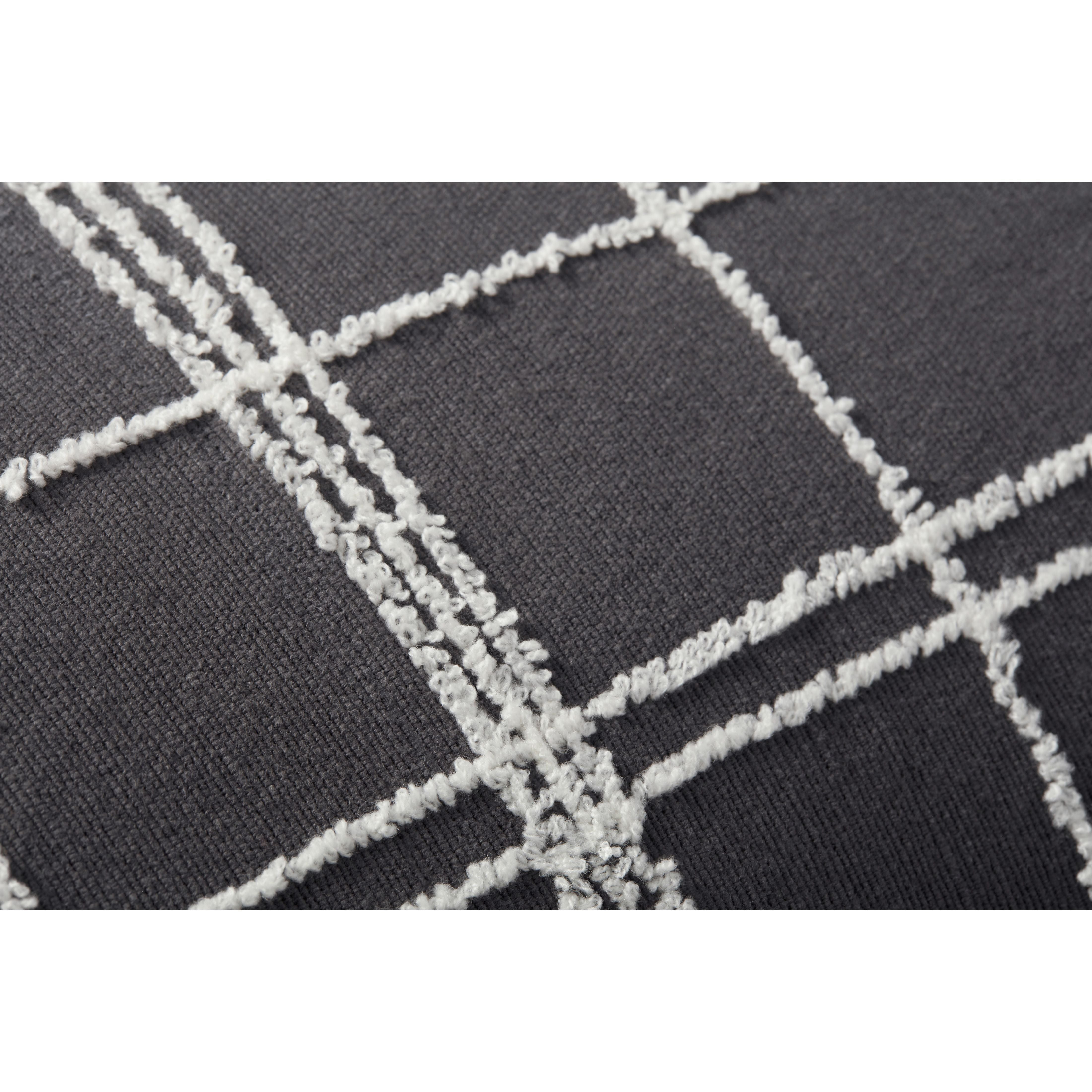 The Bernadette throw pillow is a bold, black lumbar cushion with a white windowpane check pattern that has a slightly asymmetrical, handmade look. Designed by Jean Stoffer x Loloi.