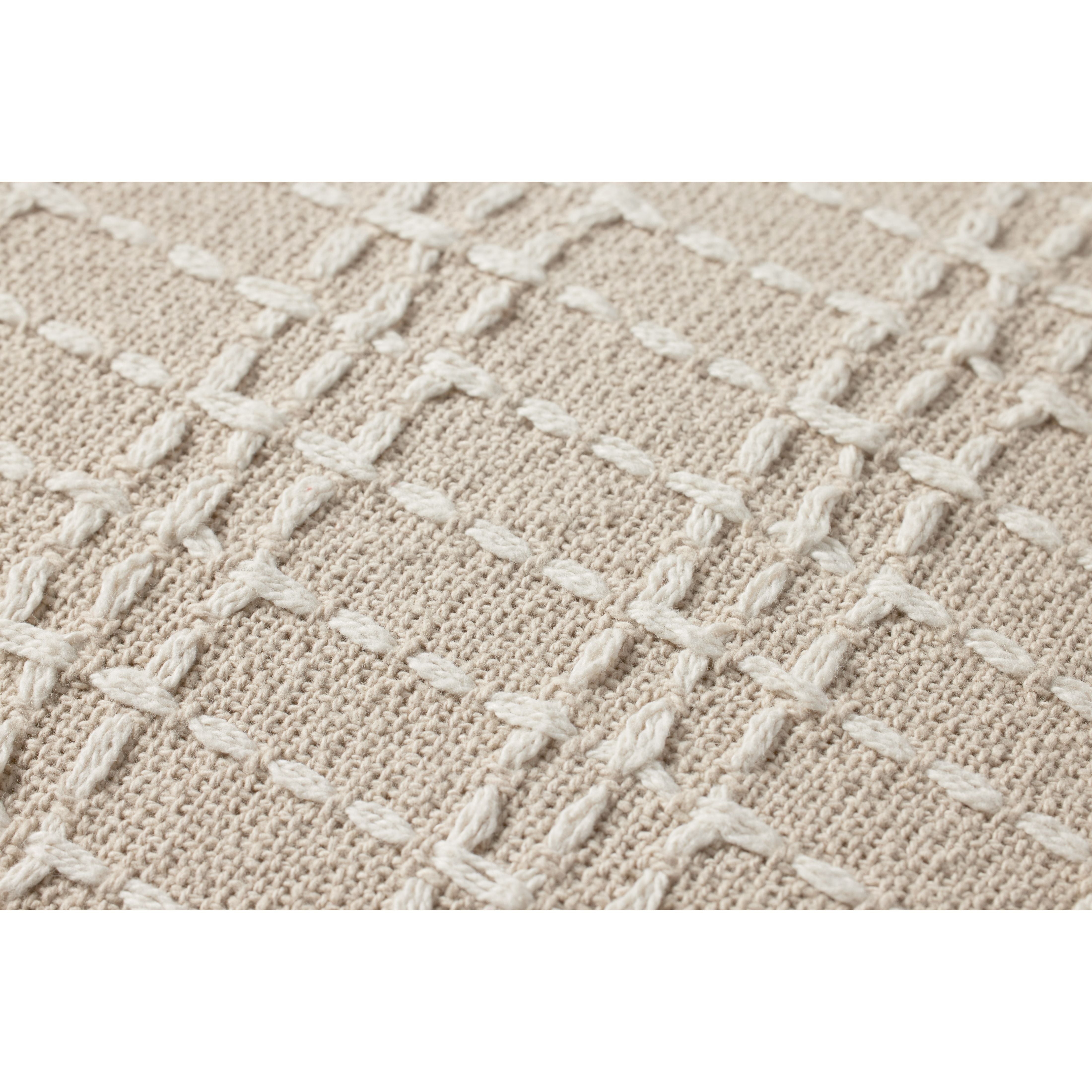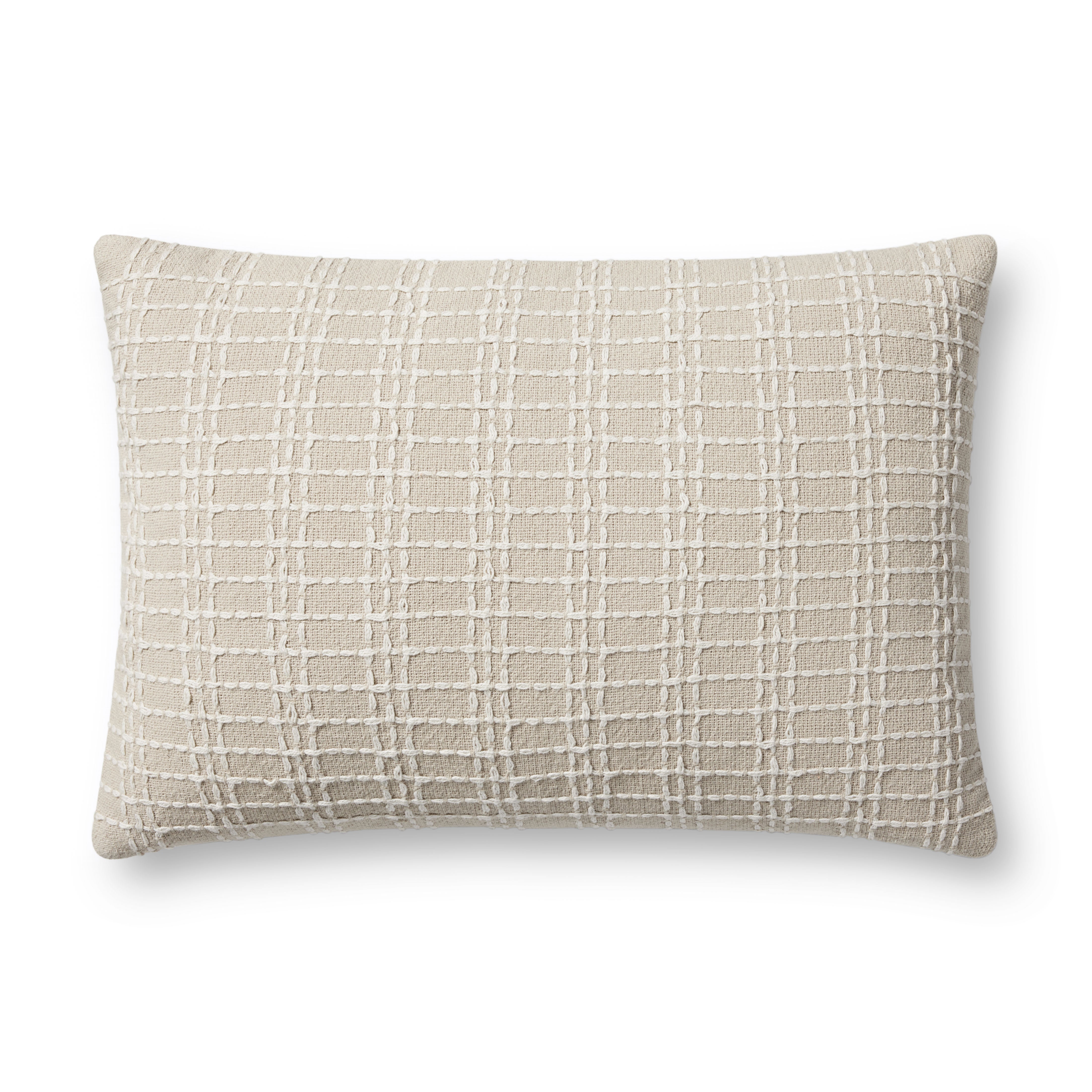 This beige and ivory throw pillow from Jean Stoffer x Loloi features a stitched gridded design for a hint of texture. The pillow cover is made of cotton and measures 16” x 26”, an inviting, larger size to style in living rooms and bedrooms.