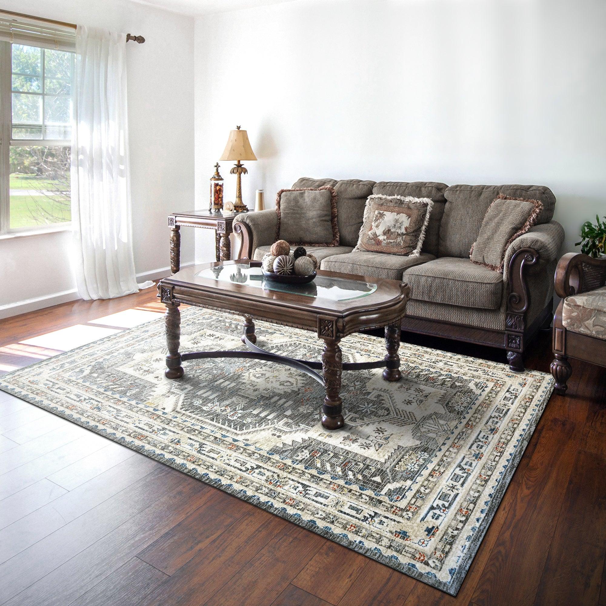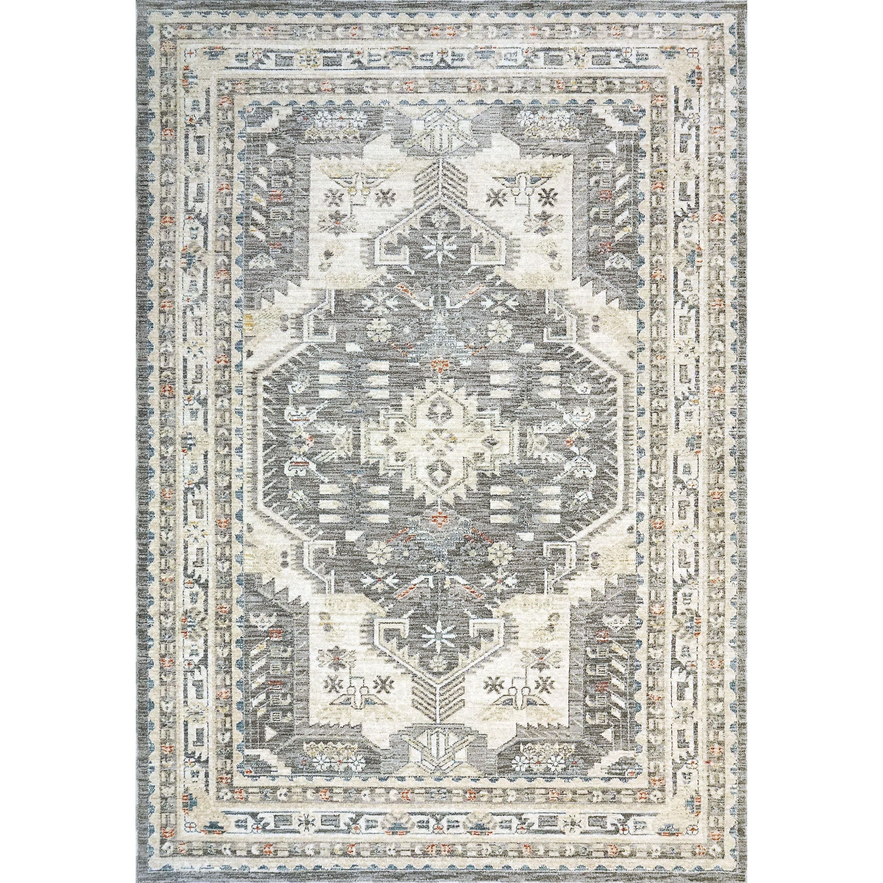 Jupiter 3104 Grey Multi rug, a fusion of classic Persian designs and modern elegance. Crafted with high-quality polyester, this rug offers durability and a luxurious softness underfoot. The innovative space-dying technique creates a seamless blend of colors, transitioning from soothing beige and grey tones to chic hues like copper and gold.