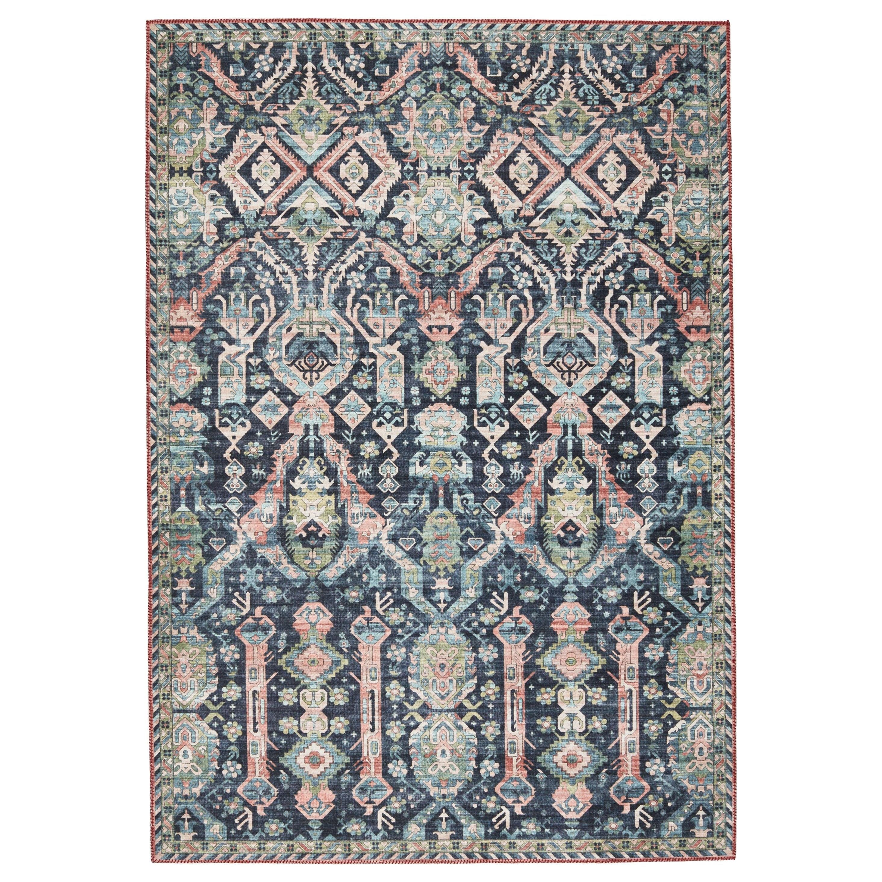 Keyara By Nikki Chu KNC06 Teleza, a stunning piece that seamlessly blends classic vintage aesthetics with a contemporary global flair. The Teleza rug from this collection is a visual masterpiece, boasting a rich tribal motif in deep blue, green, and clay hues. Its intricate border adds an extra touch of elegance to any space.