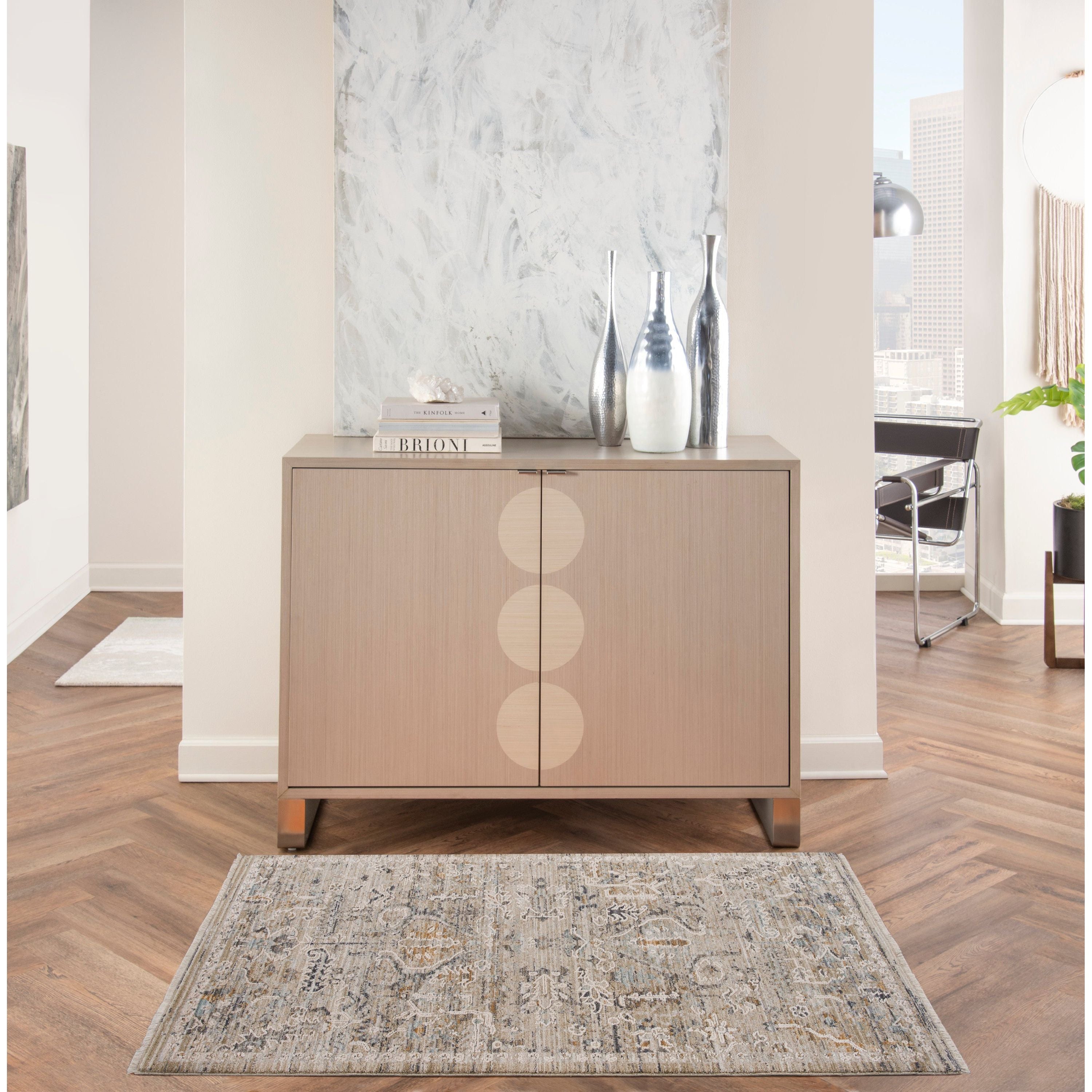 Lynx LNX02 Ivory Taupe, a captivating addition to your home decor. This area rug collection offers a modern twist on traditional Persian and tribal patterns, infusing your space with a touch of global charm. The intricate designs are enhanced by subtle raised accents, rich color combinations, and intentional distressing for a vintage look. Perfect for contemporary and boho-inspired interiors, the Lynx rugs feature short fringe at both ends and metallic serged edges for added elegance. Please keep in mind that runner sizes do not include fringe, making it easy to incorporate this stylish piece into any room seamlessly. Elevate your space with the unique beauty of the Lynx LNX02 Ivory Taupe rug today!