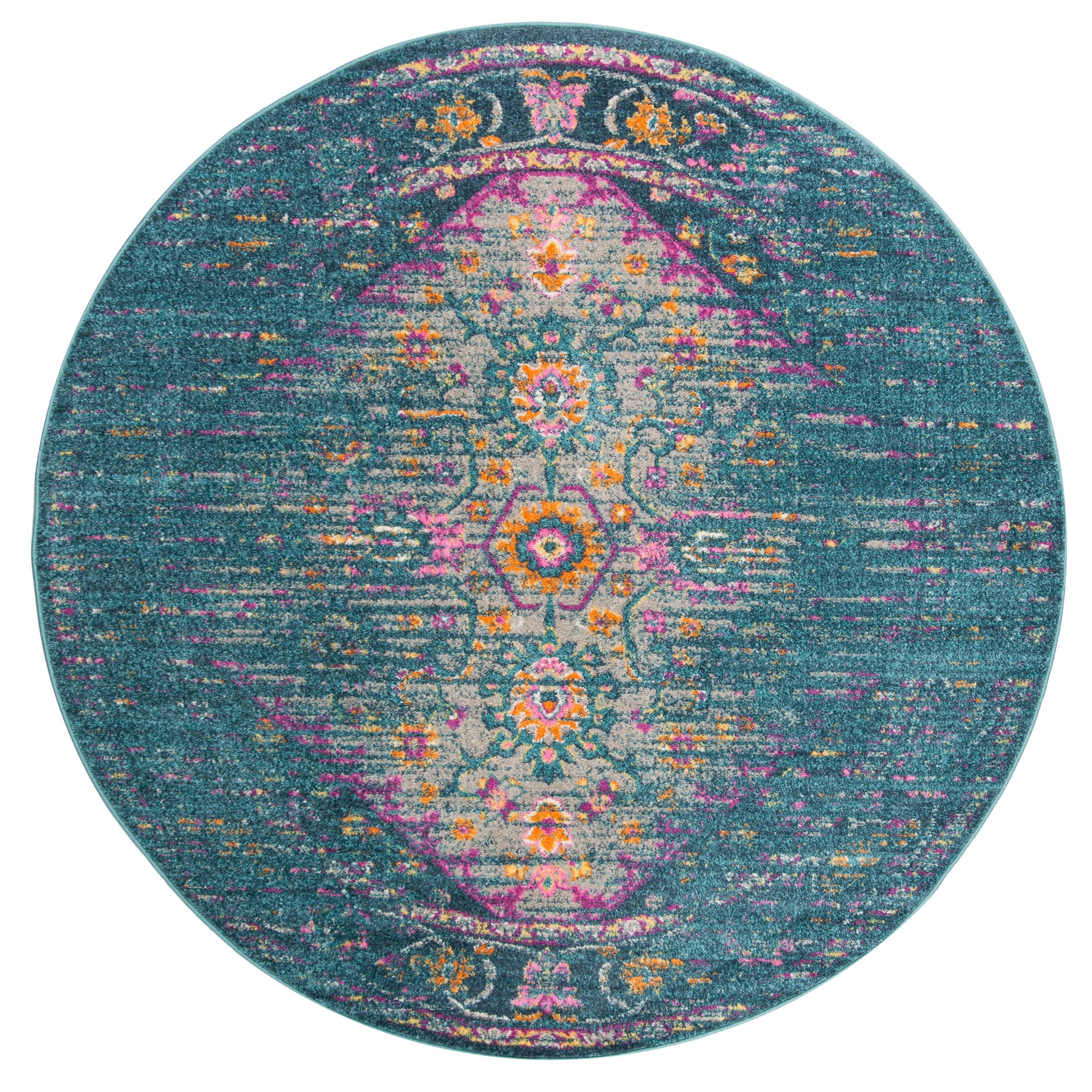 Madison MAD122C Blue Fuchsia area rug, a perfect blend of classic rug design and modern flair. This transitional floor covering features a stunning array of floral medallions in a captivating mix of blue and orange gradients. The intricate patterns lend a touch of vintage charm, creating an elegant and timeless look for any room.