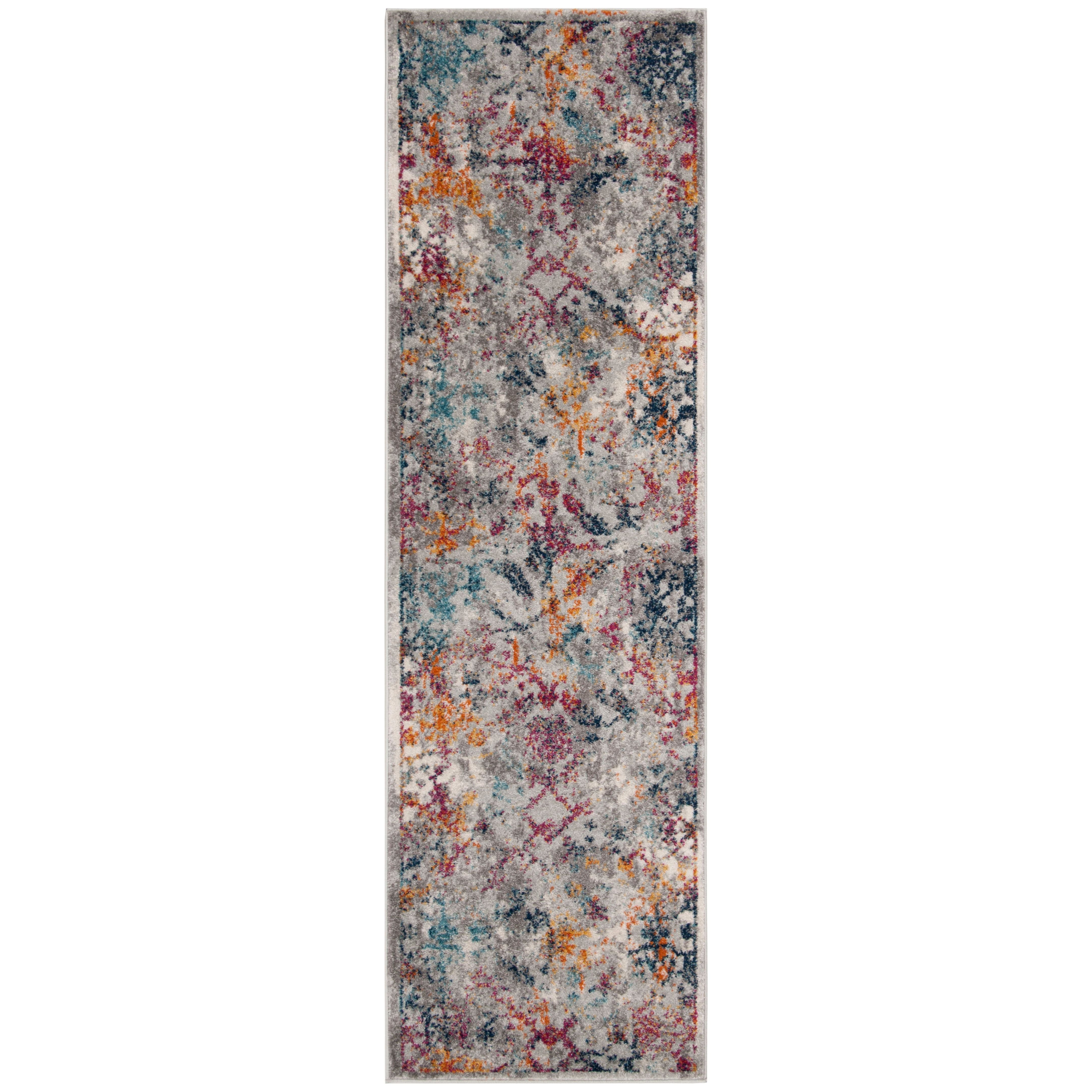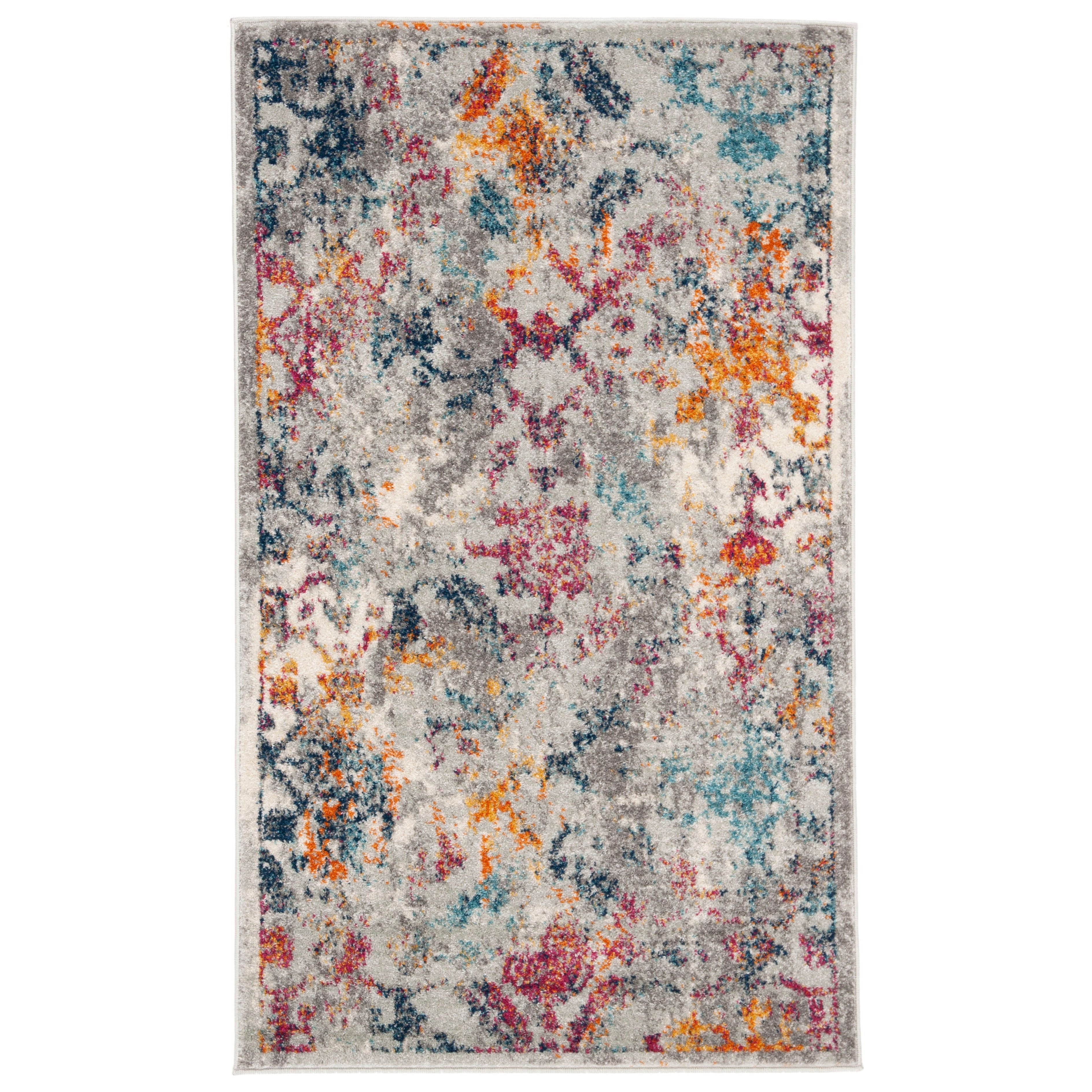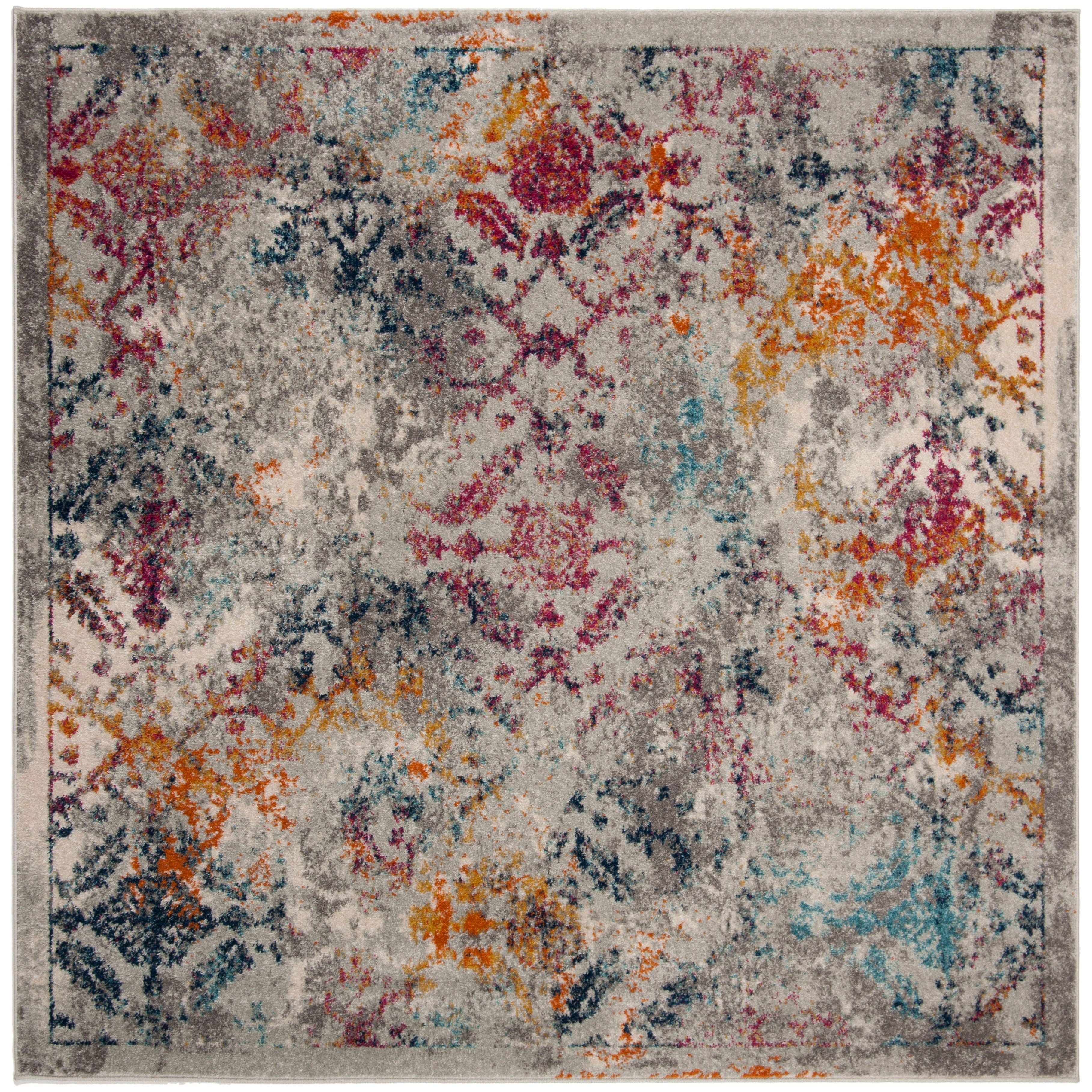 Madison MAD159R Light Grey Fuchsia area rug, a blend of classic elegance and modern flair. This transitional floor covering features a stunning array of floral medallions in captivating shades of blue and orange, creating a beautifully distressed heirloom aesthetic. Crafted with luxurious synthetic yarns, this rug boasts a shimmering finish that exudes lasting beauty.