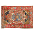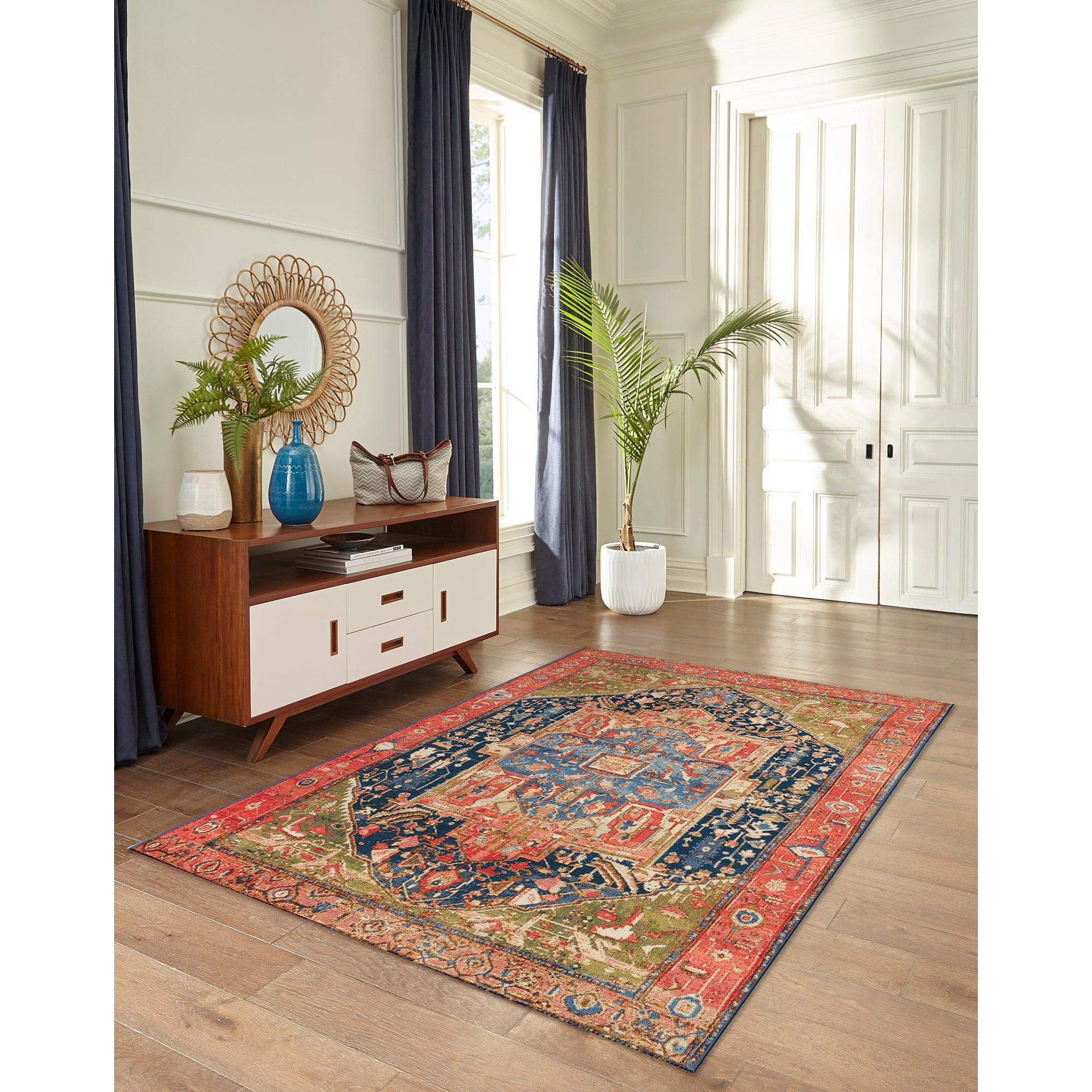 Marina Heriz Red area rug, a contemporary twist on the classic medallion design that adds a touch of tradition to any space. Featuring layers of salmon pink, gold, and navy backgrounds with intricate shapes in contrasting colors, this rug exudes a well-loved charm. Whether used indoors or outdoors, this rug instantly infuses warmth and texture into your decor.