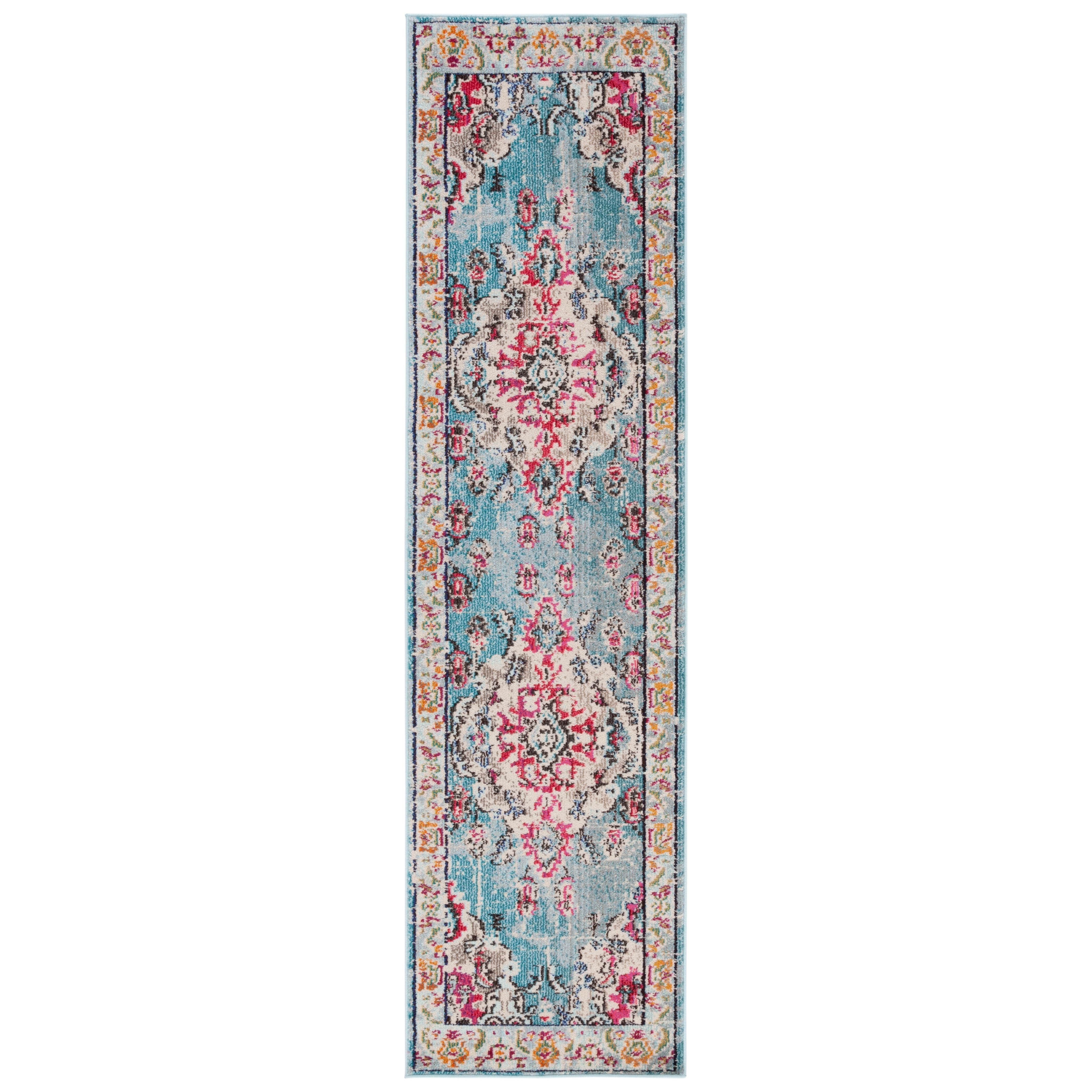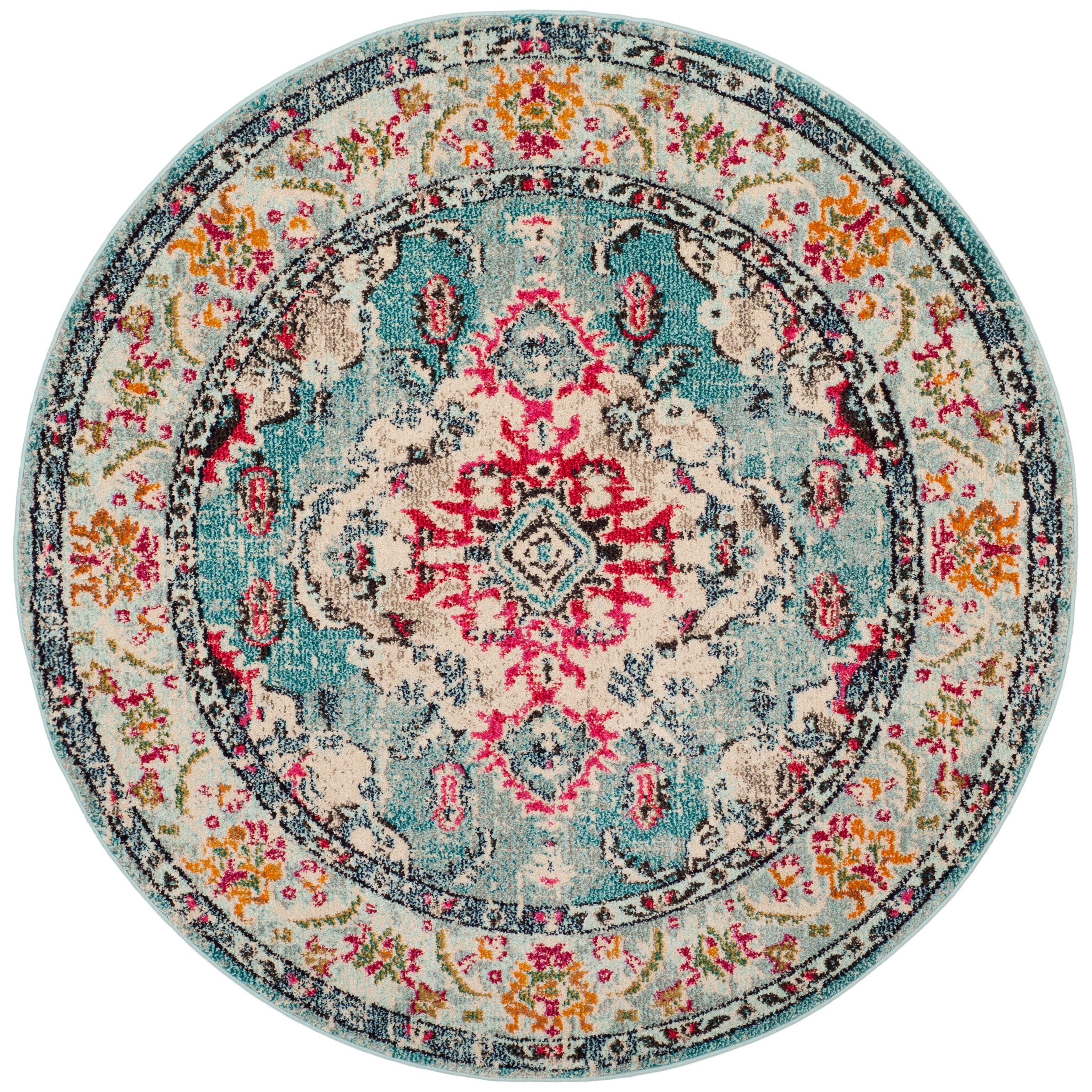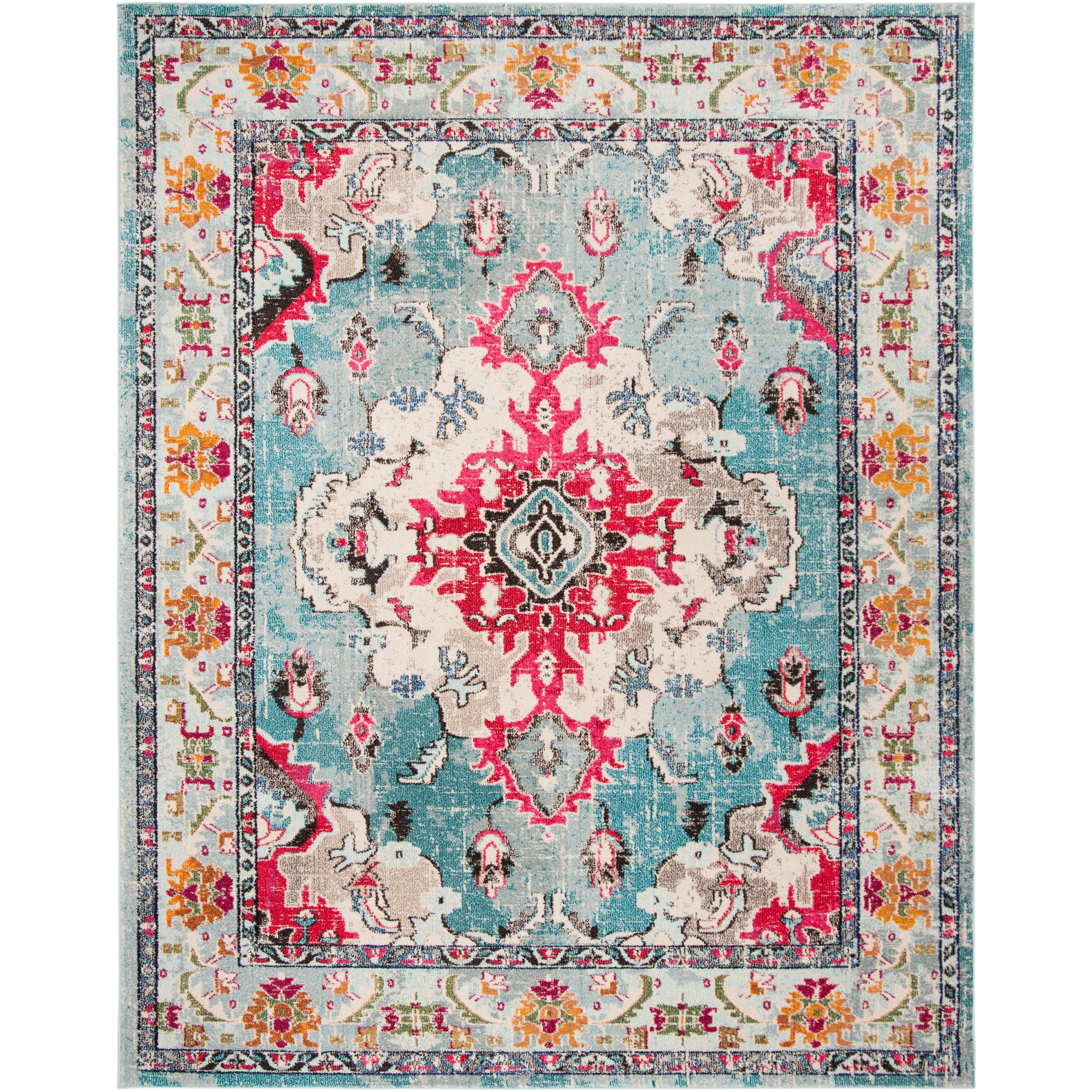 Monaco MNC243J Light Blue Fuchsia area rug from the Monaco Collection, designed to bring a contemporary twist to traditional patterns. This rug showcases a stunning distressed erased-weave and medallion motif, adding a chic bohemian flair to any space. With its easy-care properties and minimal shedding, it's both stylish and practical. Measuring approximately 0.5 inches thick, this rug is sure to make a statement in your home.