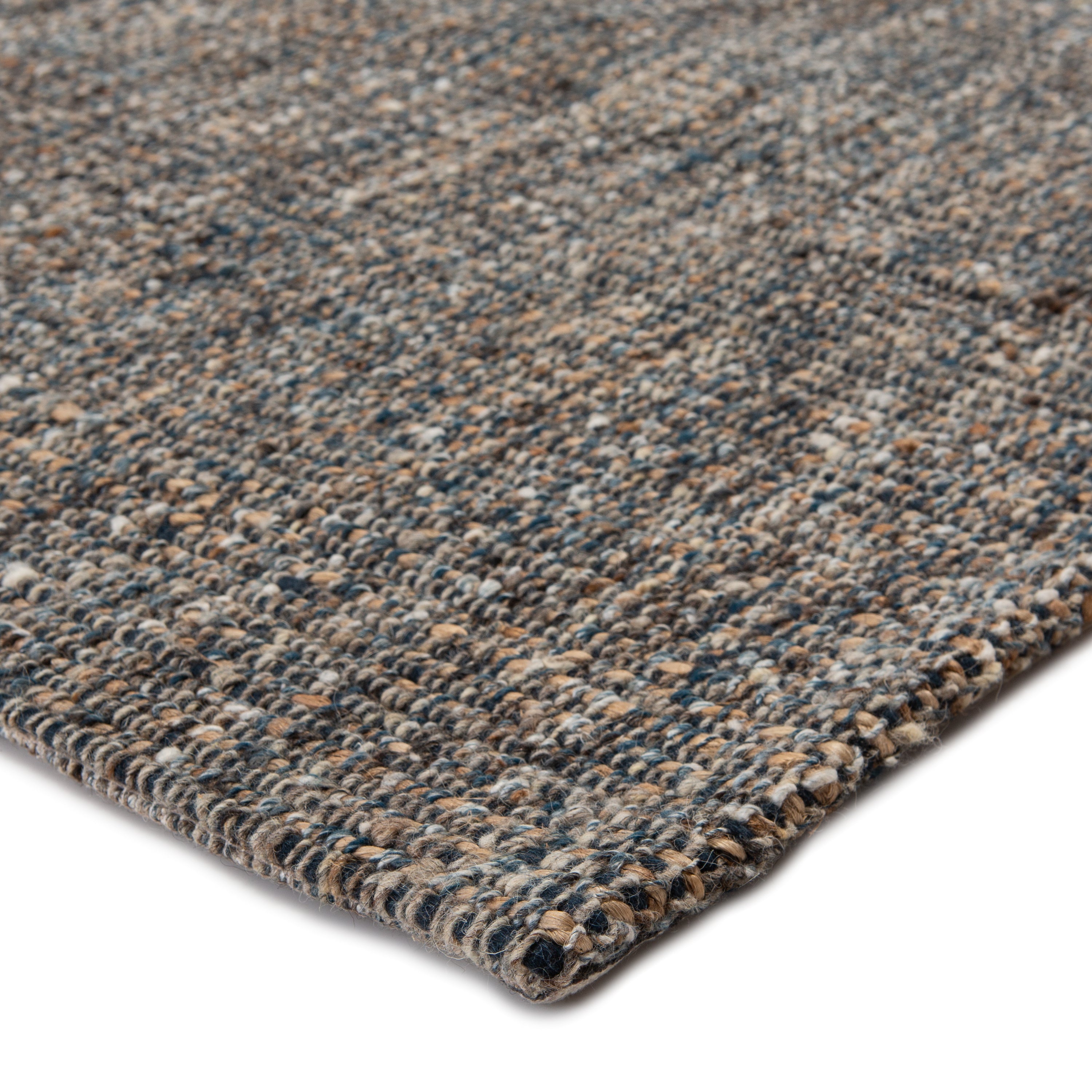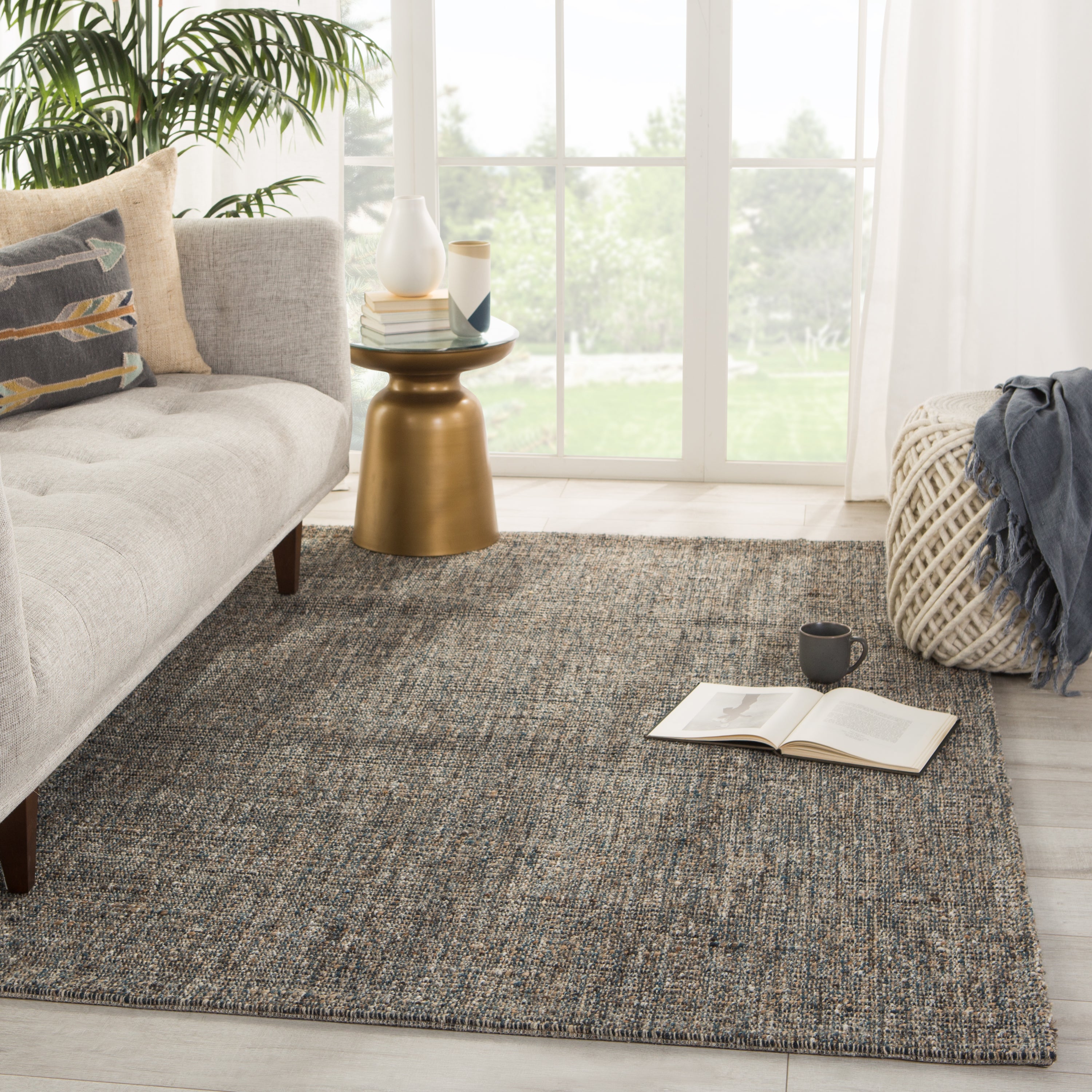Monterey MOY02 Sutton area rug, a luxurious addition to your home decor. This exquisite piece from the Monterey collection combines natural grass fibers with soft yarns for a touch of elegance. Handwoven with a mix of jute, wool, polyester, and viscose, the Sutton rug features a sophisticated heathered design in shades of gray, tan, and blue.