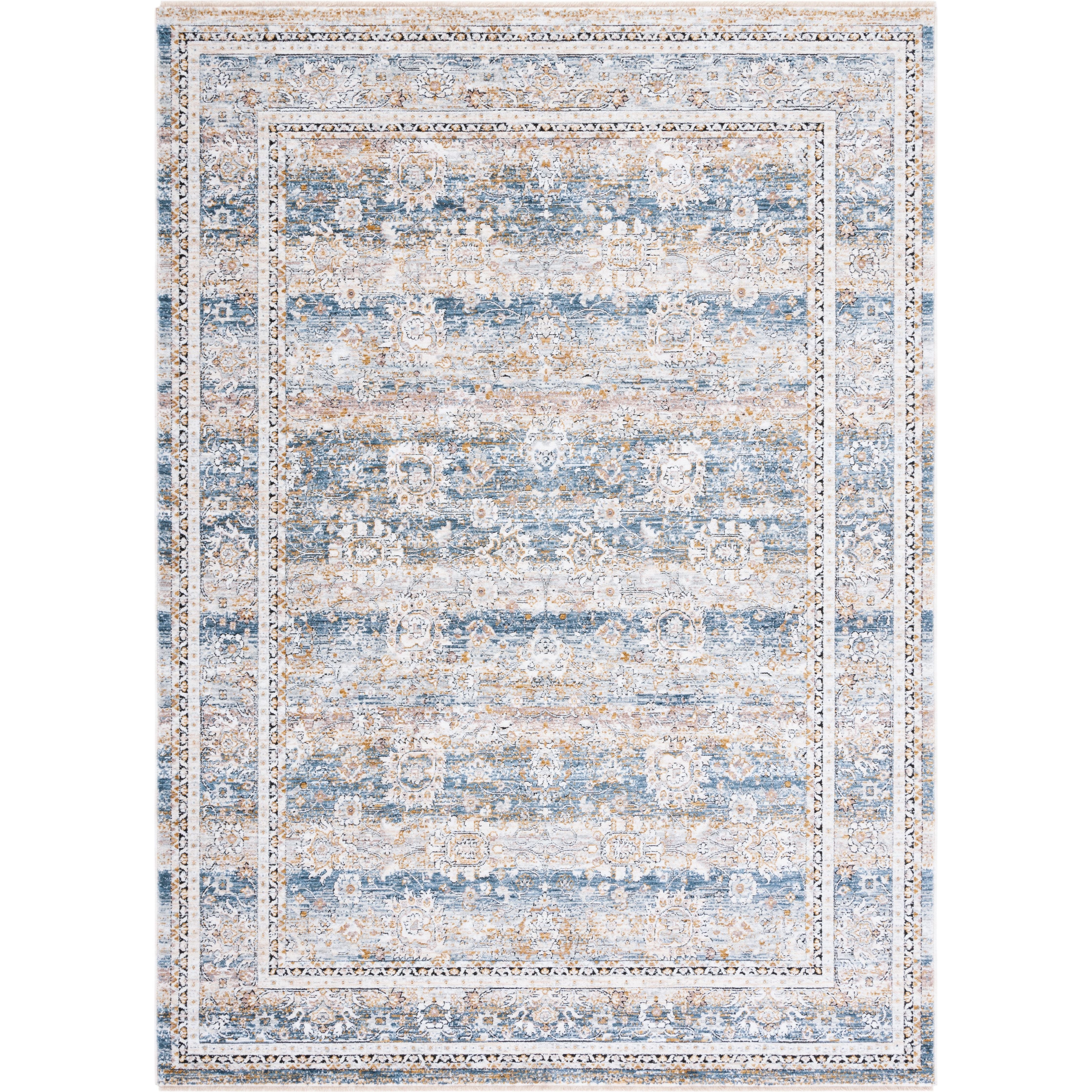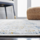Moondust MND658M, a serene addition to SAFAVIEH's Moon Dust collection of area rugs. These rugs feature tranquil color palettes and silky smooth sheens, drawing inspiration from traditional oriental patterns with defined borders and fringed edges. The distressed timeworn appearance adds character to any space. Crafted expertly using premium viscose and polyester fibers, these rugs have a sleek pile height that allows for easy placement under furniture, with an approximate thickness of 0.25 inches.