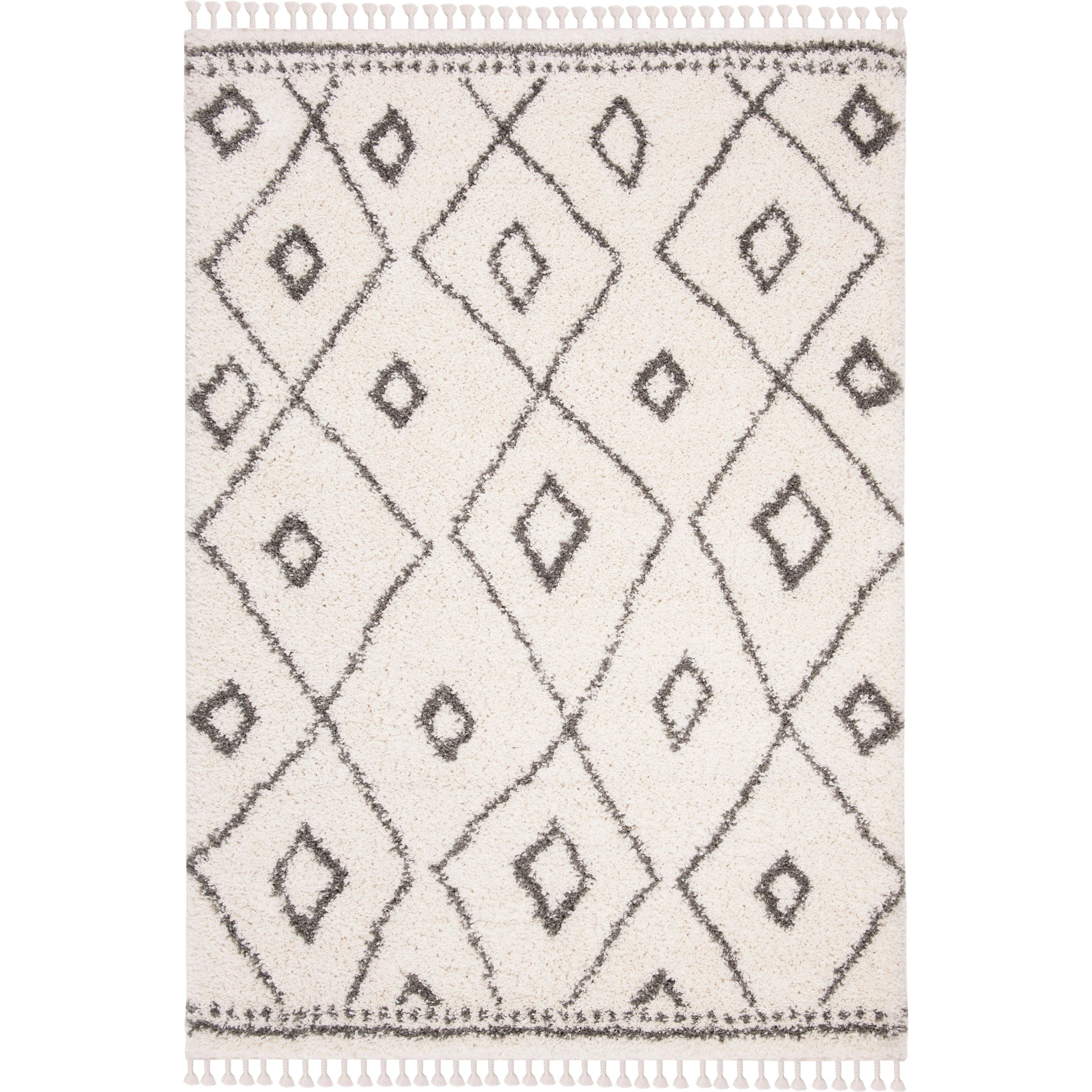Moroccan Fringe Shag 300 MFG333A Ivory Grey, a luxurious addition to your home decor. This collection showcases tribal-inspired designs on plush shag rugs, perfect for modern, country-chic, or casual settings. Crafted with supple synthetic yarns, these rugs offer exceptional comfort and lasting beauty with an approximate thickness of 2 inches.