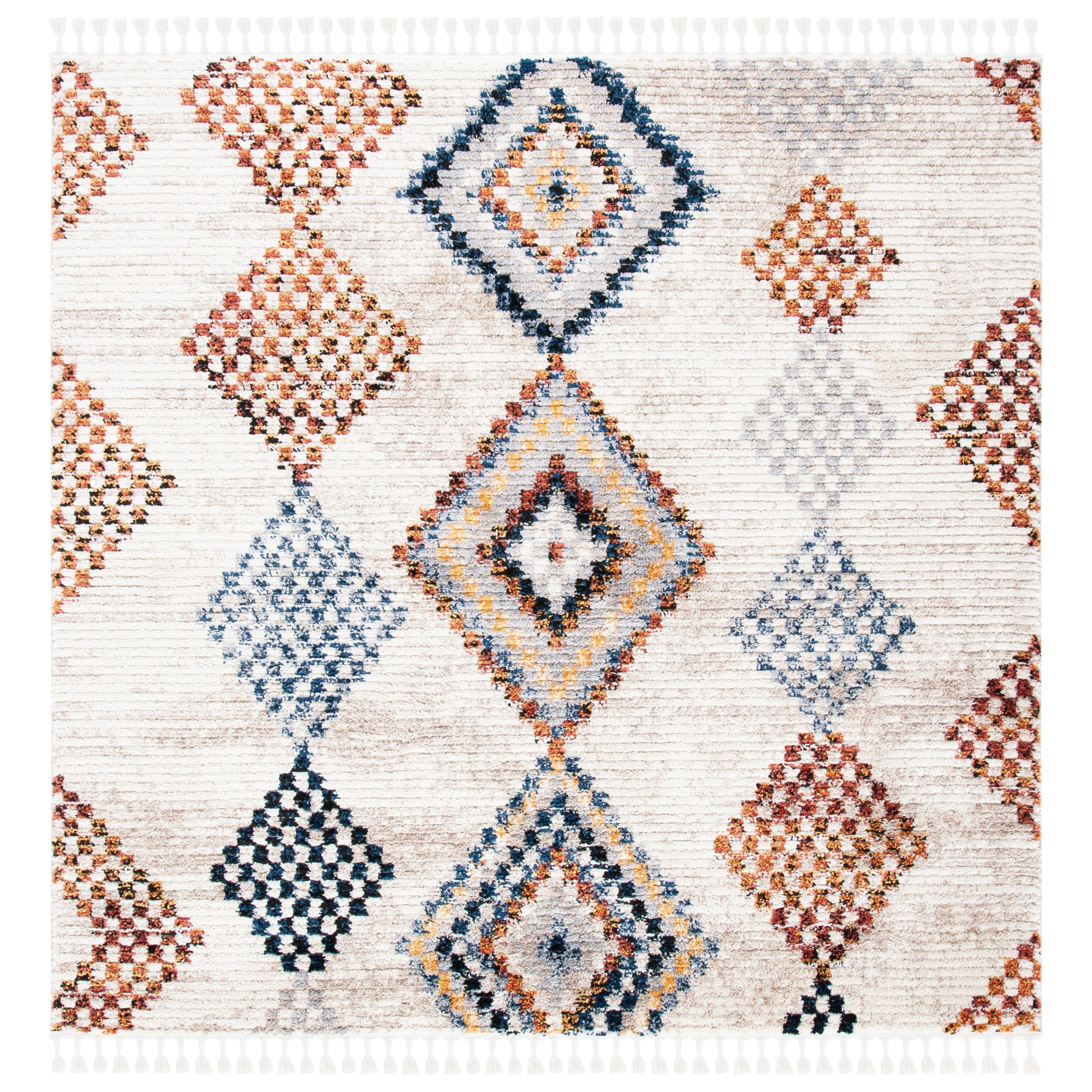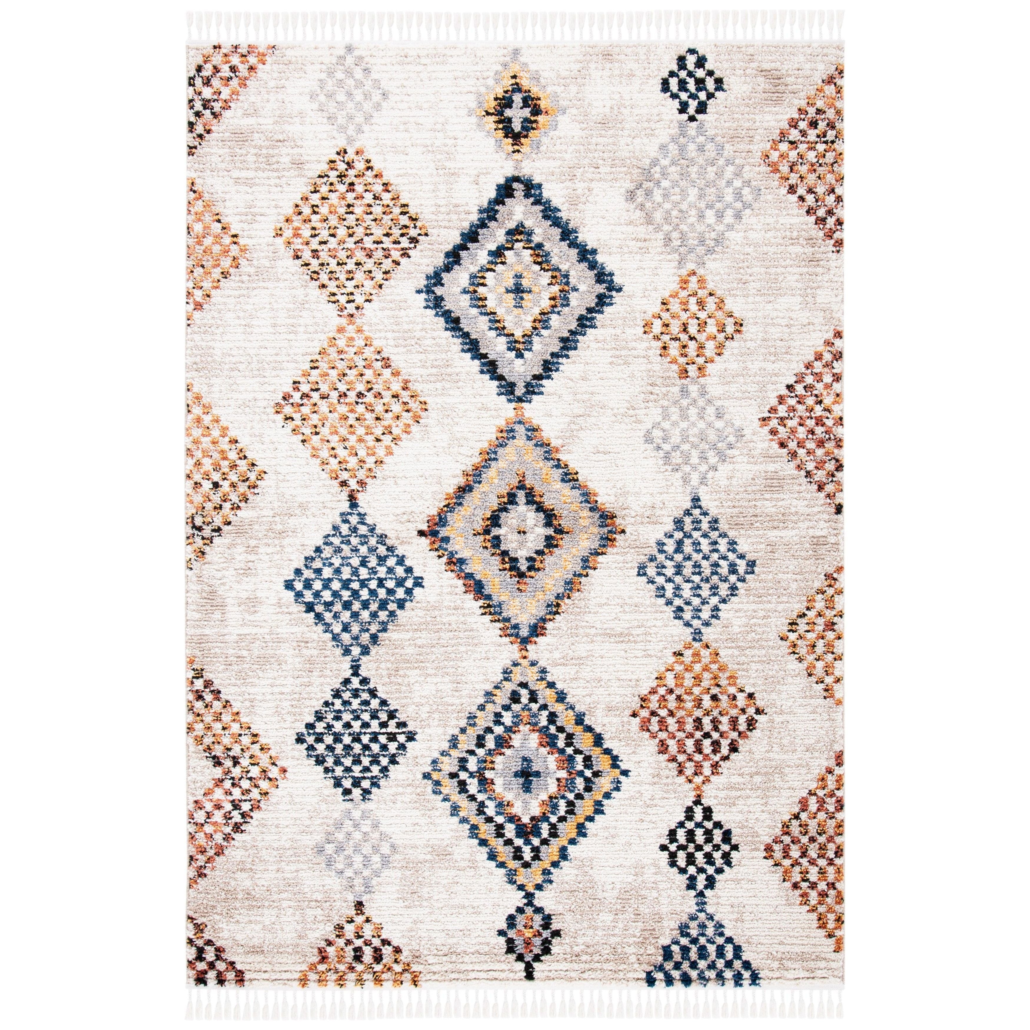 Elevate your home decor with the Morocco MRC860F area rug from SAFAVIEH's exquisite Morocco Collection. Featuring eye-catching diamond motifs in various colors and charming tassels for a bohemian chic look, this rug is sure to make a stylish statement in any room. Crafted from premium synthetic fibers with a plush pile, it offers both durability and luxurious softness for ultimate comfort.