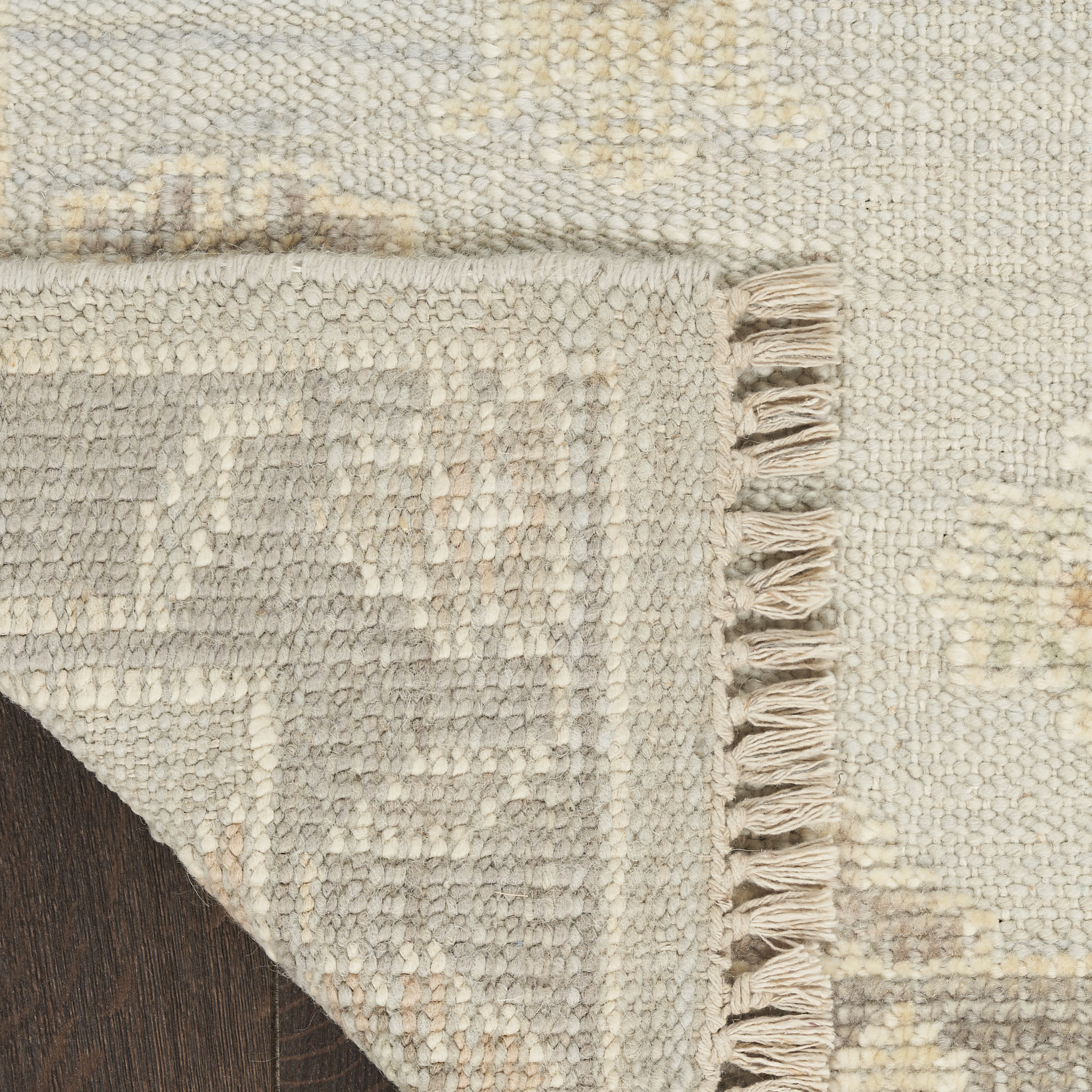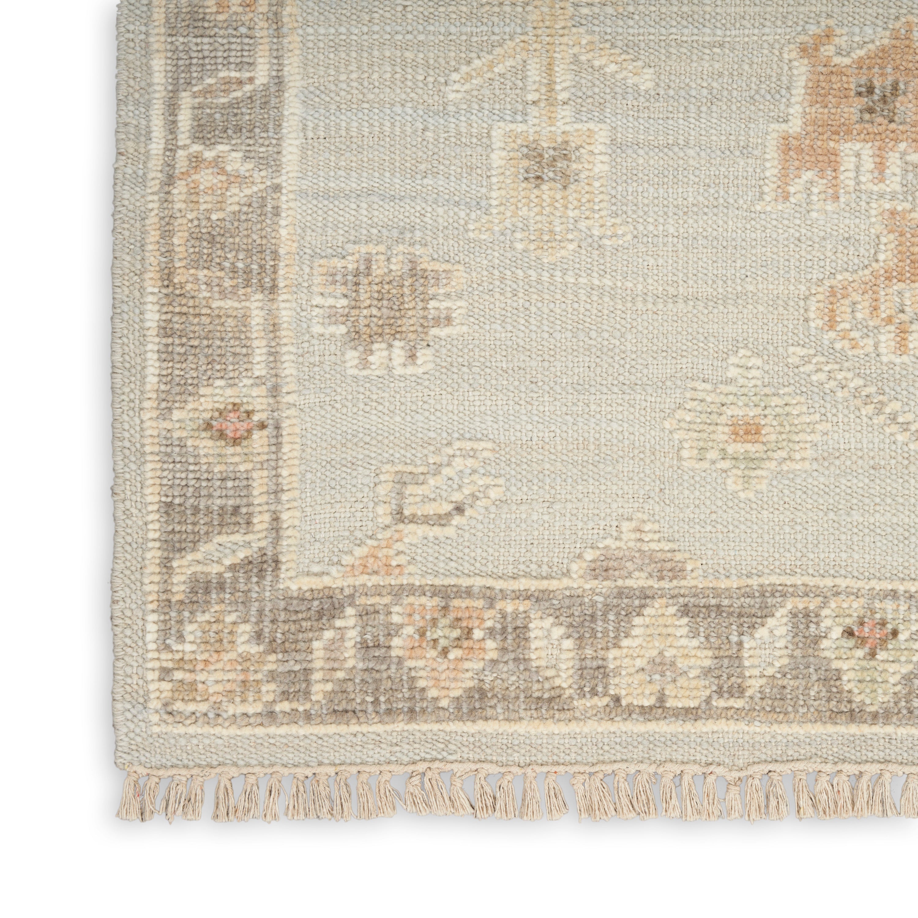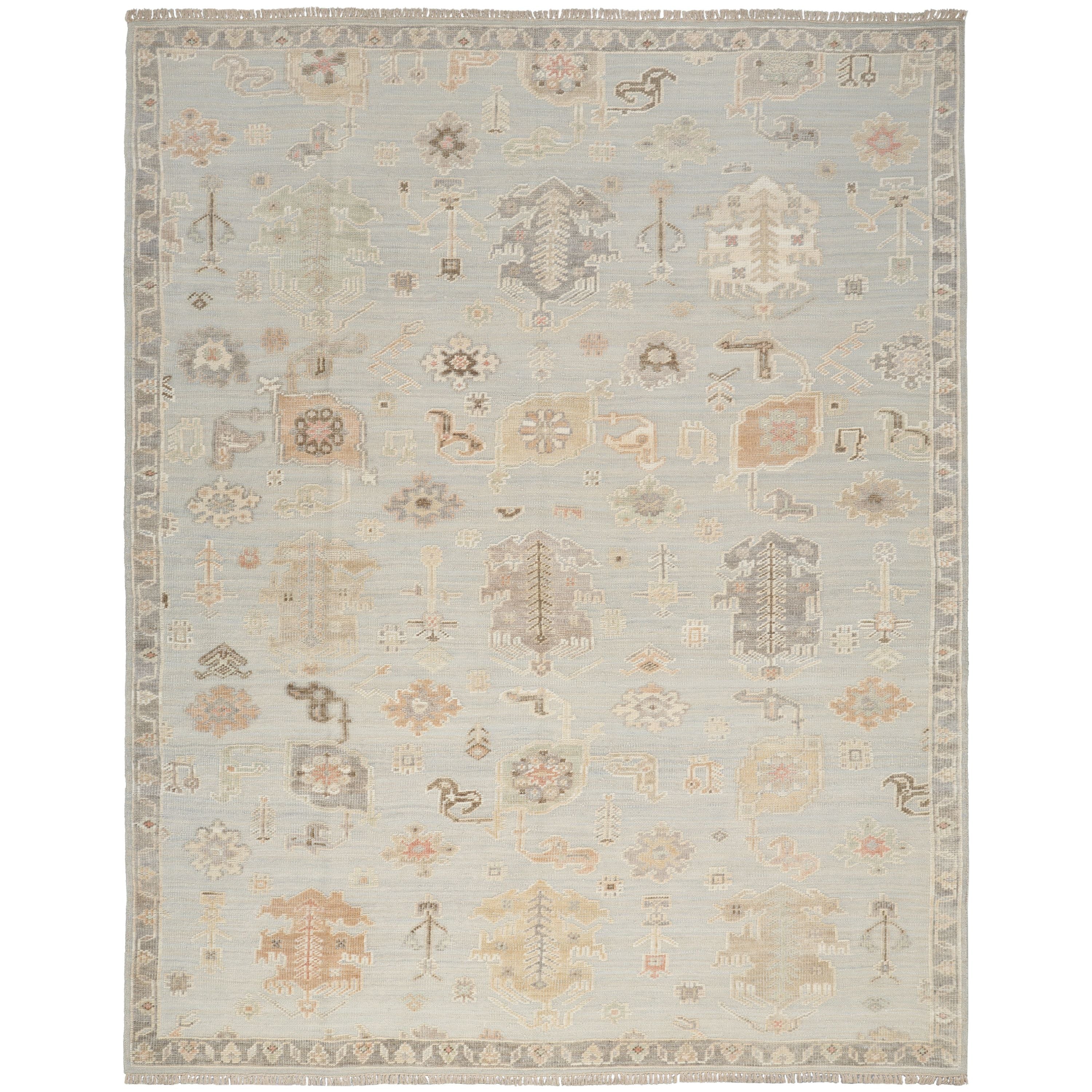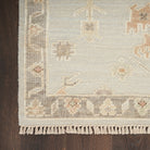 Invite instant personality to your living room or bedroom with this vintage-inspired rug from the Whispers Collection. The light blue ground is adorned with classic Persian motifs framed by a matching grey border, which is finished at each end with short fringe. Hand-knotted for lasting style.