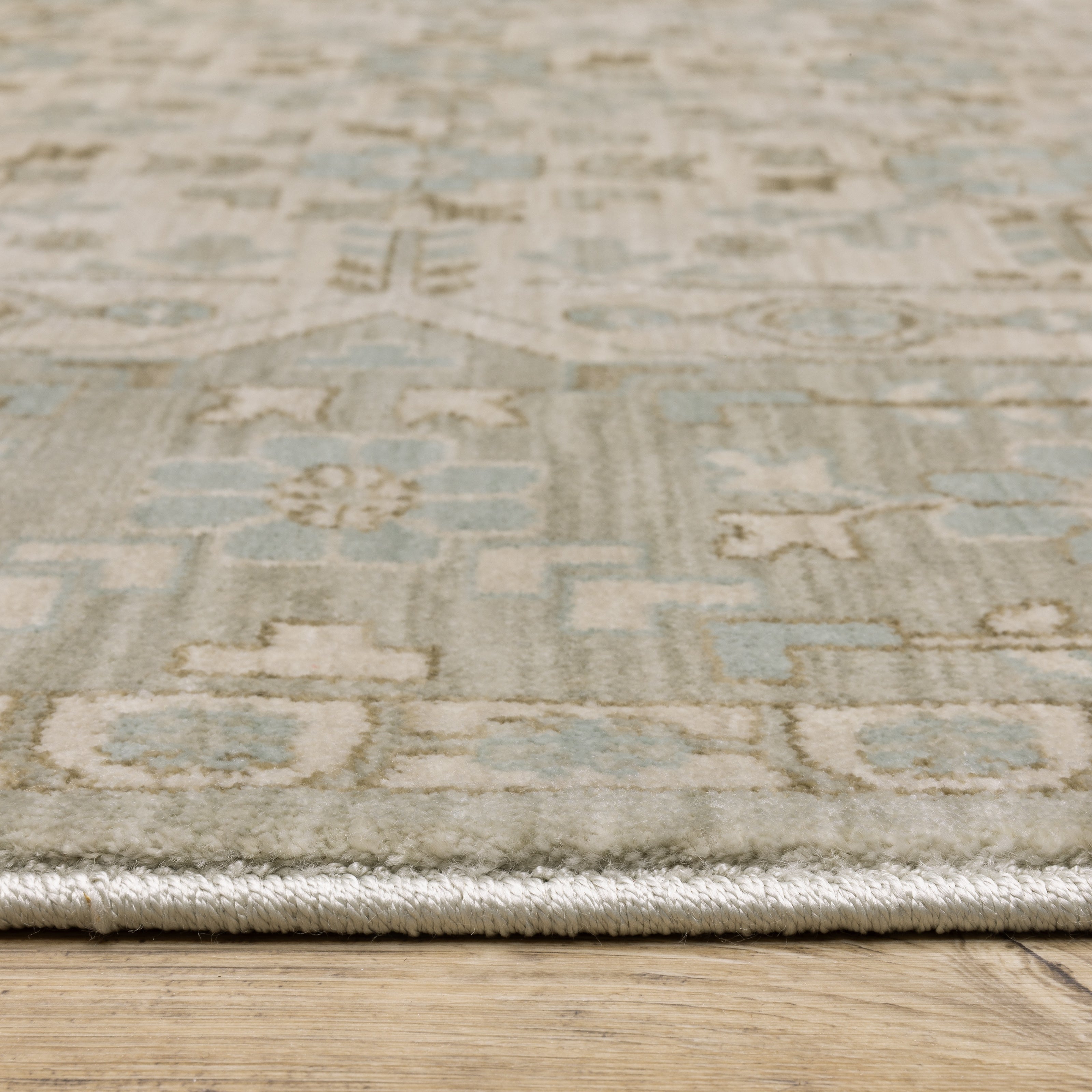 The Maeve collection features subtly pigmented color palette features neutral tones of ash brown, oat milk and sustained gray as well as mineral-based blues, matcha green, sunbaked clay and antique gold. The quietly modern color palette gives fresh appeal to traditional Persian and block print patterns with a touch of bohemian flair. It is power-loomed of super-soft, space-dyed polypropylene.