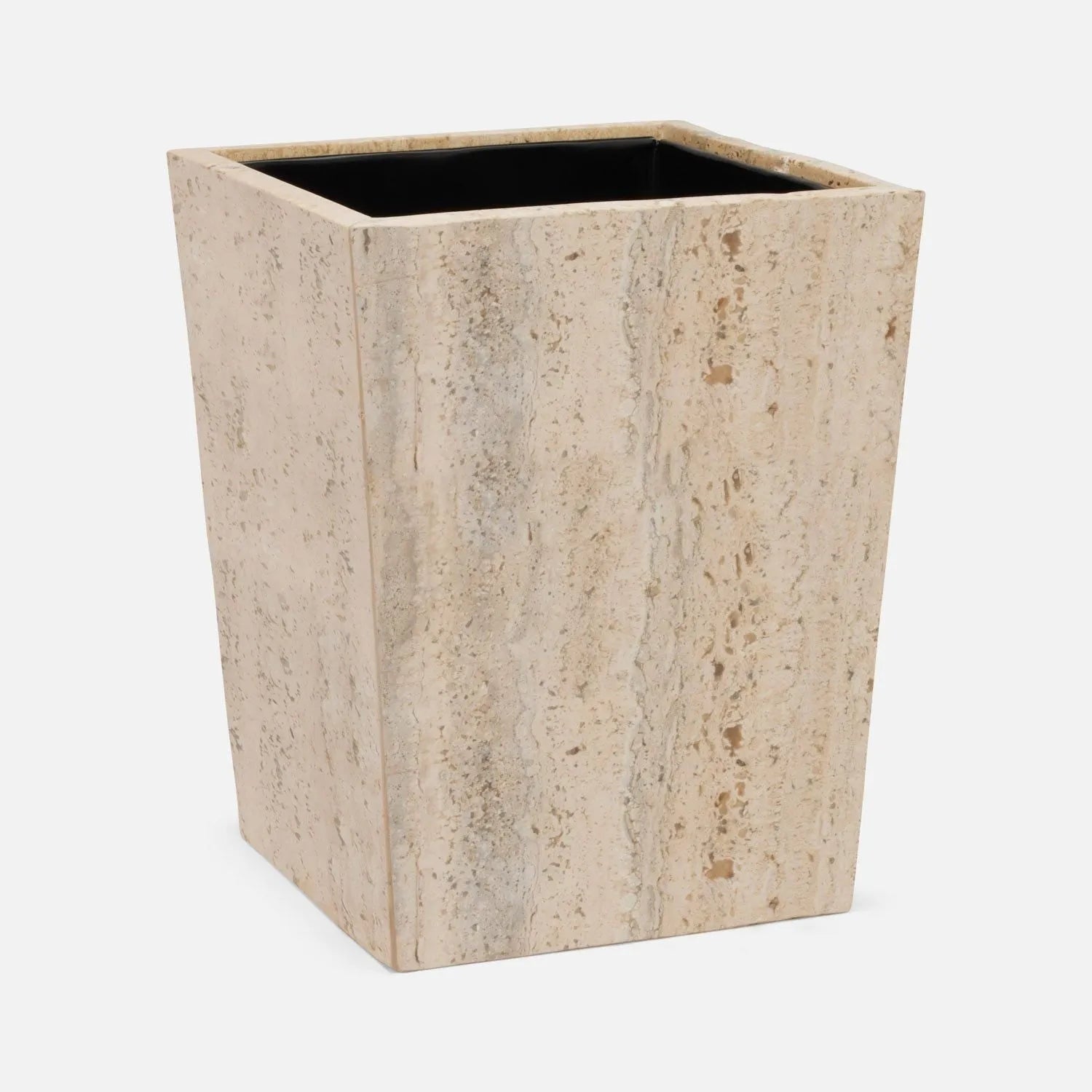 The stone Bowen bath collection celebrates the natural grain and porous texture of travertine material. The stone is filled with Clear resin for a smooth finish.