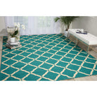 Portico POR01 Aqua, a timeless addition to any space. This elegant broadloom features a classic latticework pattern that exudes traditional sophistication and purity of design. The open work grid in a neutral tone beautifully complements the richly pigmented colors of this versatile collection.