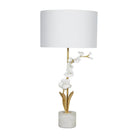 Experience timeless elegance with the Thylane Buffet Lamp, where eternal beauty meets exquisite craftsmanship. Resting upon a solid alabaster base, the lamp features a body inspired by an orchid in full bloom. Delicate porcelain blossoms and buds, along with stamped metal leaves finished in gold leaf, create a harmonious blend of grace and sophistication. The Thylane Buffet Lamp adds a touch of refined luxury to any space, capturing the essence of perennial beauty.