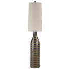 Texture and light blend beautifully in the Crake floor lamp. Perfect for adding a finishing touch to any space, it features a long and lean textured body with a handsome dark brown finish, that's topped off with a clean-lined oatmeal linen drum shade. Whether used as a bedroom lamp, living room lamp or dining room lamp, its dimmer foot switch allows for lighting customization to suit the mood, delivering instant ambiance.